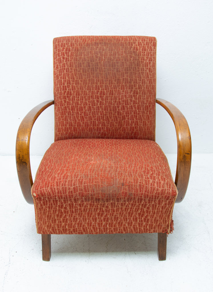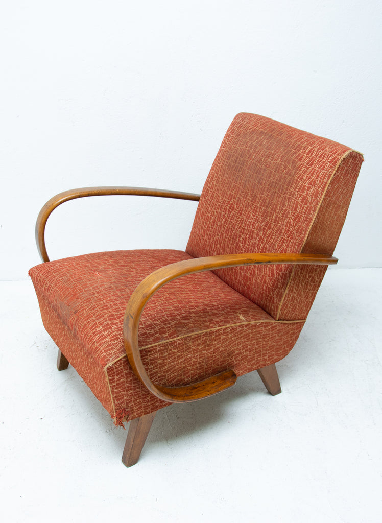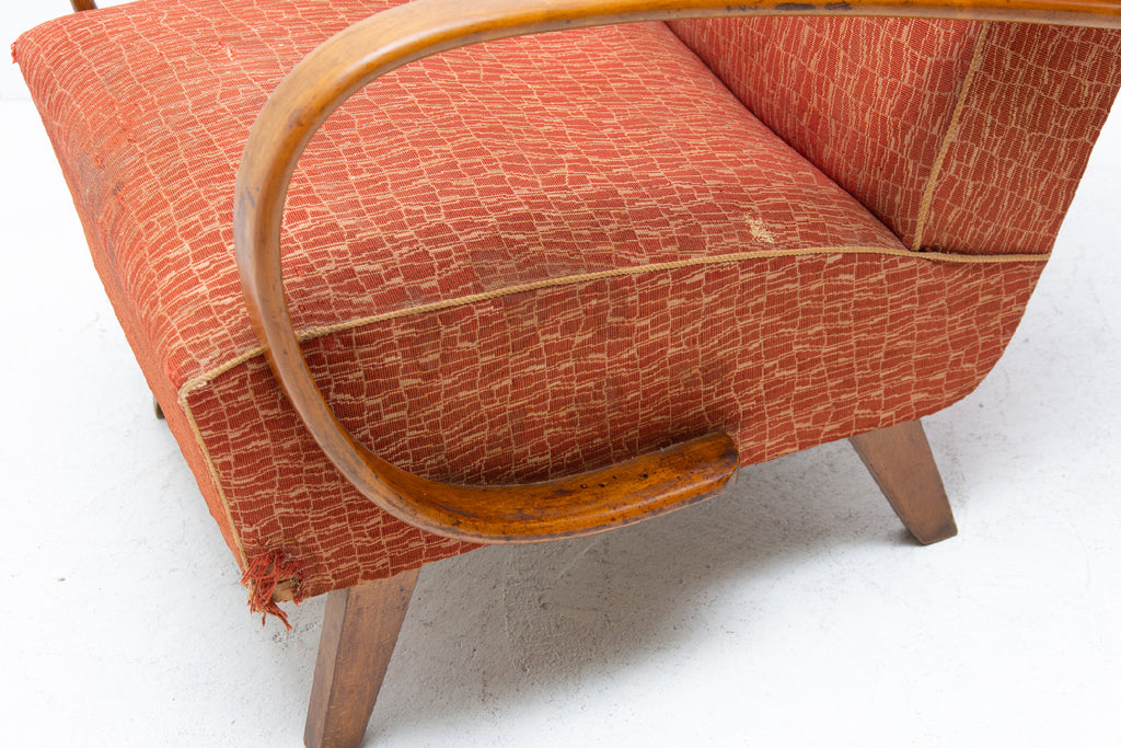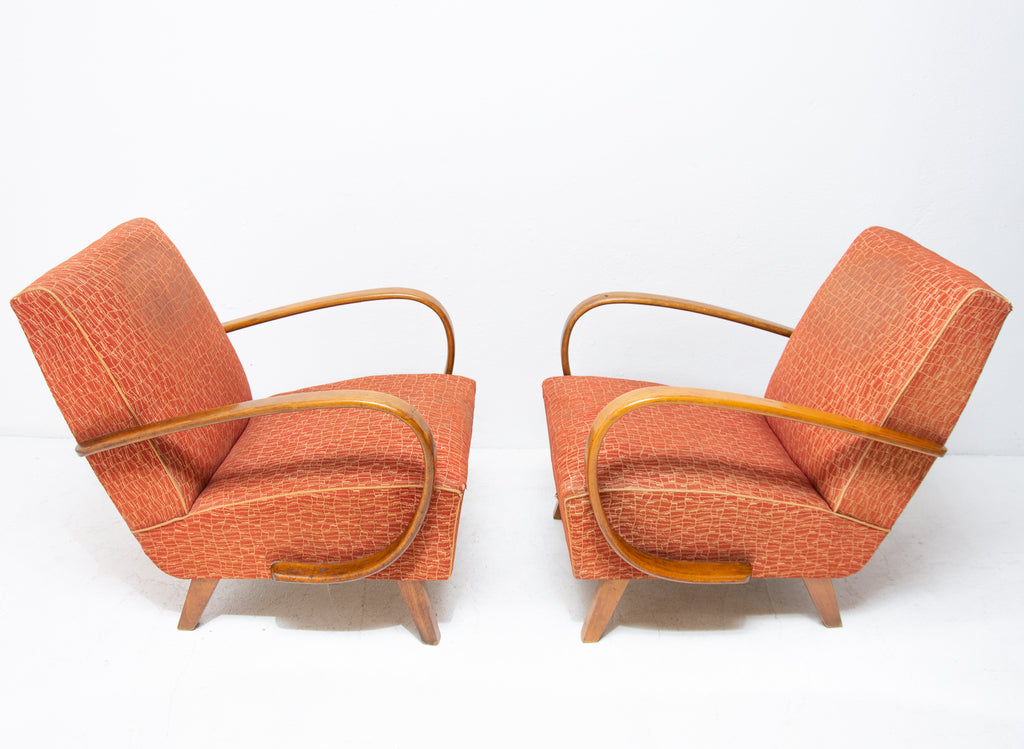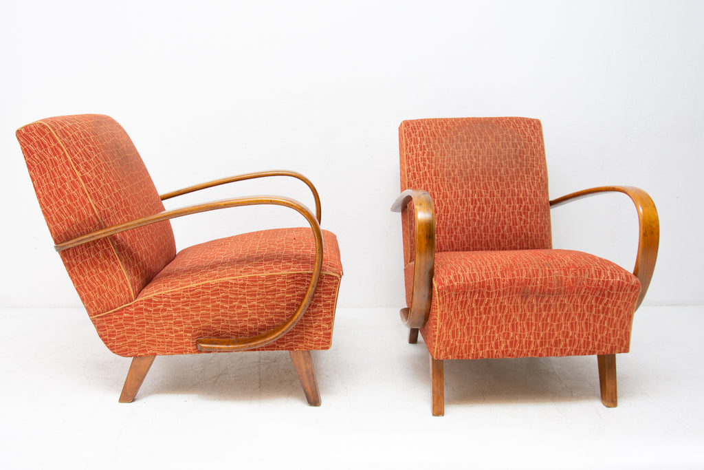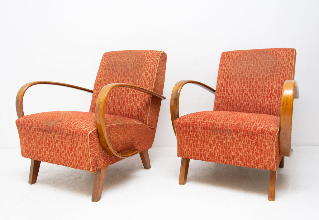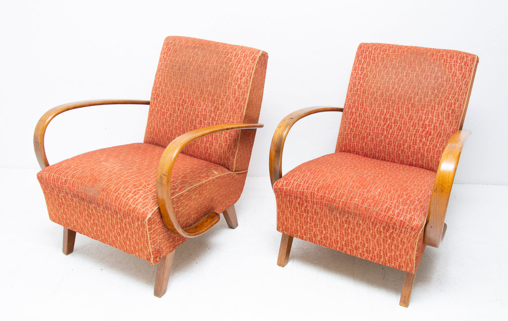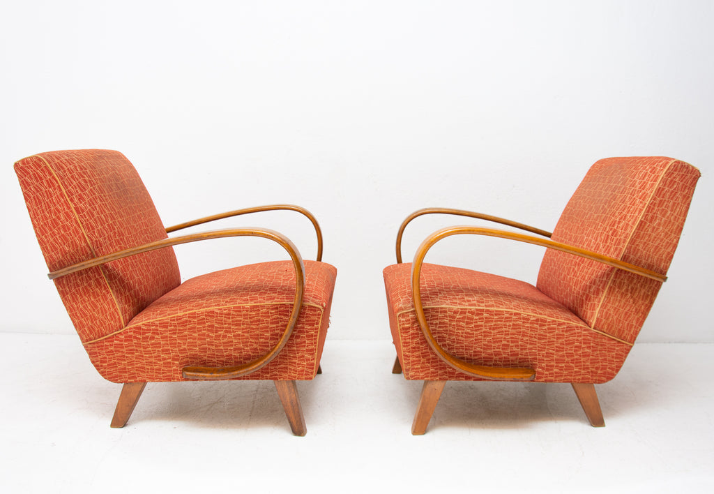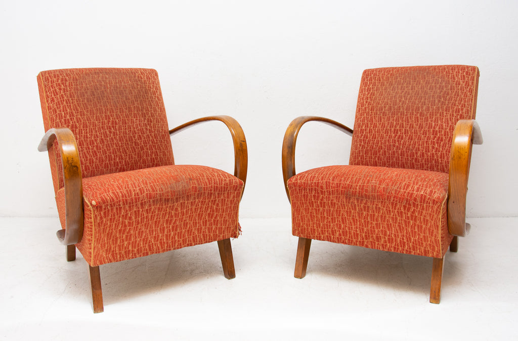 This pair of bentwood armchairs "C" was designed by Jindřich Halabala and were produced by UP Závody in the 1950´s. The chairs are structuraly in good Vintage condition, fabric bears signs of age and using and small damages in a few places. Price is for the pair.