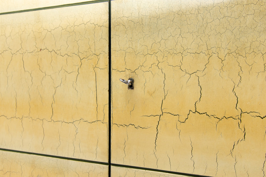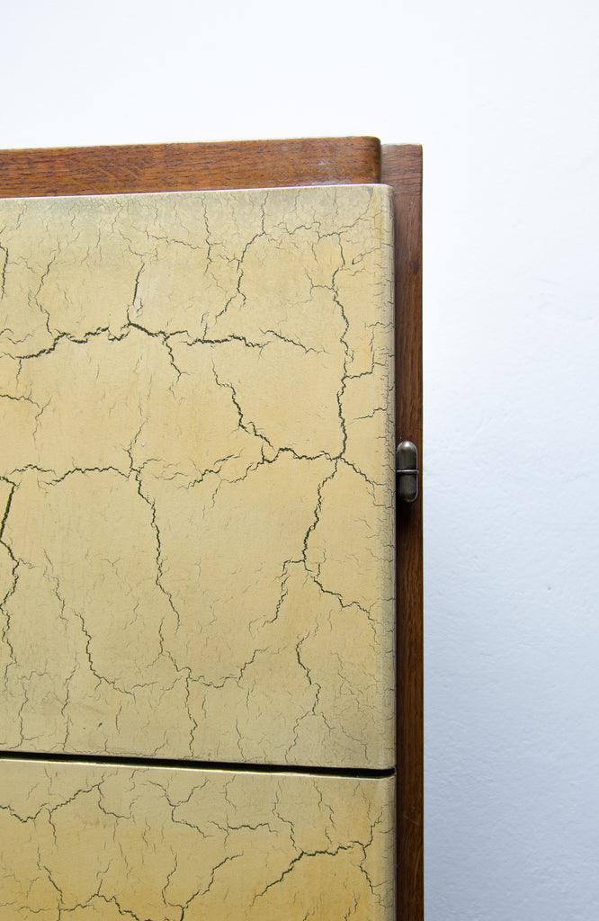 Cabinet doors are covered with paint in the style of genuine leather, in Italian-style furniture design. Oak veneer.