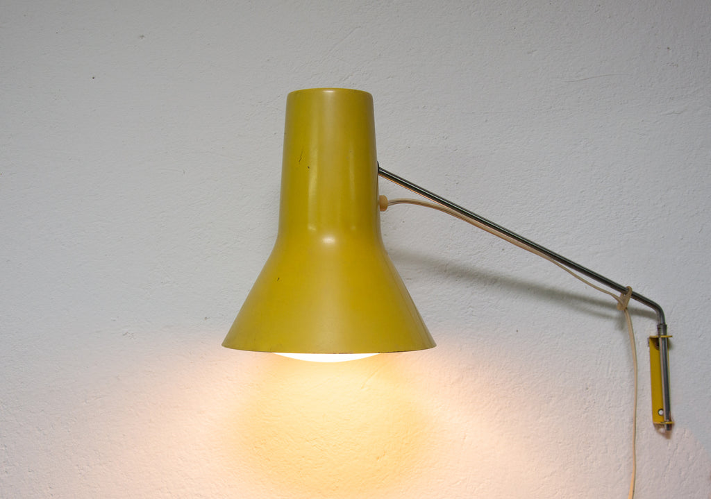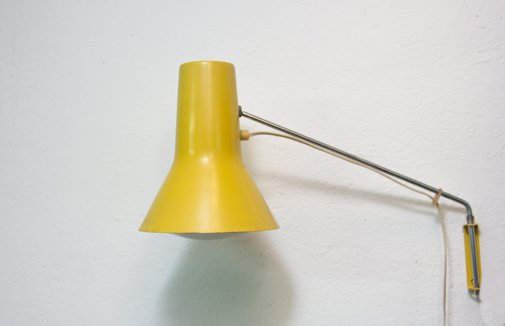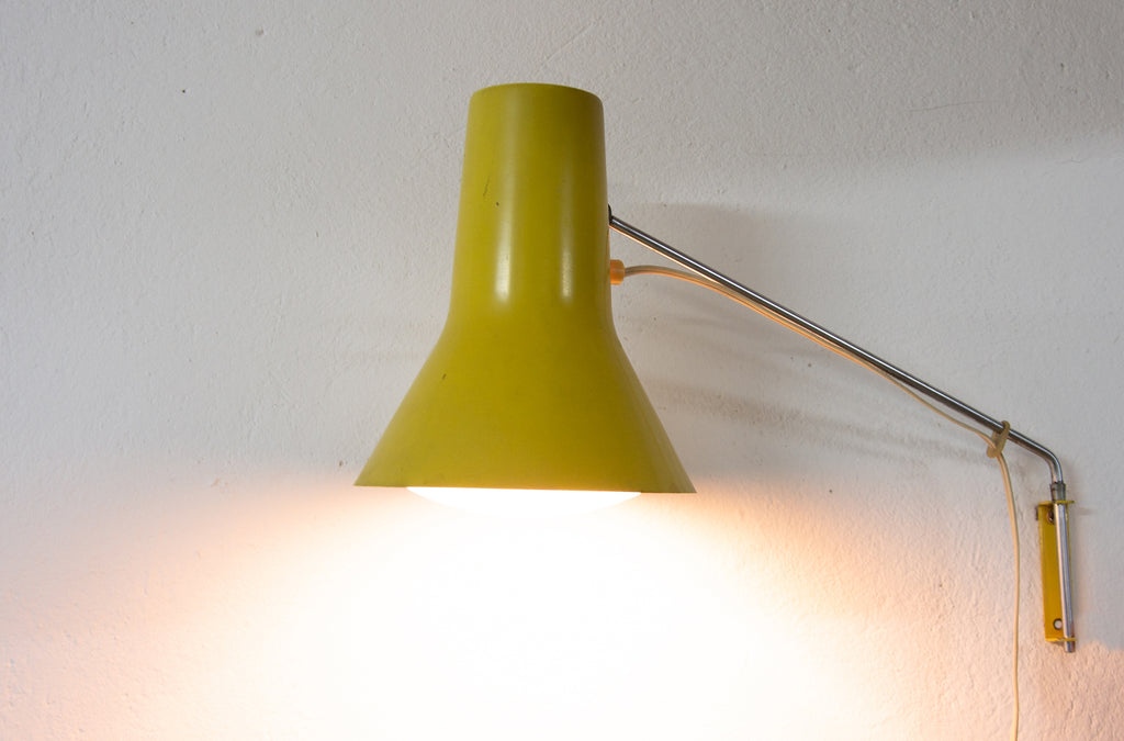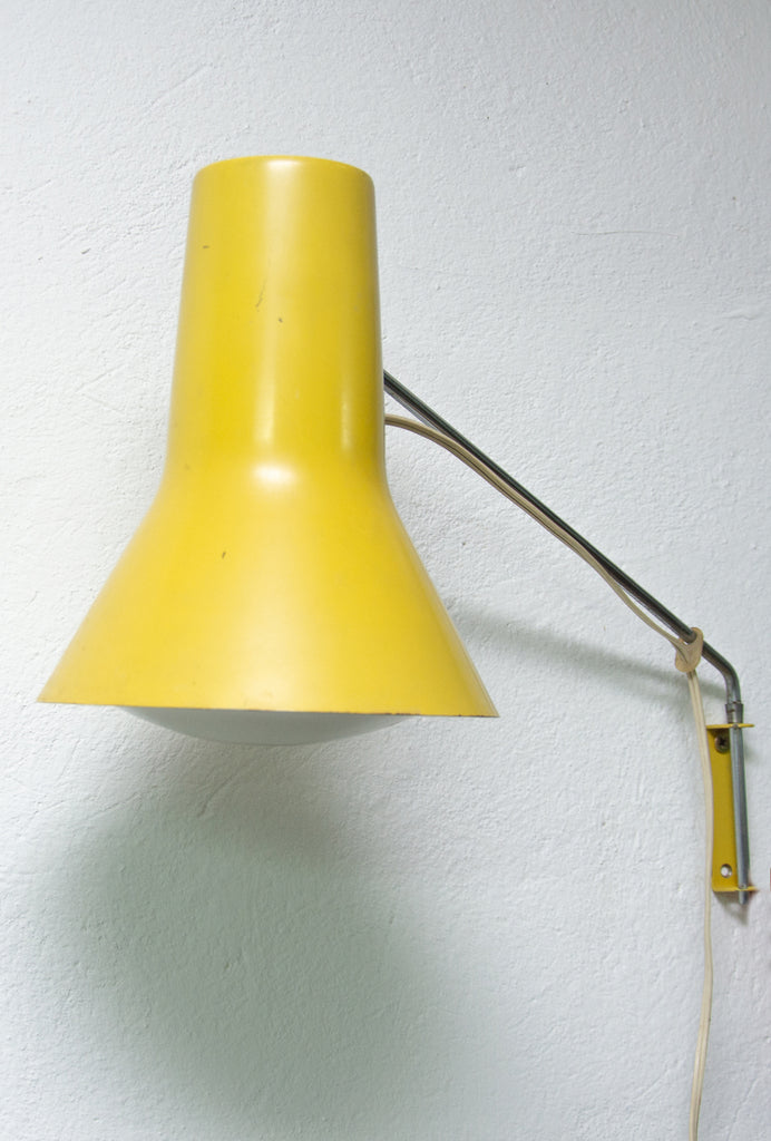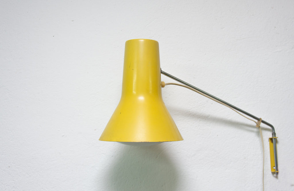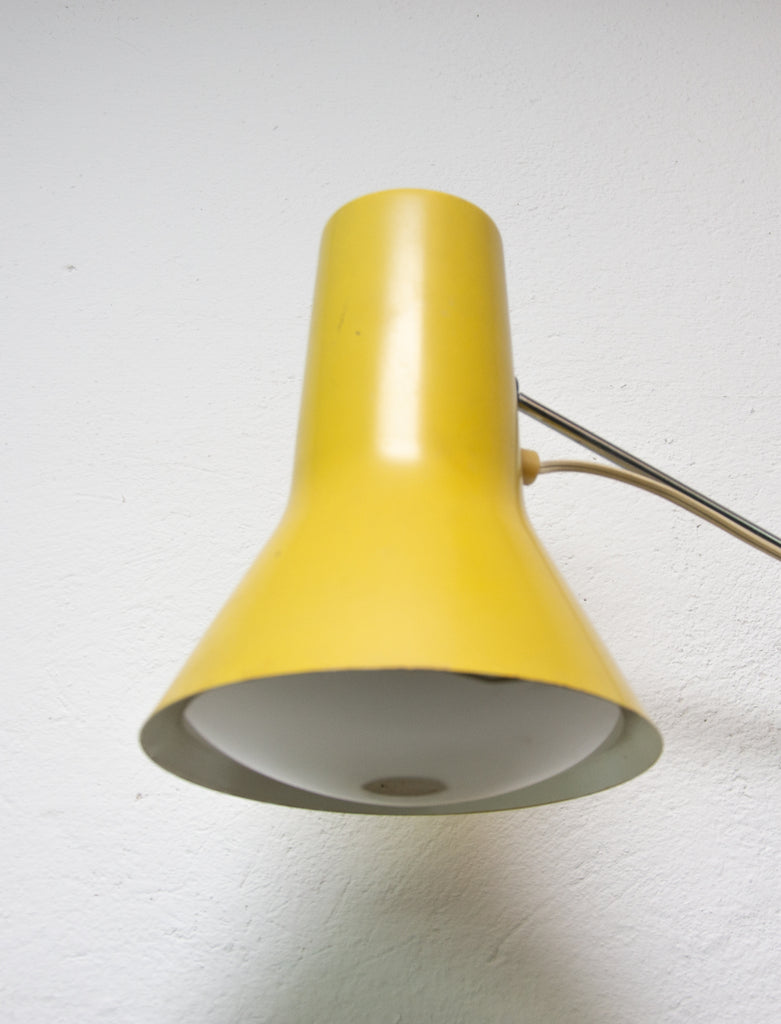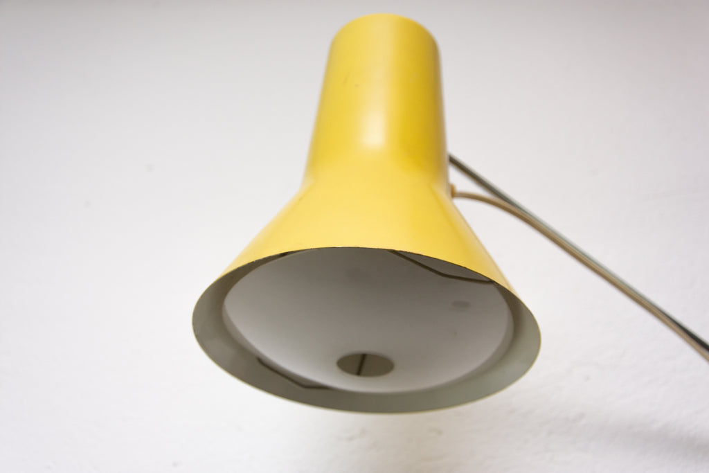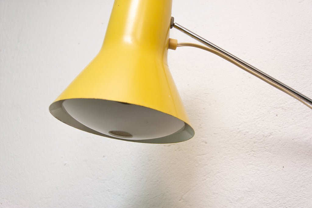 This wall lamp was designed by Josef Hurka in the 1960s. Shade is made of aluminium, rest is made of painted and chromed steel. Lamp uses one E27, max 100W bulb.