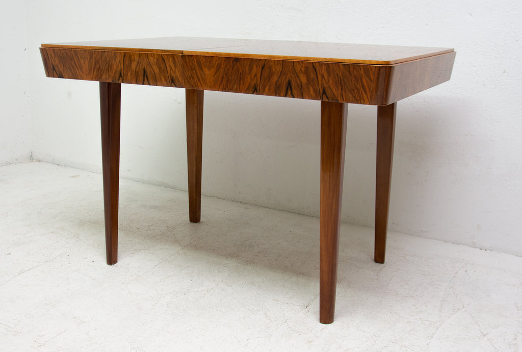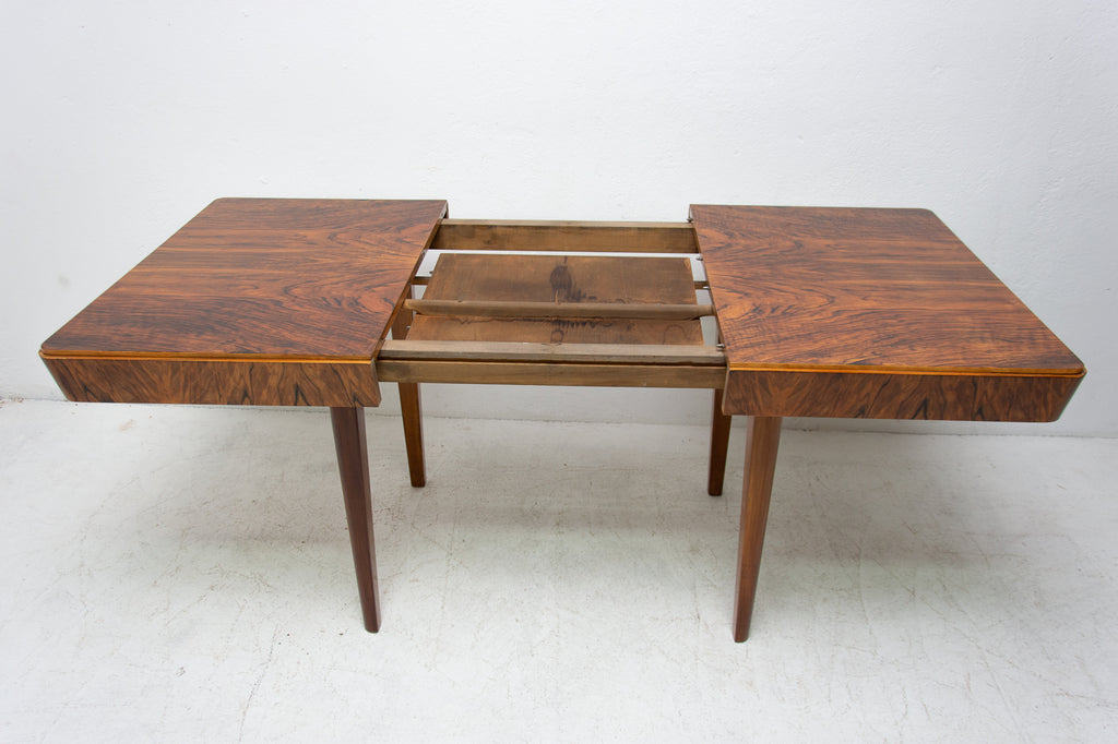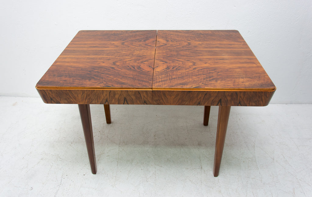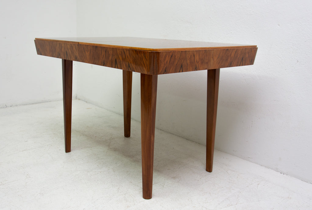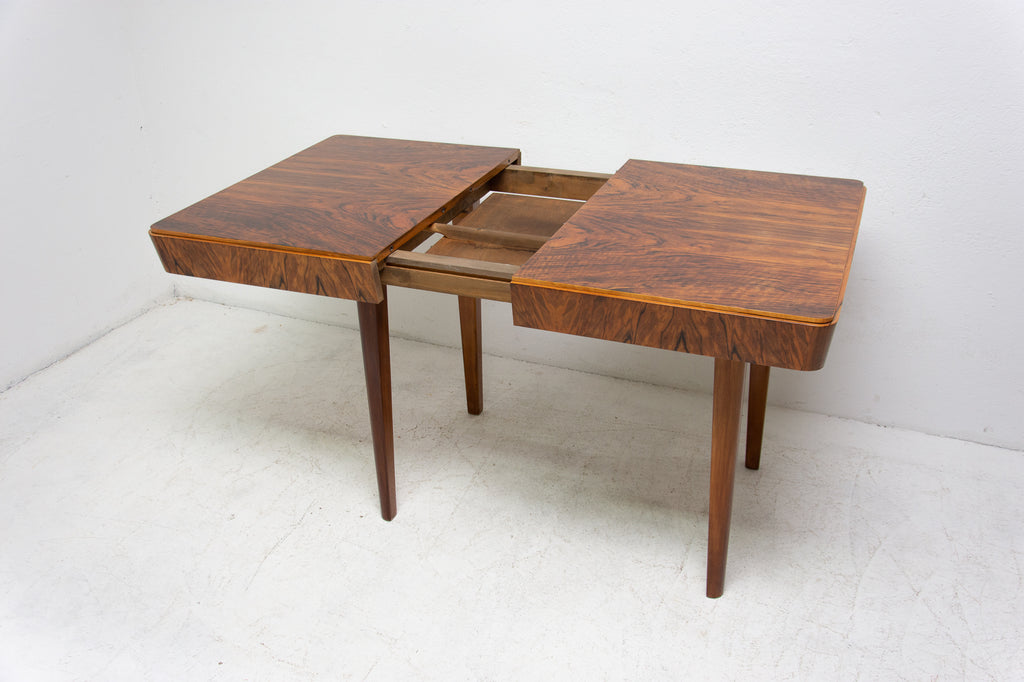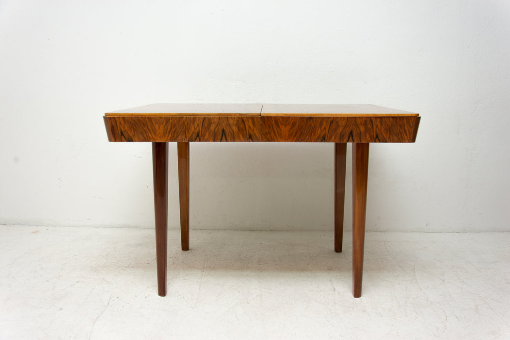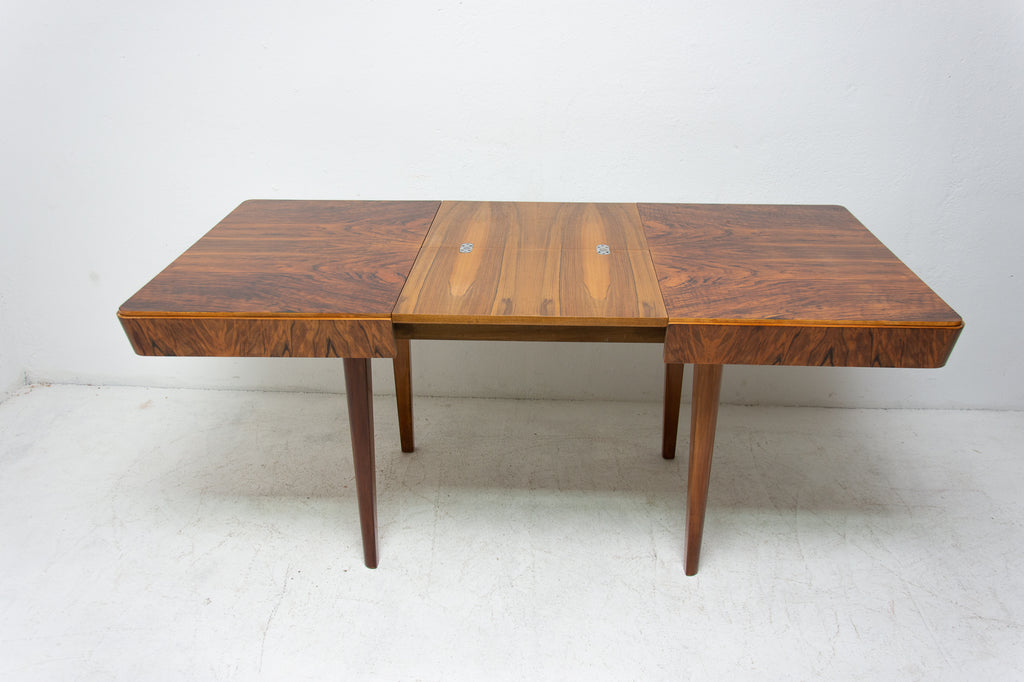 This adjustable dining table was designed and made in the 1950s in the former Czechoslovakia. It was designed by Jindrich Halabala. The material is a combination of solid wood and walnut veneer. It was professionally restored. The wood has been polished to a high gloss using polyurethane.
