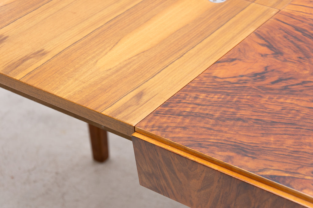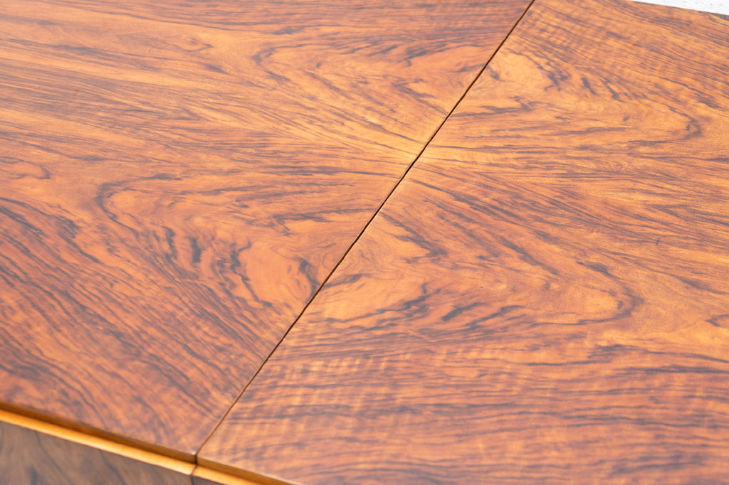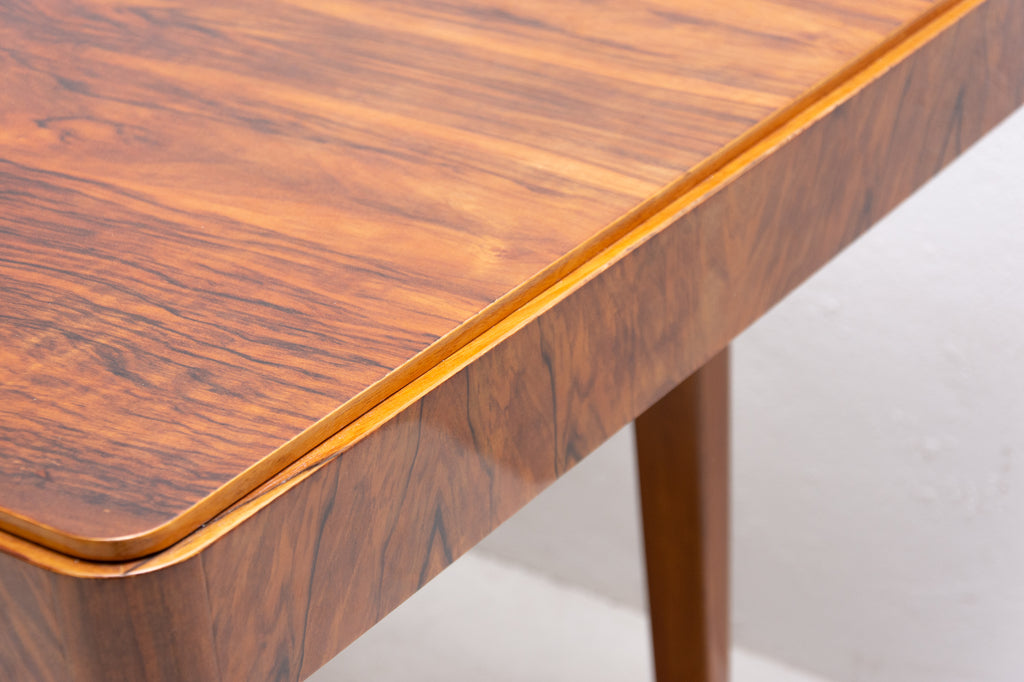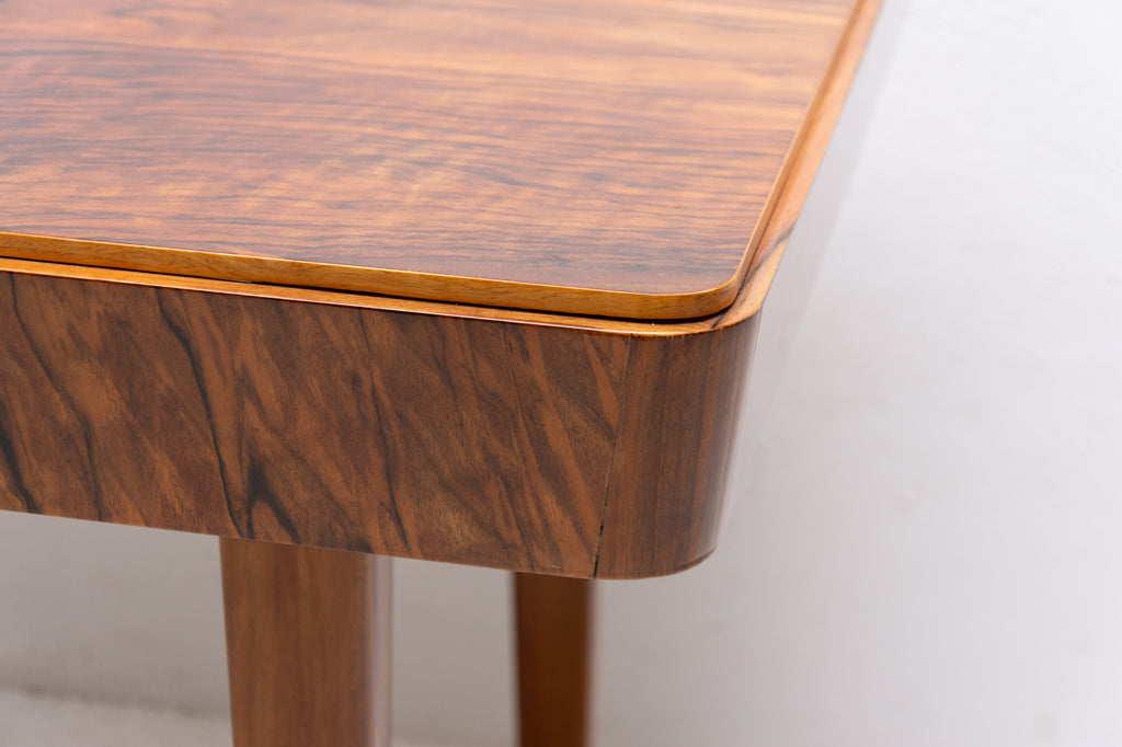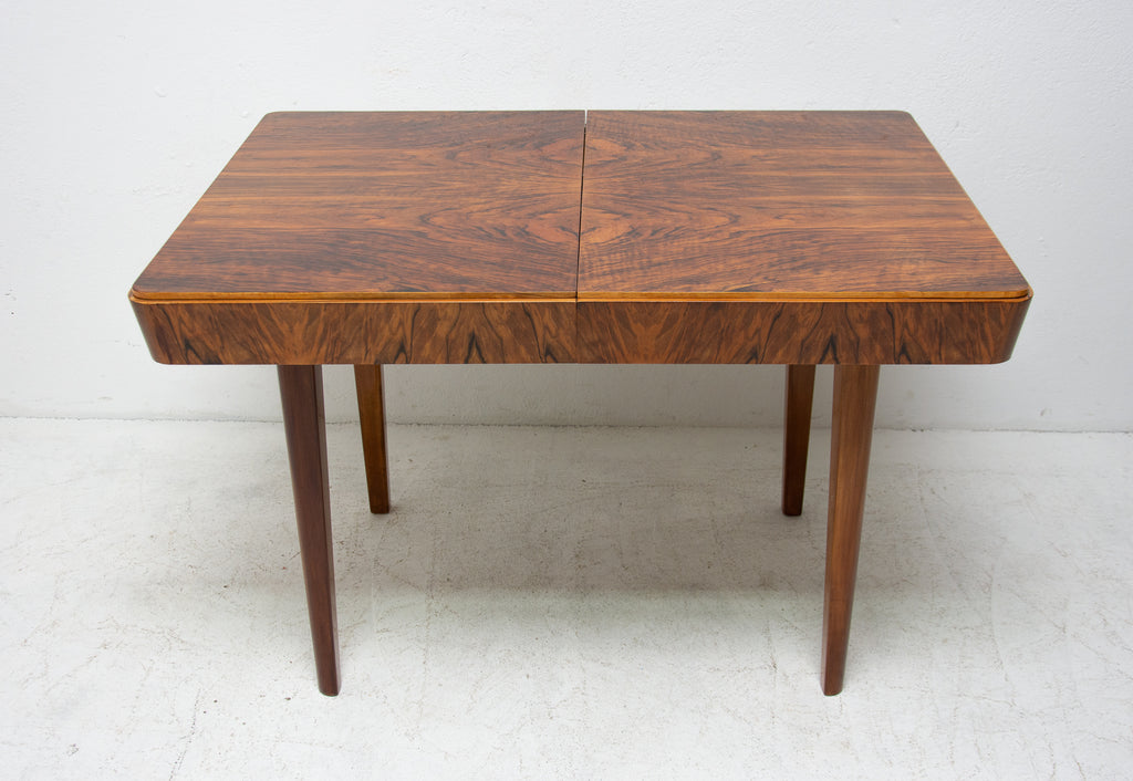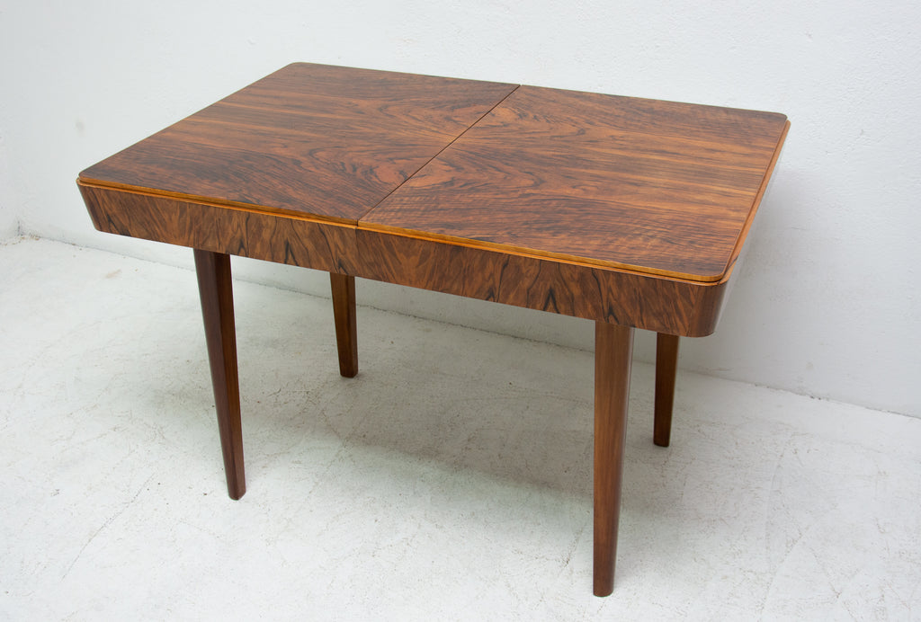 This adjustable dining table was designed and made in the 1950s in the former Czechoslovakia. It was designed by Jindrich Halabala. The material is a combination of solid wood and walnut veneer. It was professionally restored. The wood has been polished to a high gloss using polyurethane.
