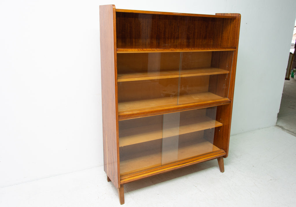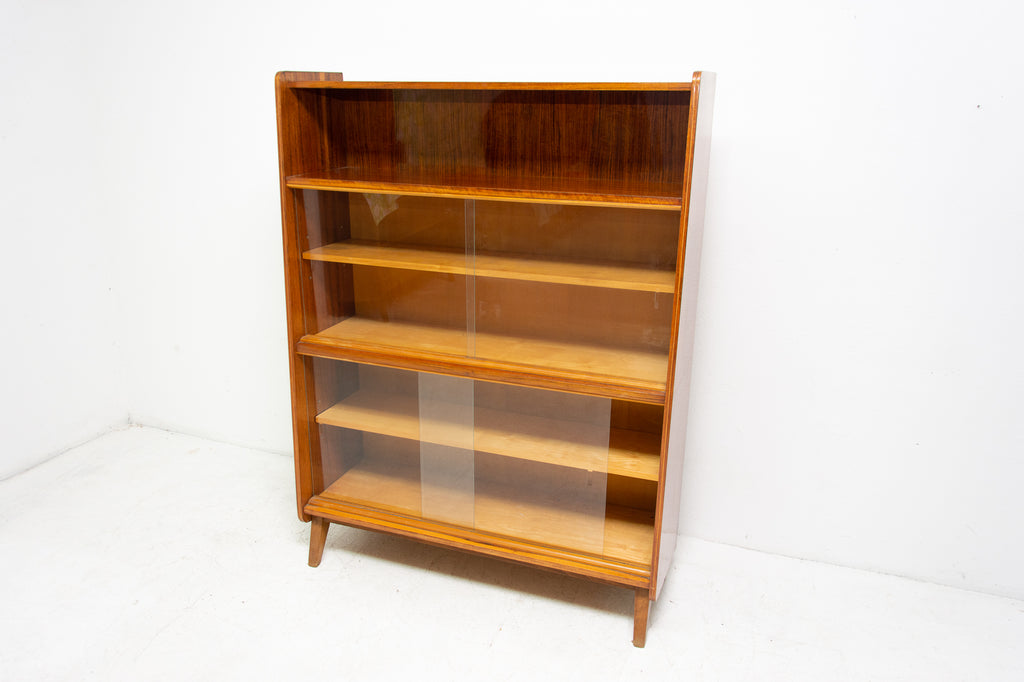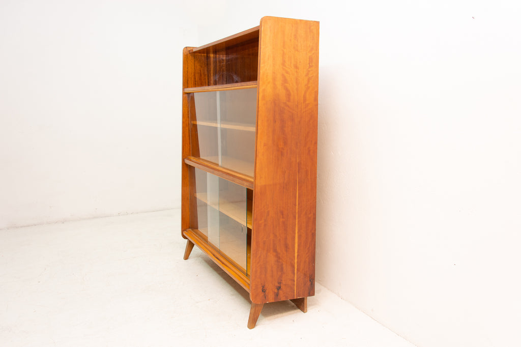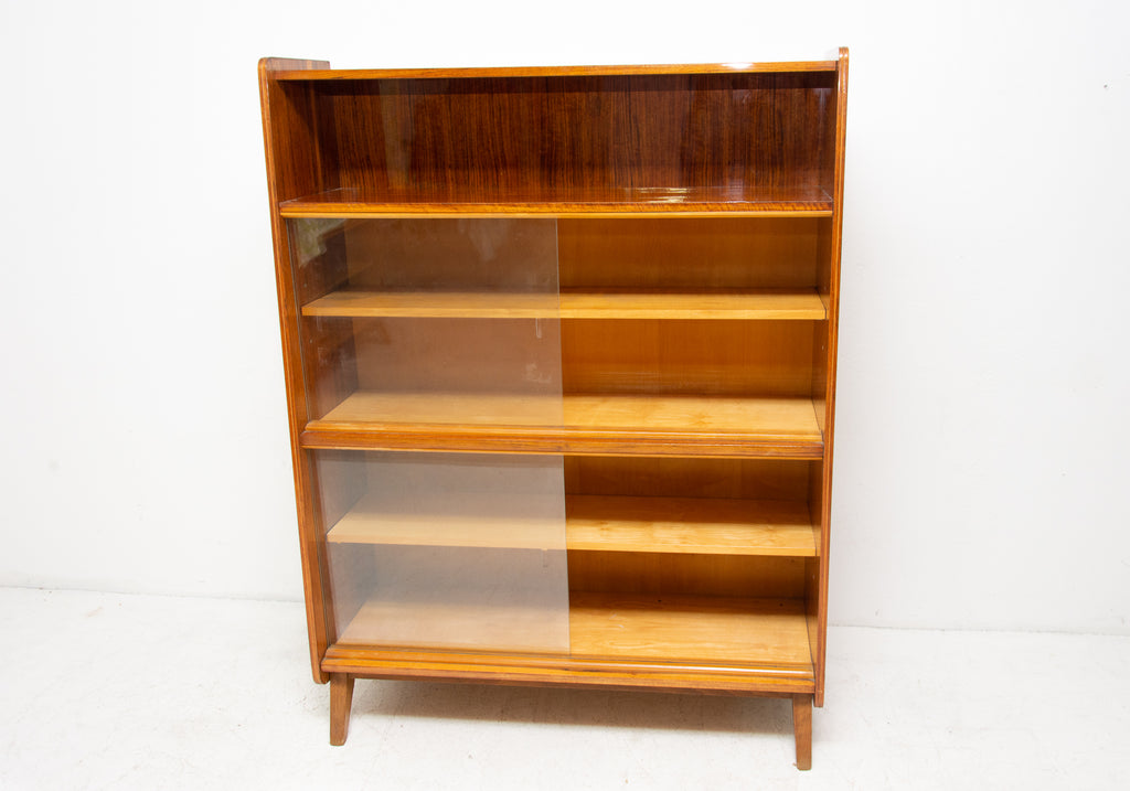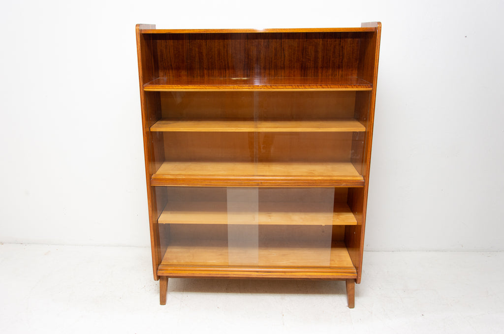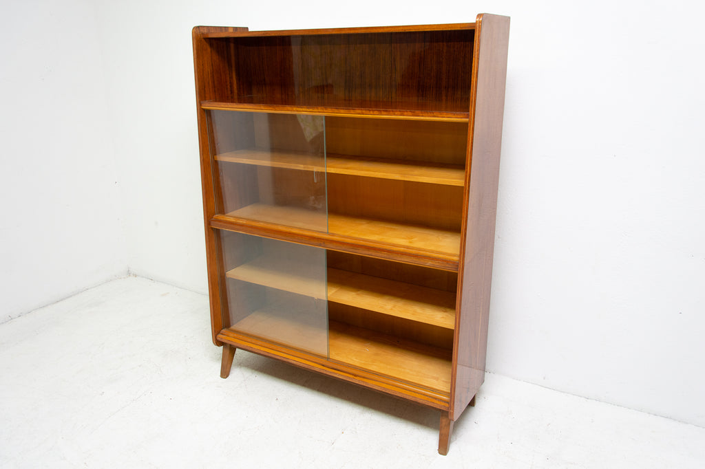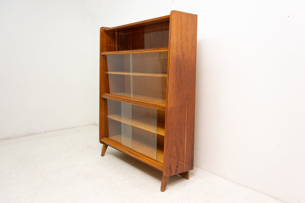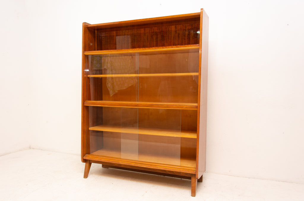 Mid century Vintage bookcase from the 1960´s. It was designed by Frantisek Jirák and was manufactured by Tatra nábytok company in the former Czechoslovakia. Features a simple design, a glazed section with five storage spaces. In Very good condition. Beautiful walnut veneer, plywood.