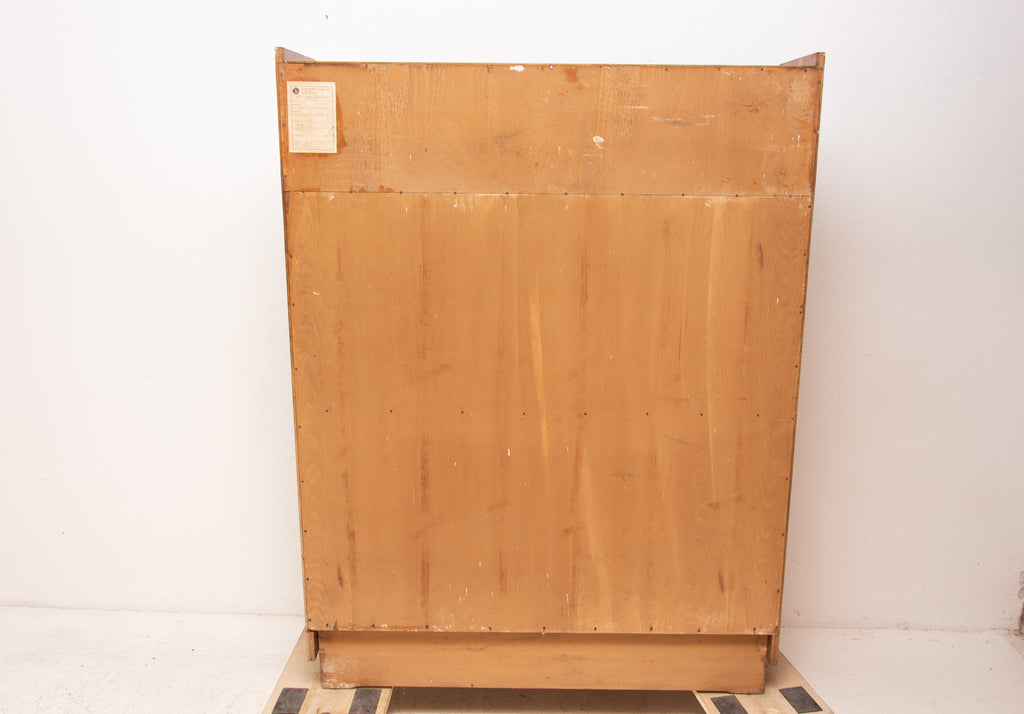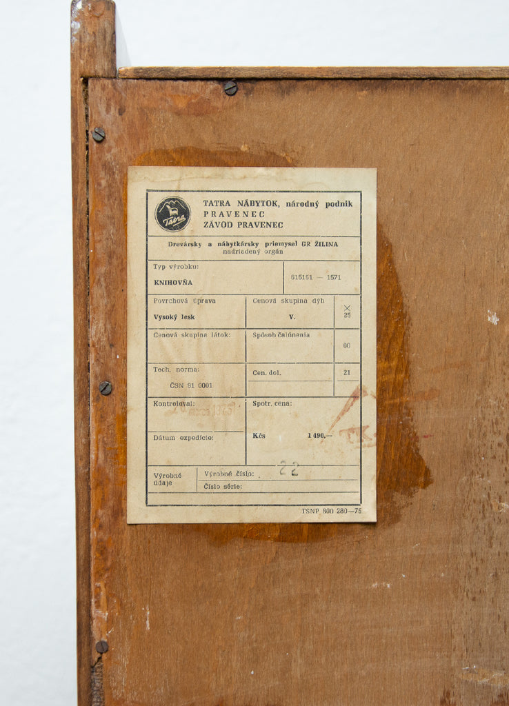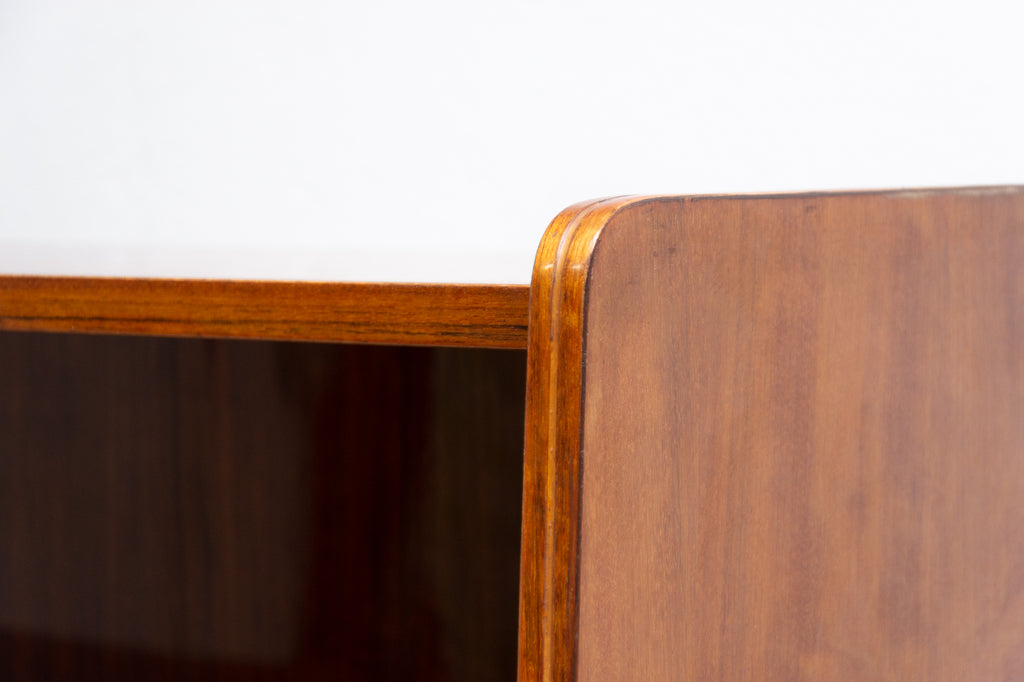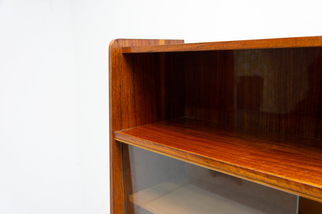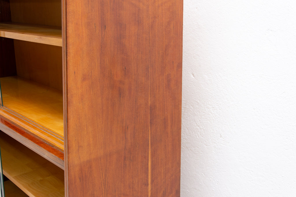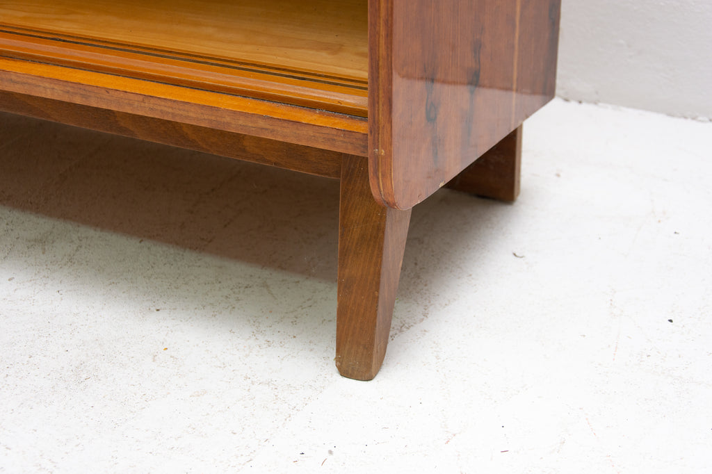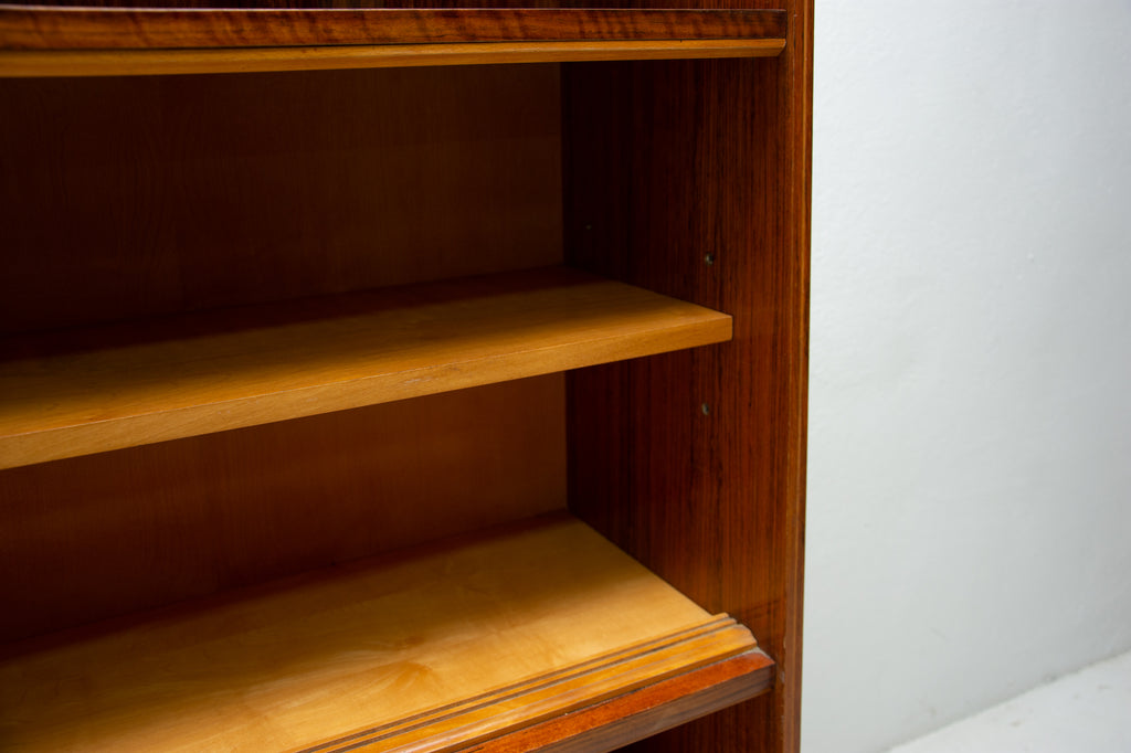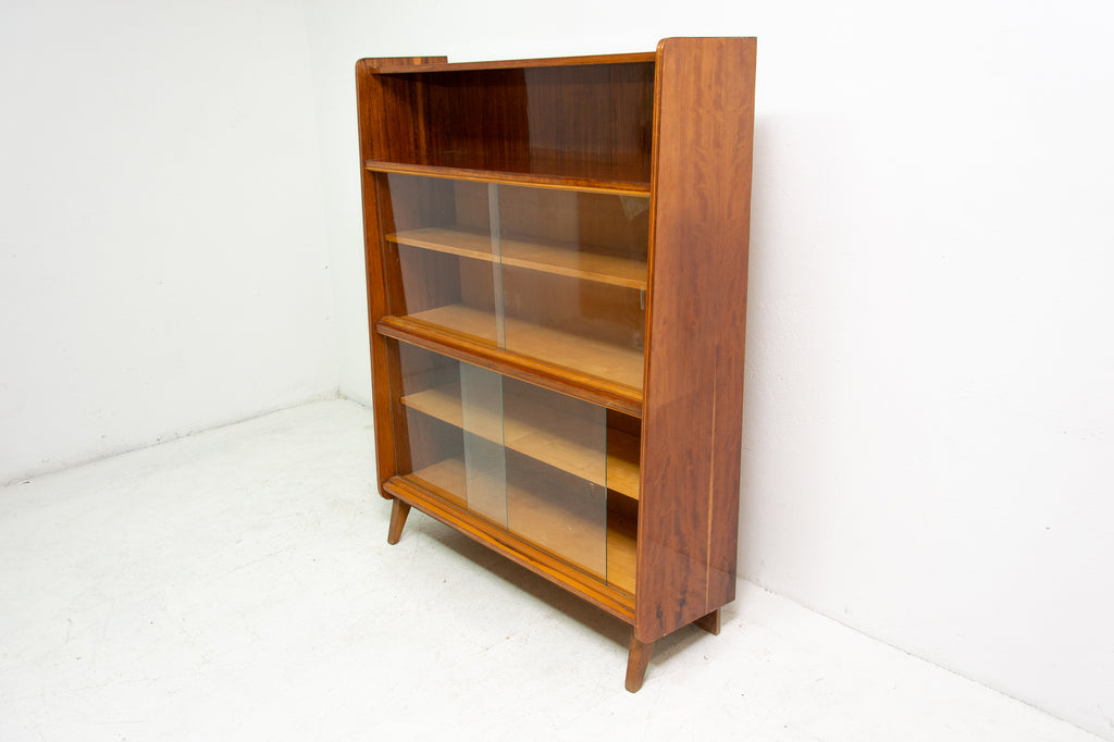 Mid century Vintage bookcase from the 1960´s. It was designed by Frantisek Jirák and was manufactured by Tatra nábytok company in the former Czechoslovakia. Features a simple design, a glazed section with five storage spaces. In Very good condition. Beautiful walnut veneer, plywood.