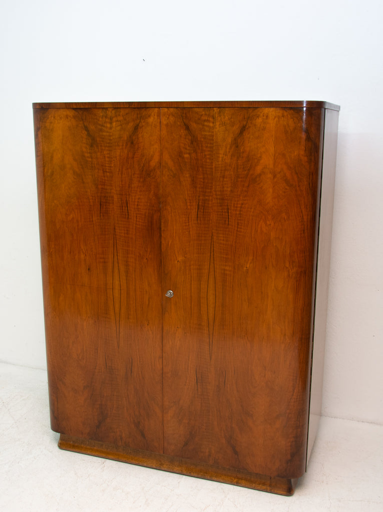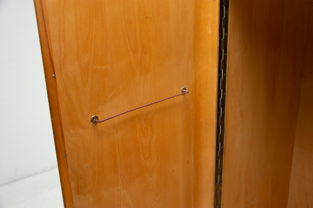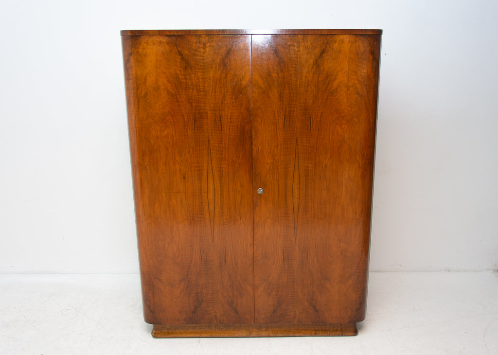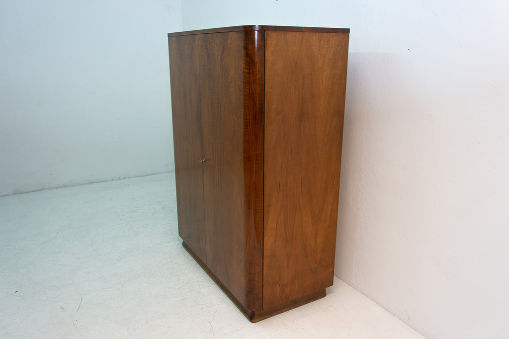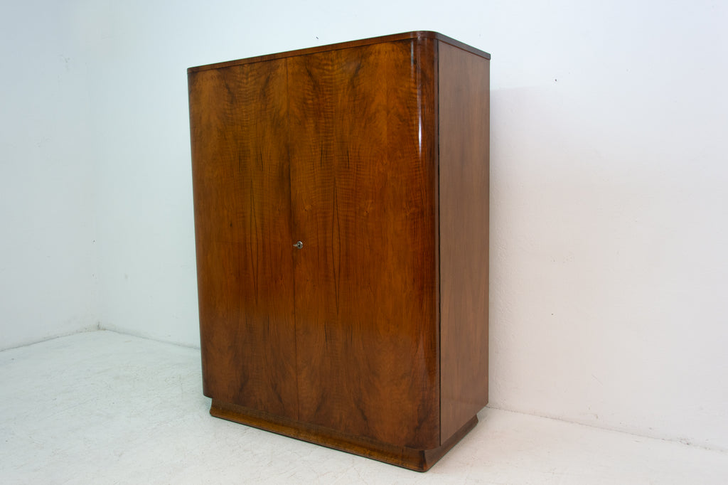 Vintage Czechoslovak modernist Wardrobe, made in Czechoslovakia in the 1950´s. It is made of walnut wood and plywood. This item is in very good Vintage condition, with only slight signs of age and using, a small chip of veneer on the back of the cabinet, you can see in the photos.