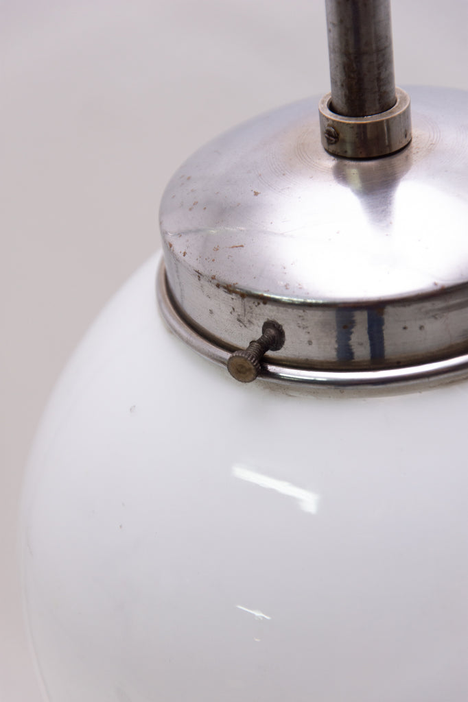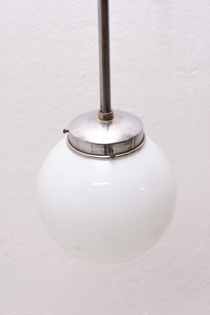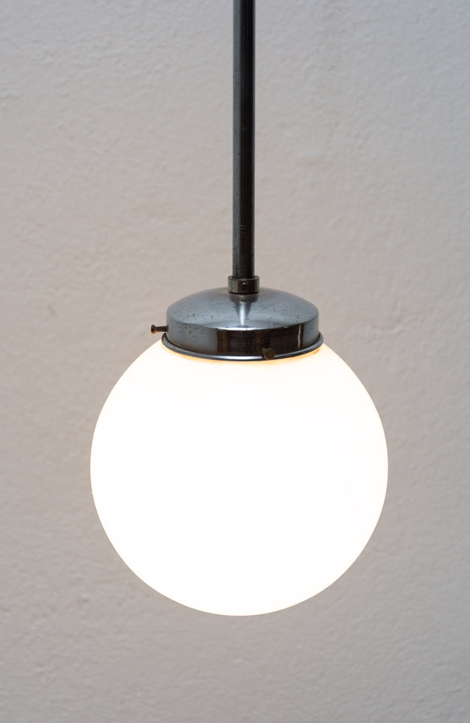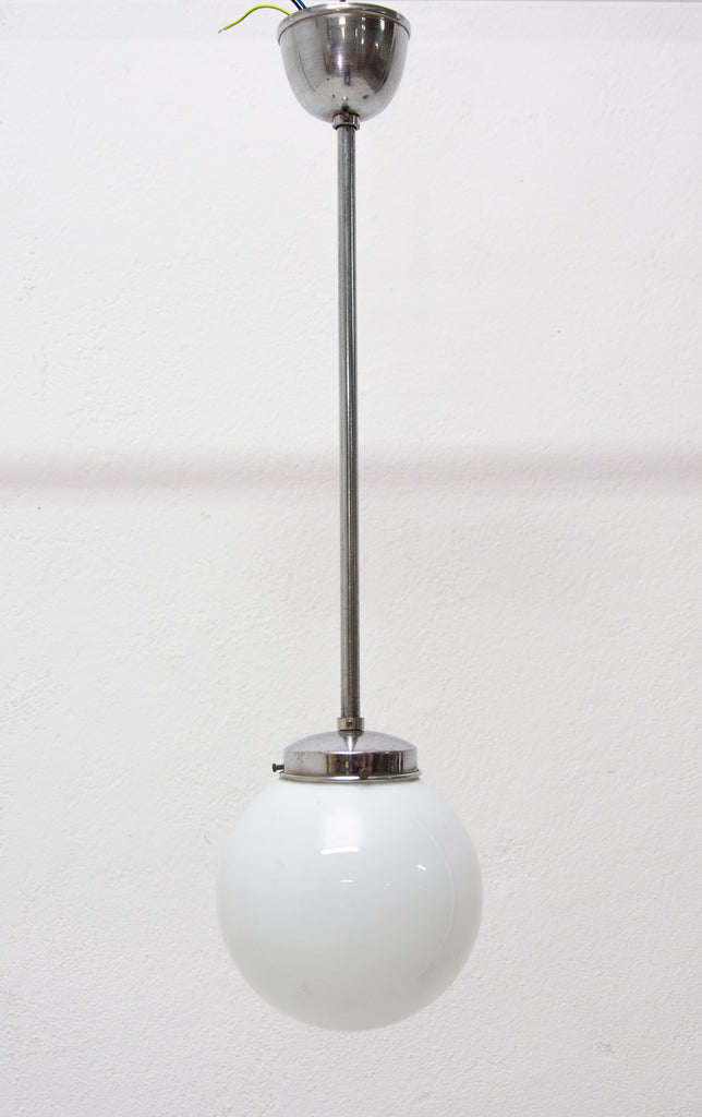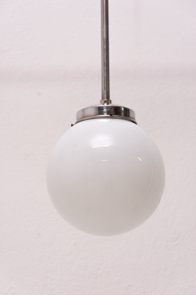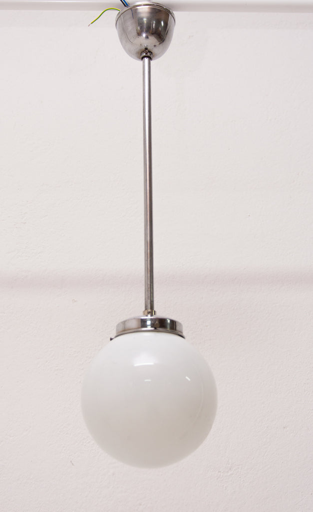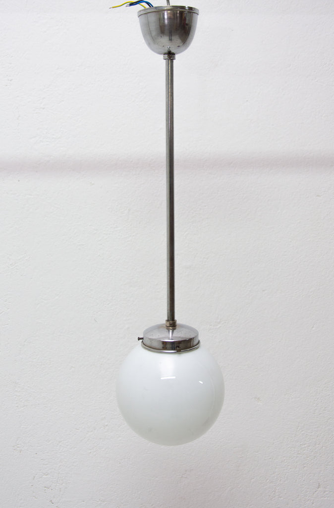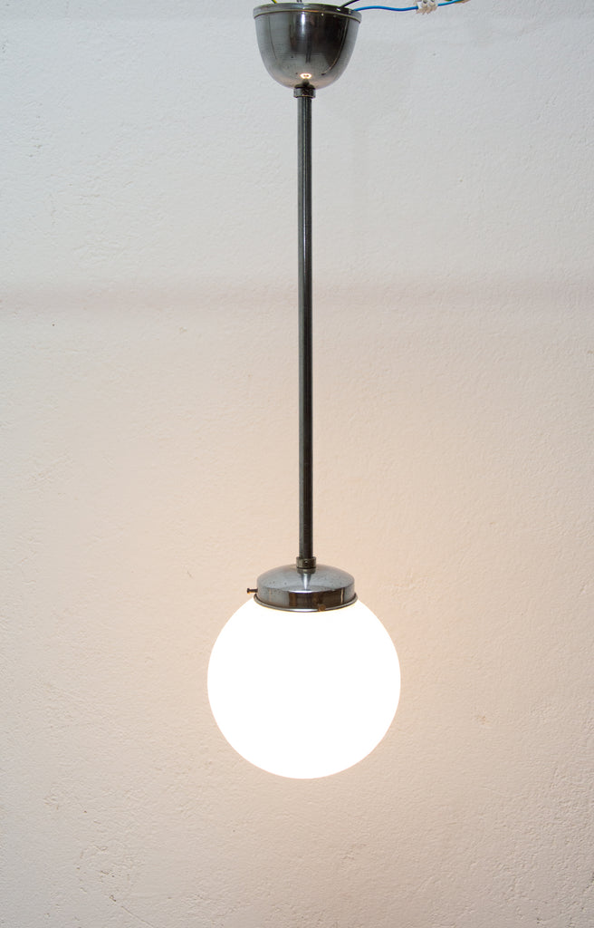 Bauhaus pendant lamp, made in the former Czechoslovakia in the 1940´s. Round opaque glass with a chrome-plated rod. In very good condition. New wiring.