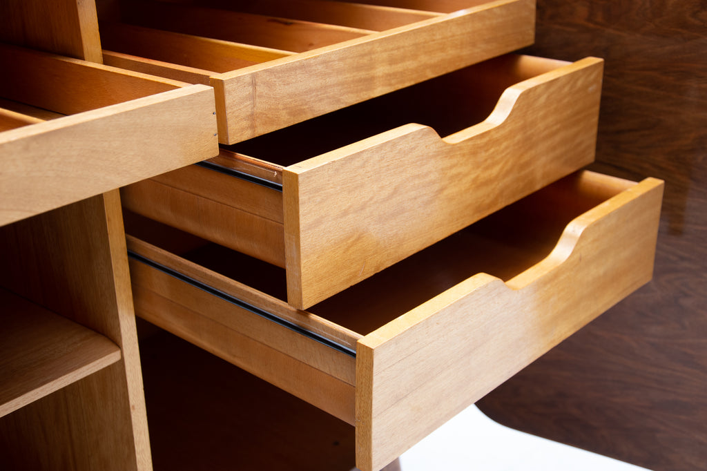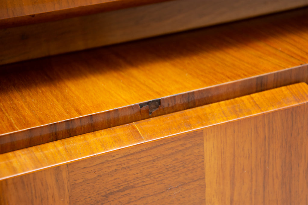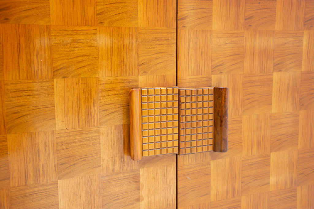 This is an extremely successful piece of design. Rounded edges along the sides of the sideboard, tapered - angled legs, chess pattern on walnut veneer.