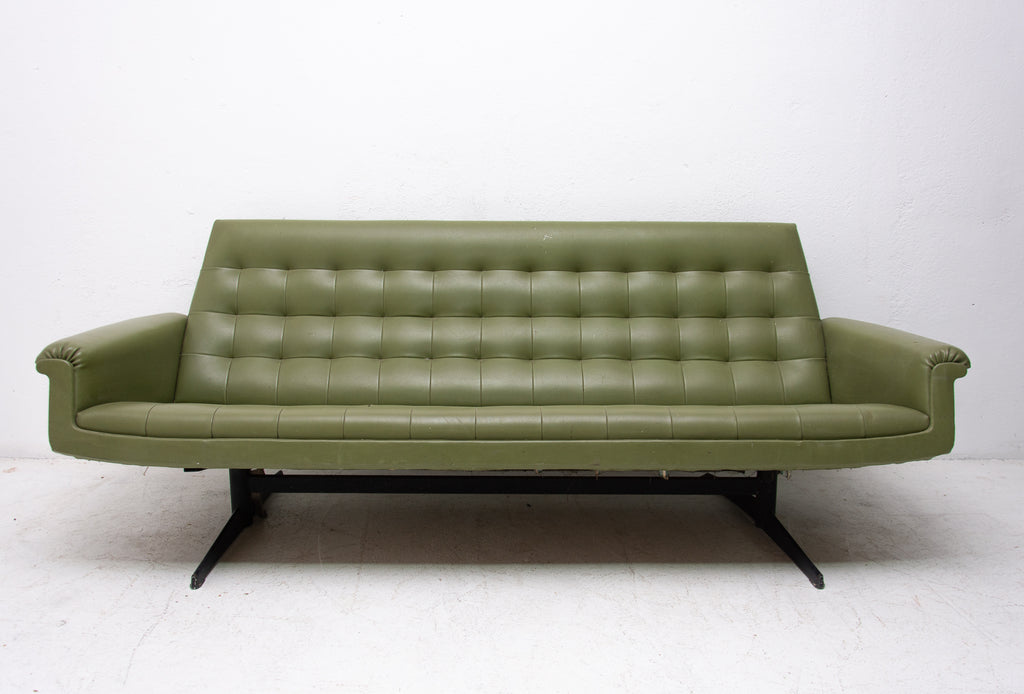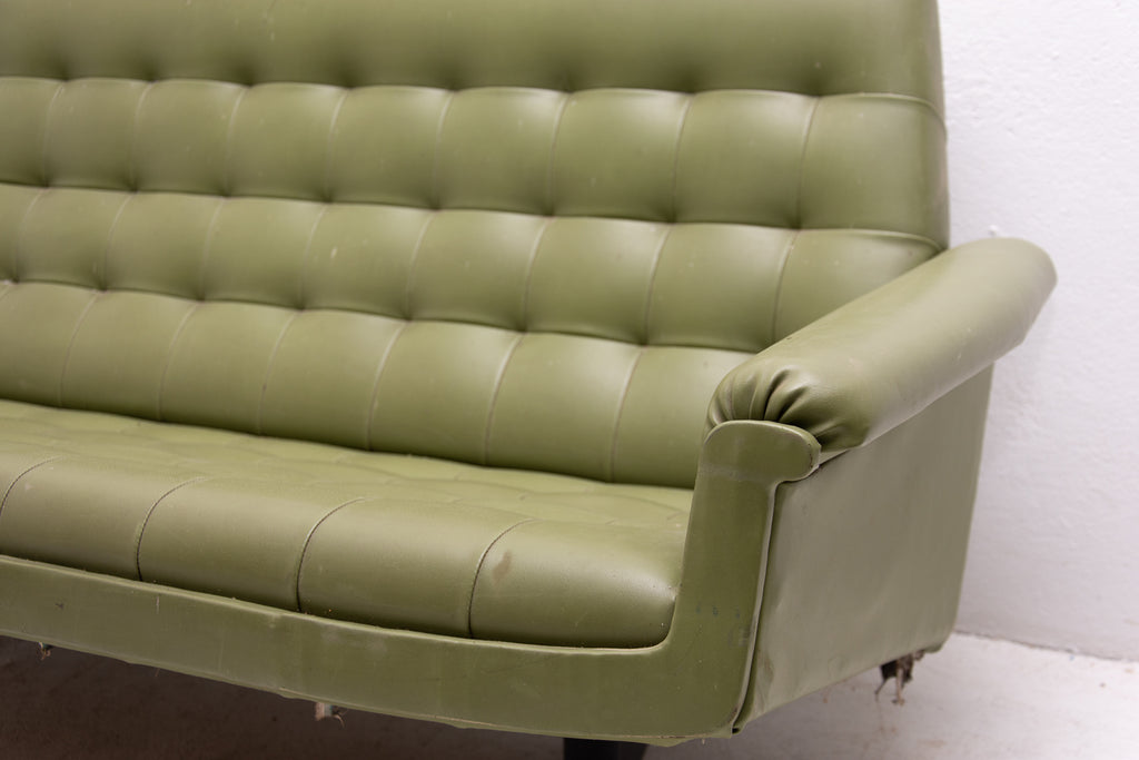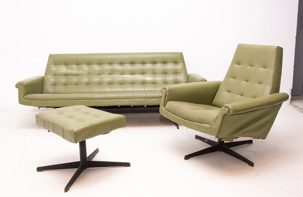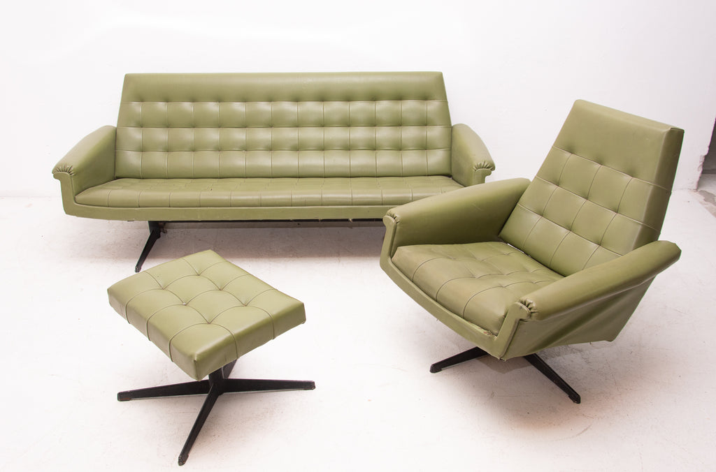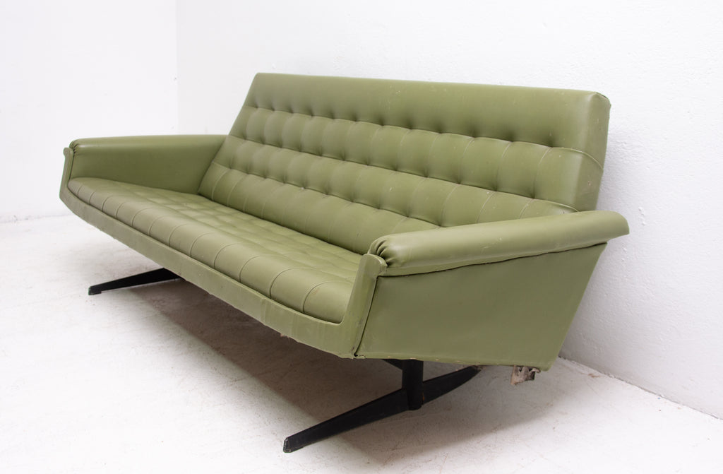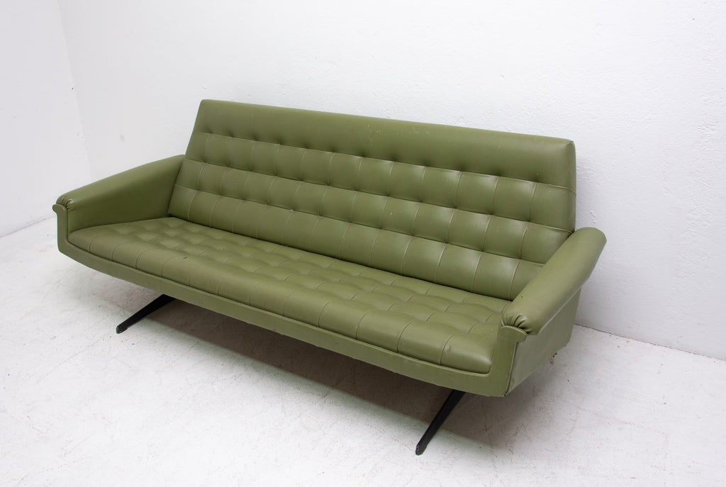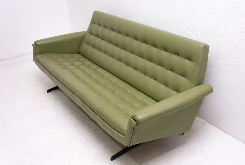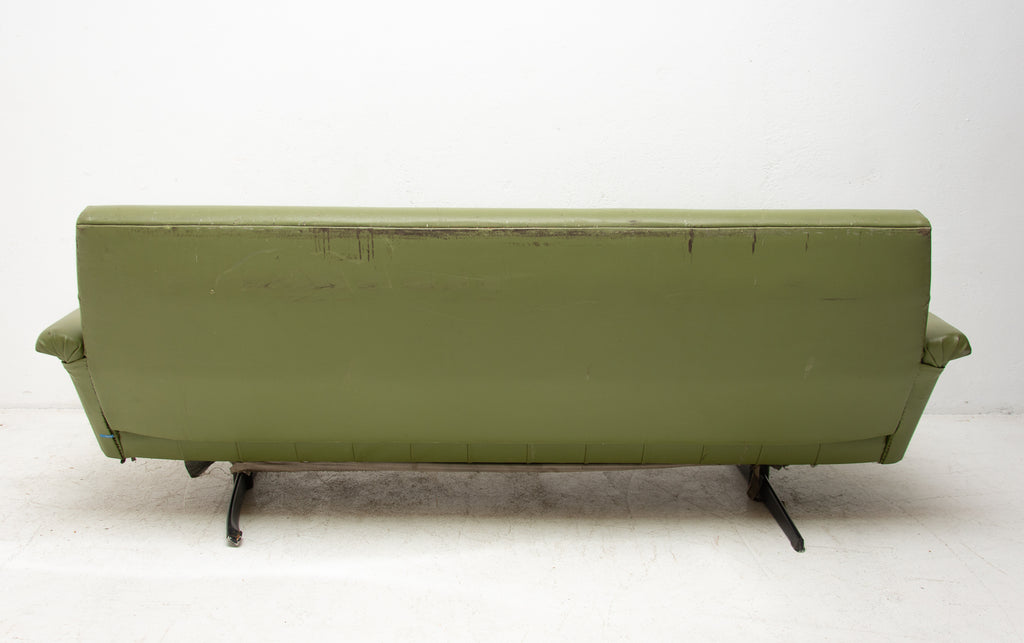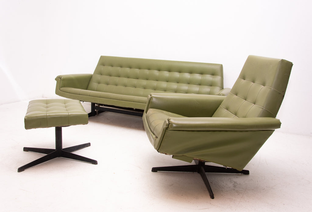 This sofa was made in the former Czechoslovakia in the 1970´as a part of living room set consists of one sofa, pair of swivel armchairs and stool. The sofa is upholstered with green leatherette. The legs are made from iron. One leg is slightly bent at the back (see photos). All in original condition.