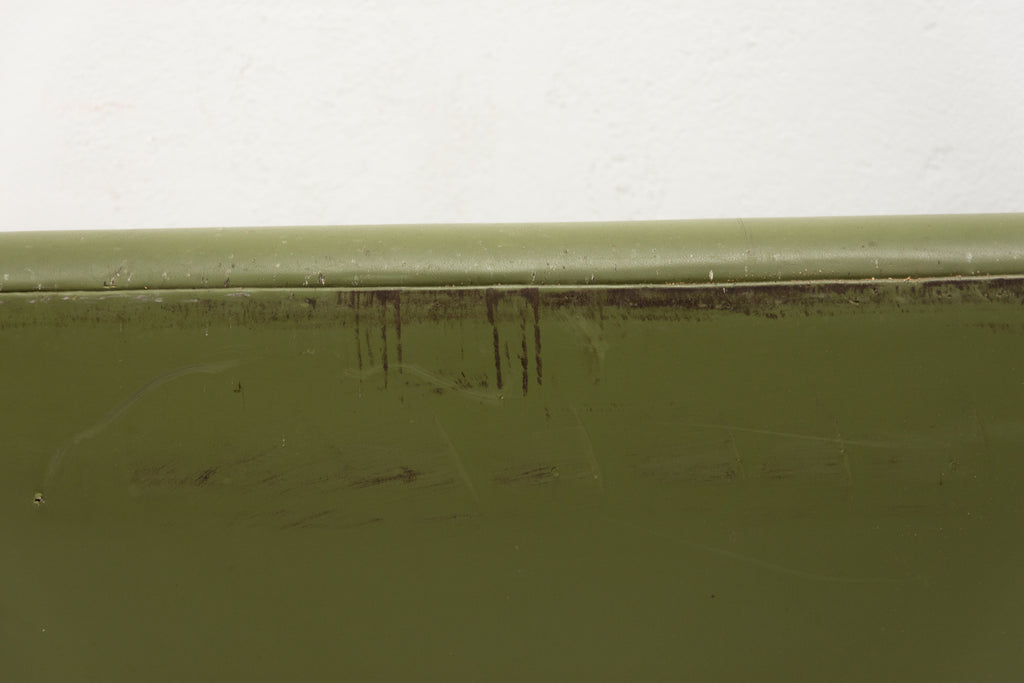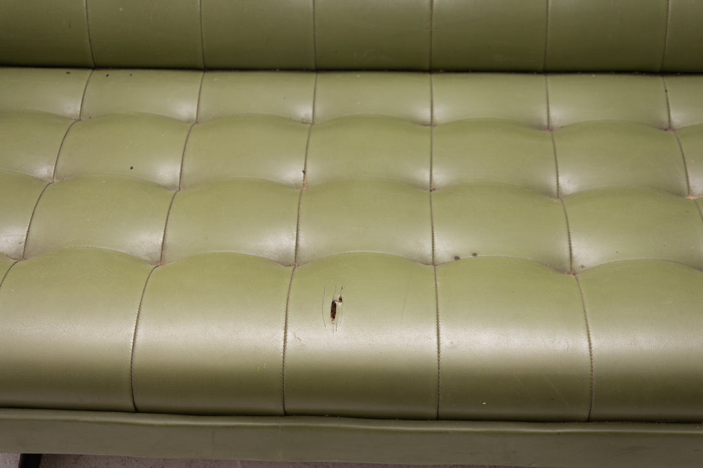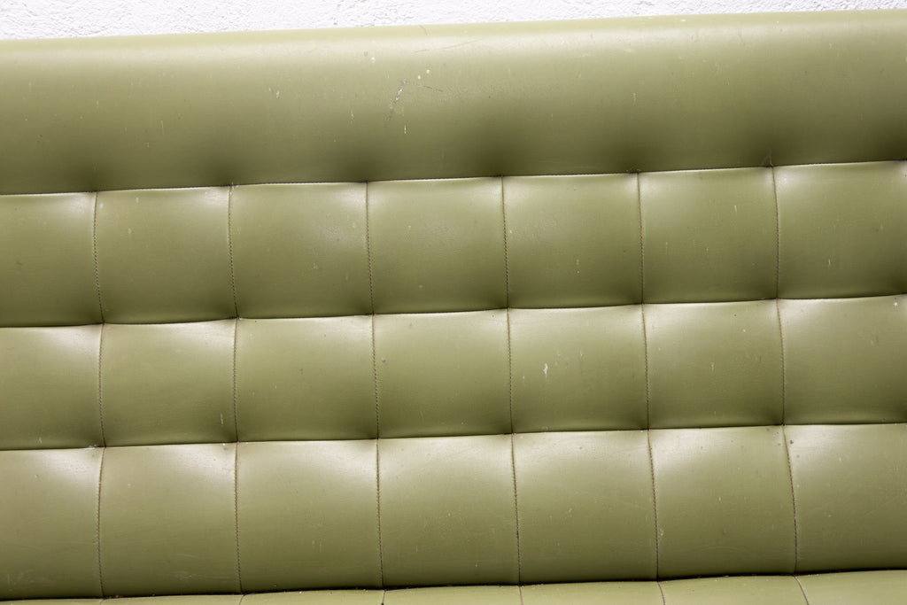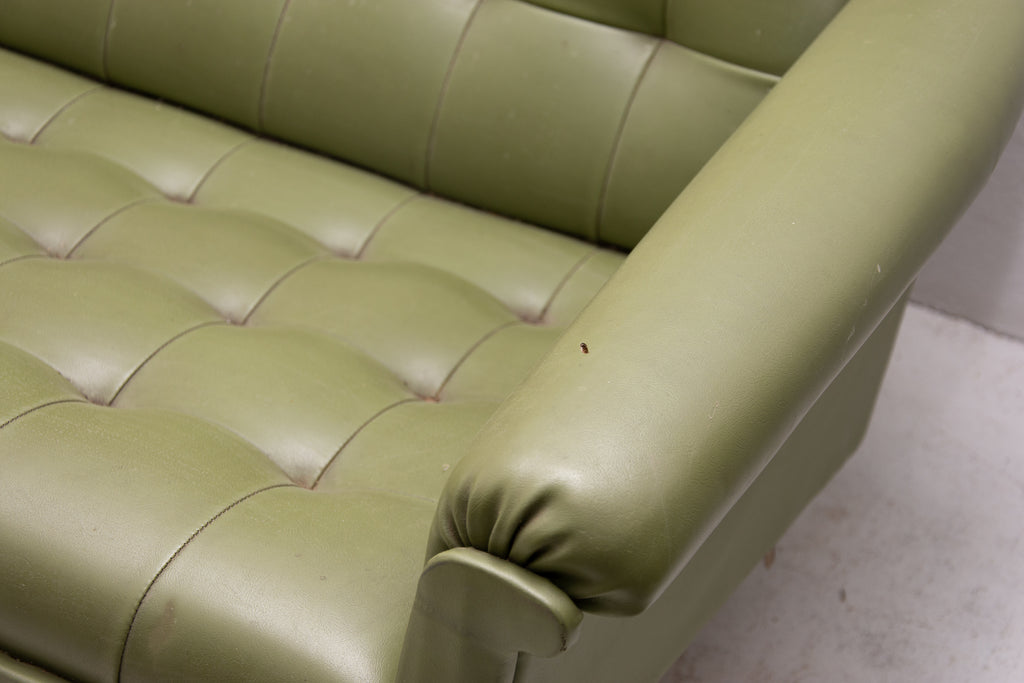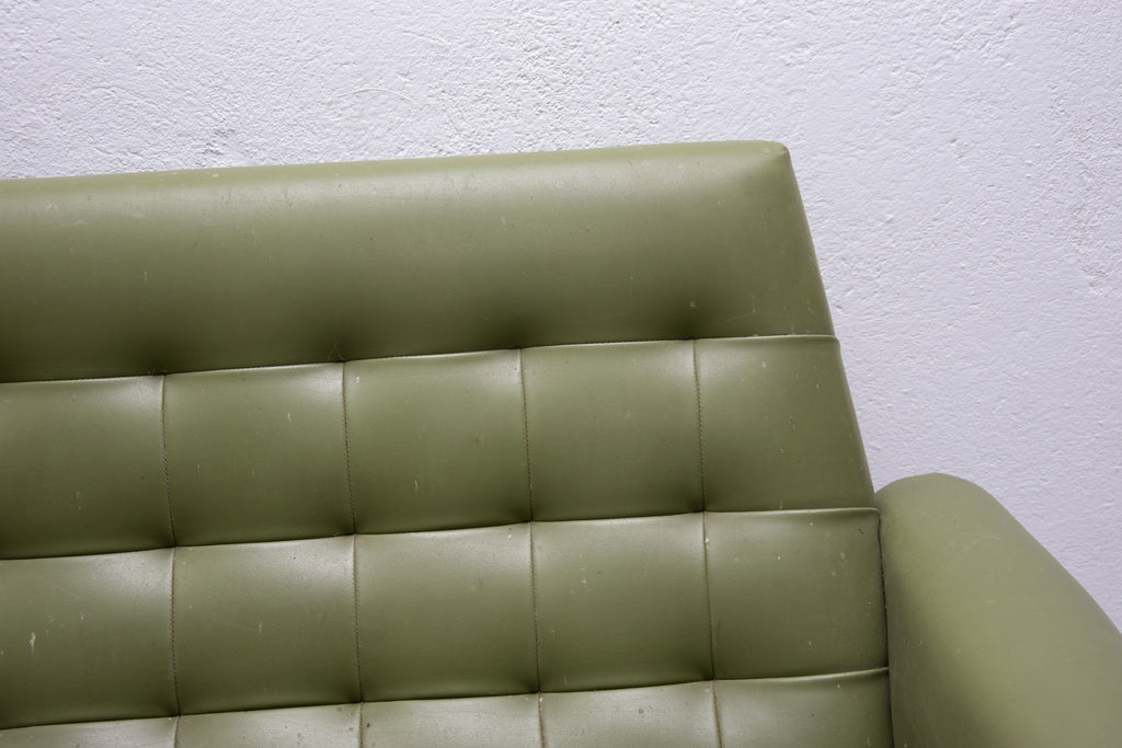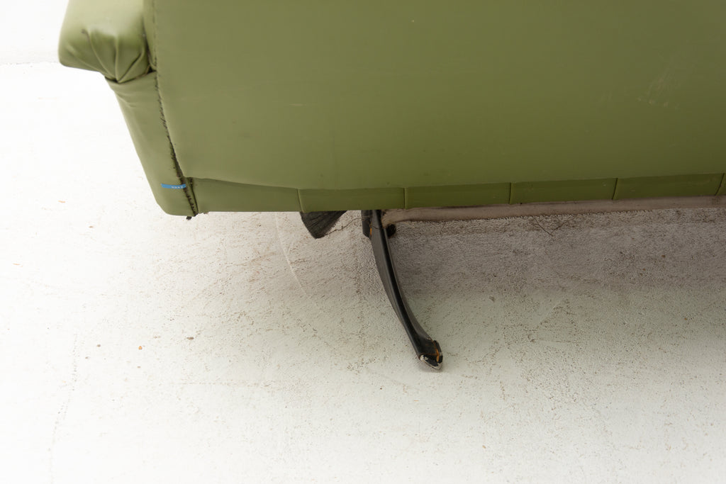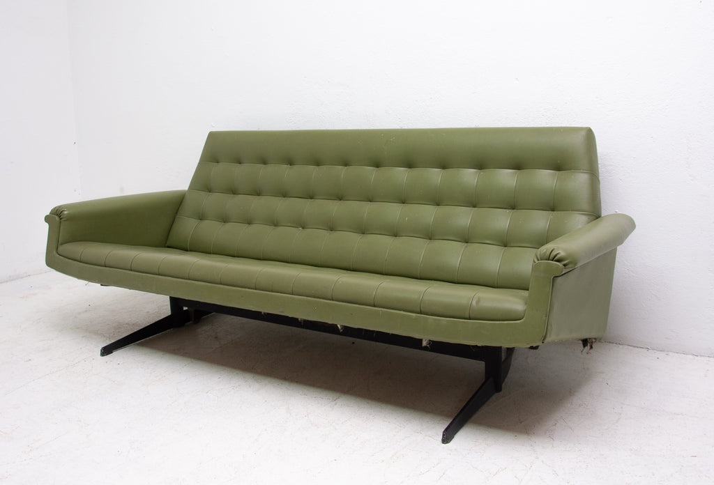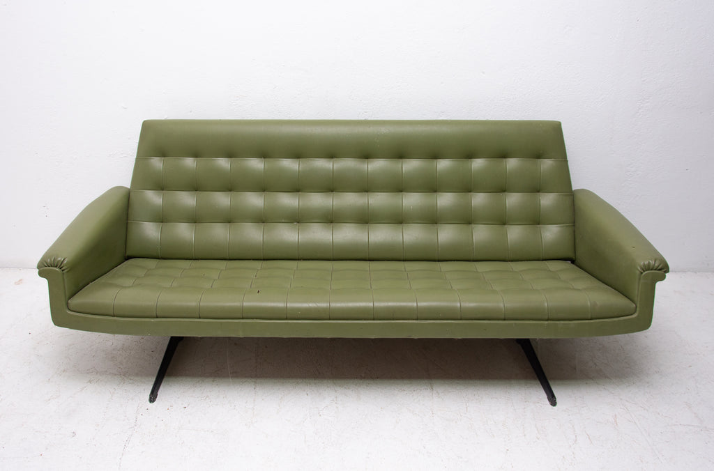 This sofa was made in the former Czechoslovakia in the 1970´as a part of living room set consists of one sofa, pair of swivel armchairs and stool. The sofa is upholstered with green leatherette. The legs are made from iron. One leg is slightly bent at the back (see photos). All in original condition.