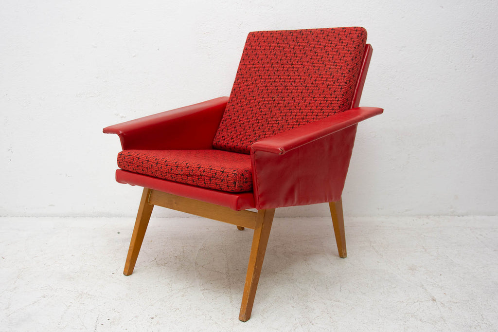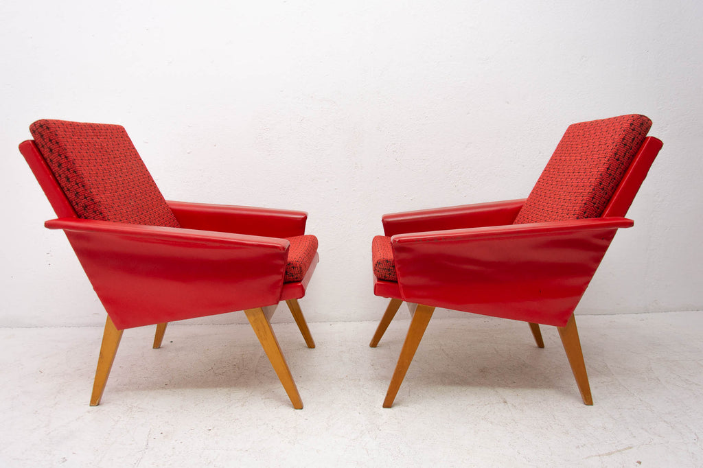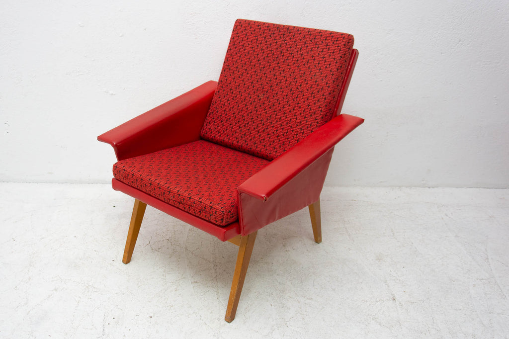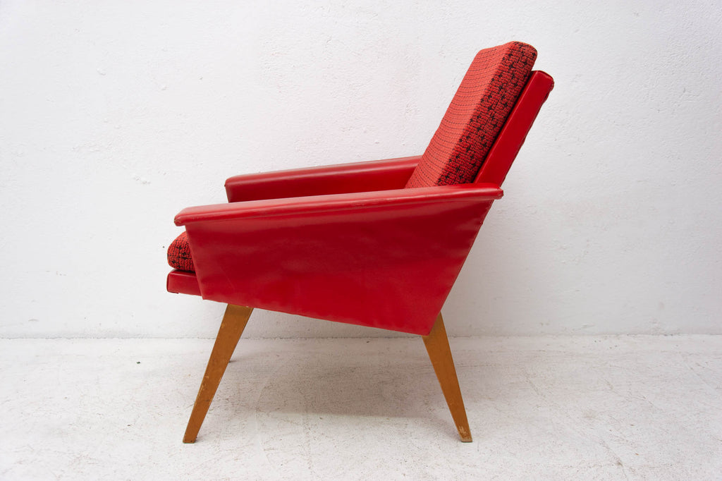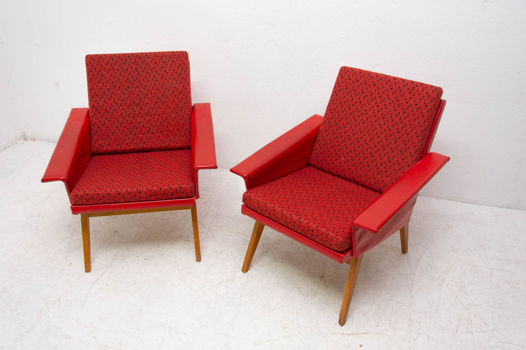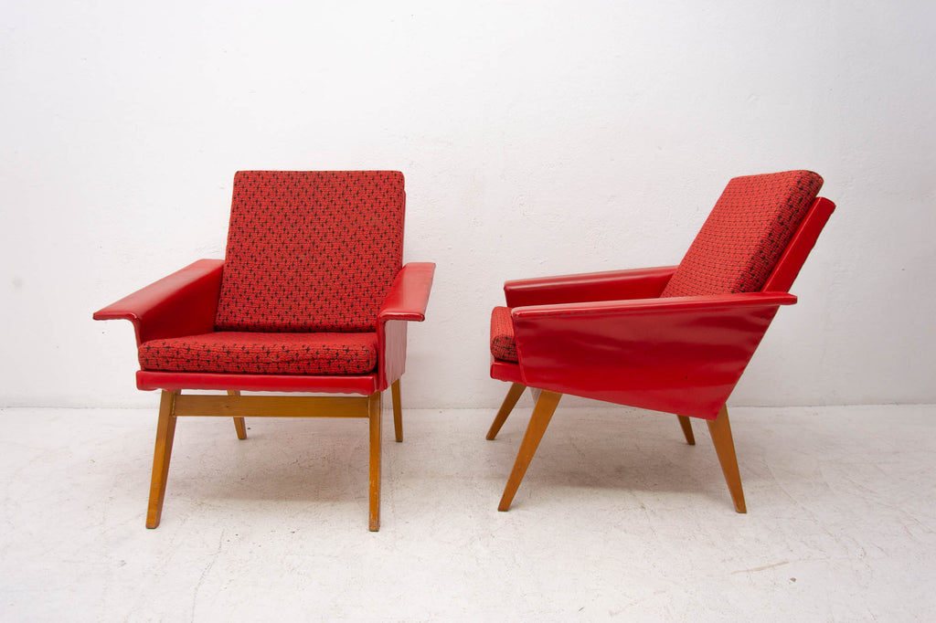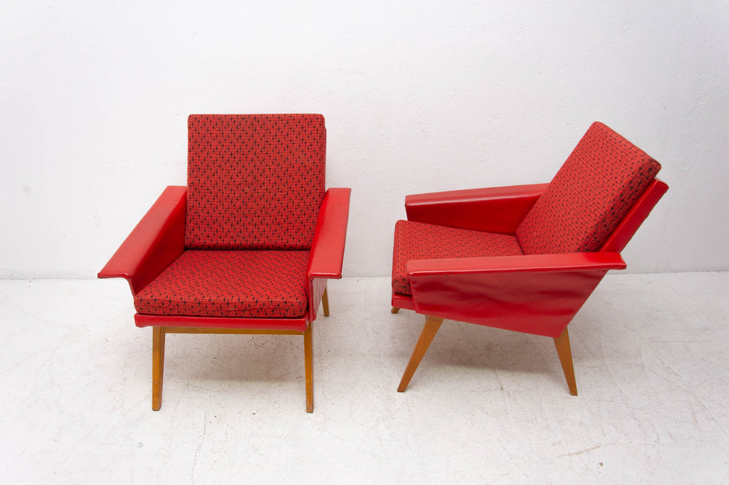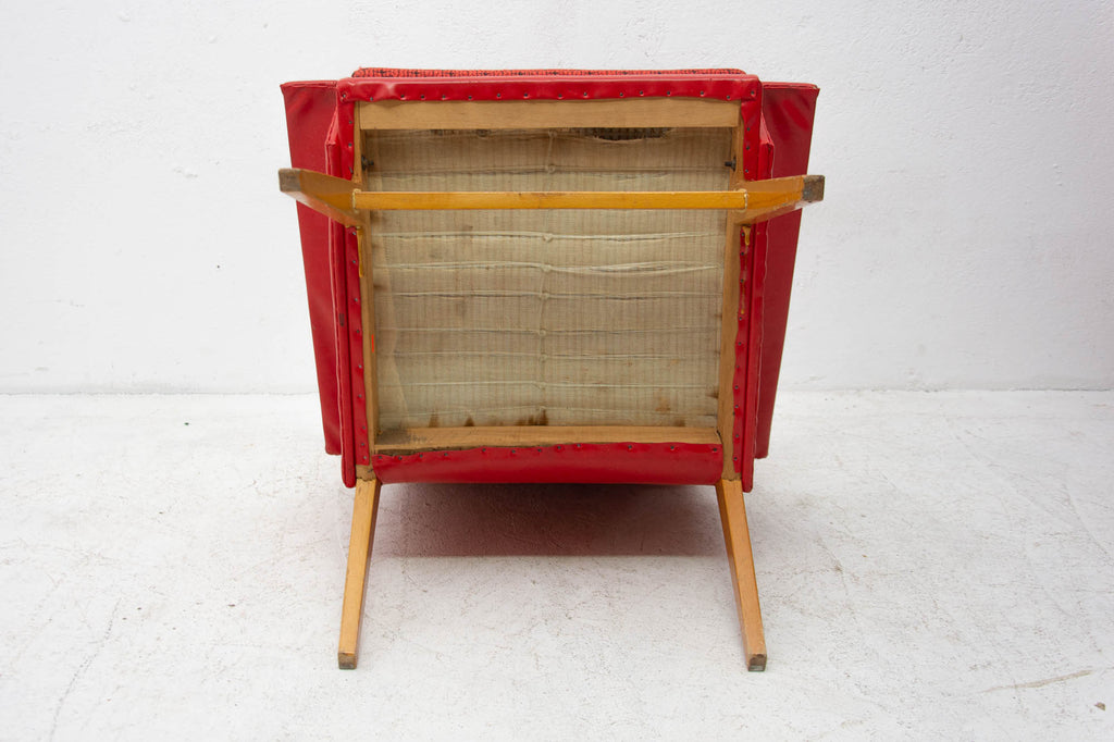 These lounge armchairs were made in the former Czechoslovakia in the 1960´s. It´s covered with burgundy leatherette. The legs are made of beech. In very good condition, small signs of age and using in the form of small cracks or scratches.