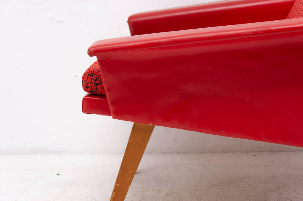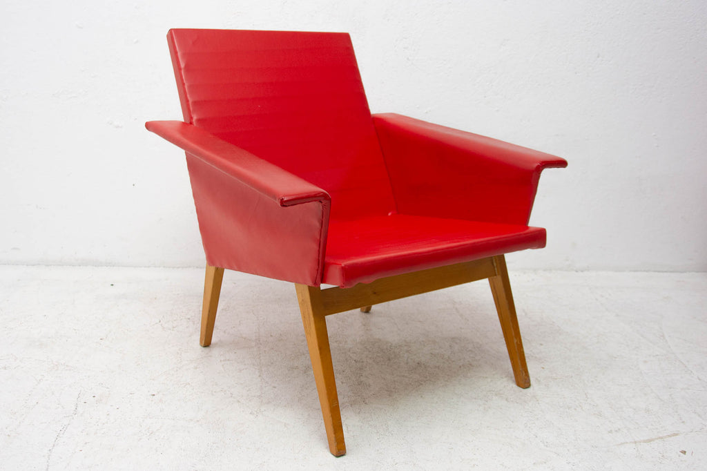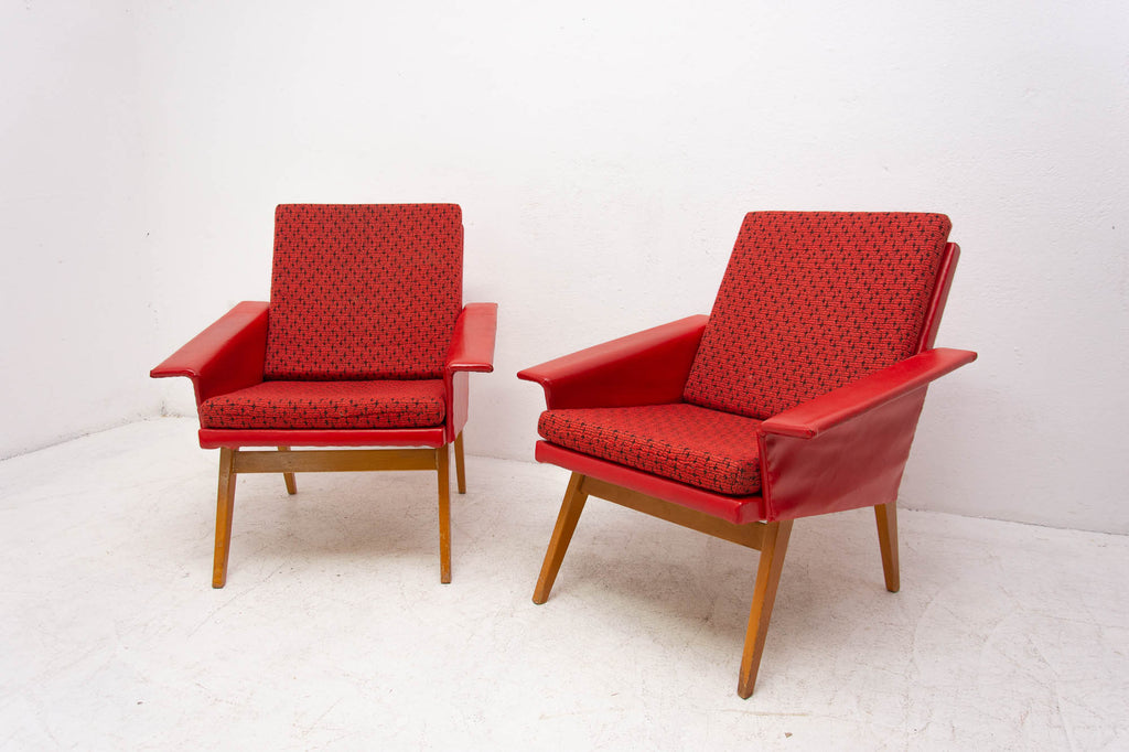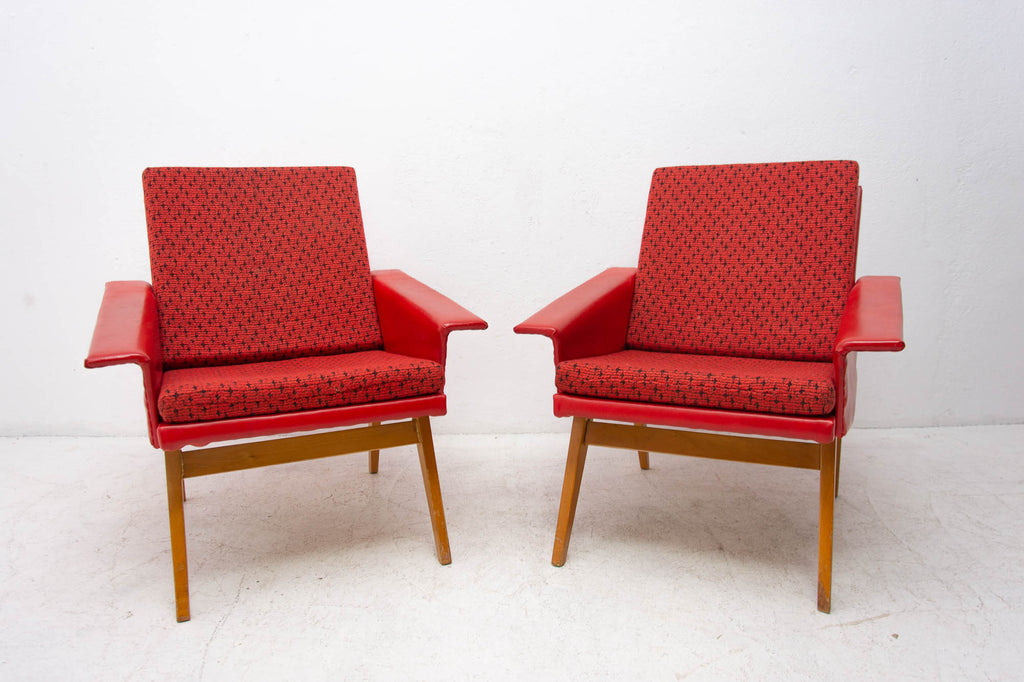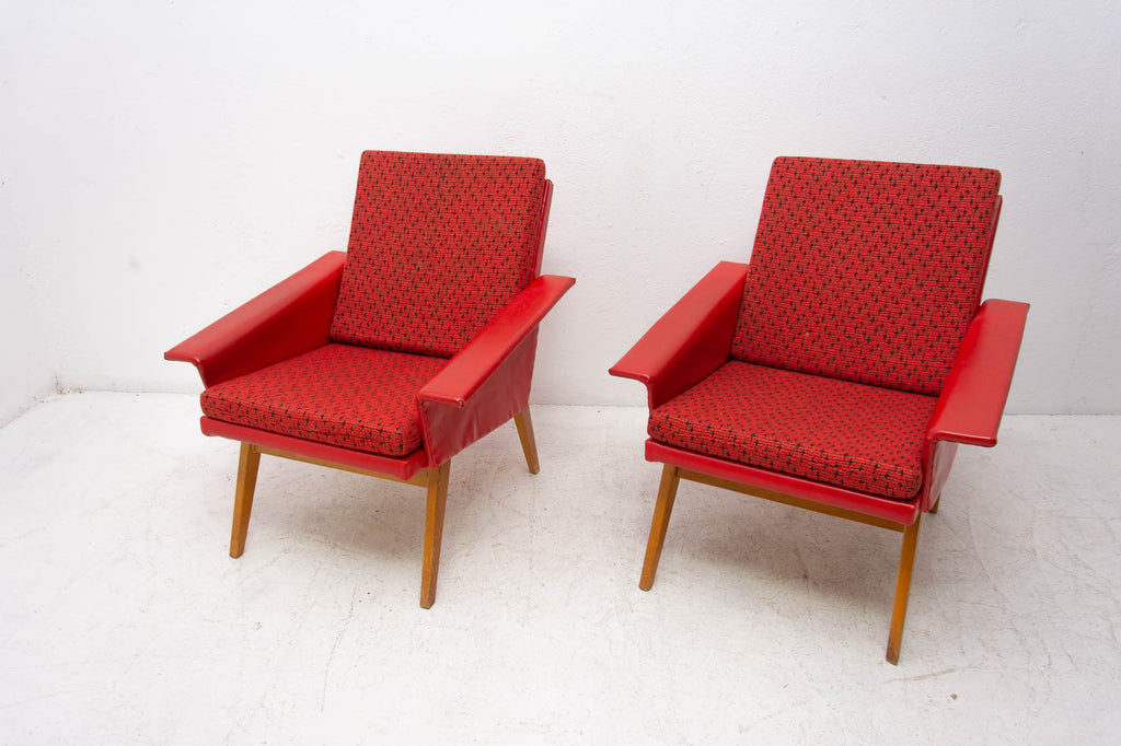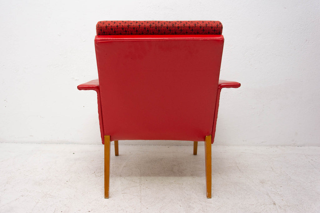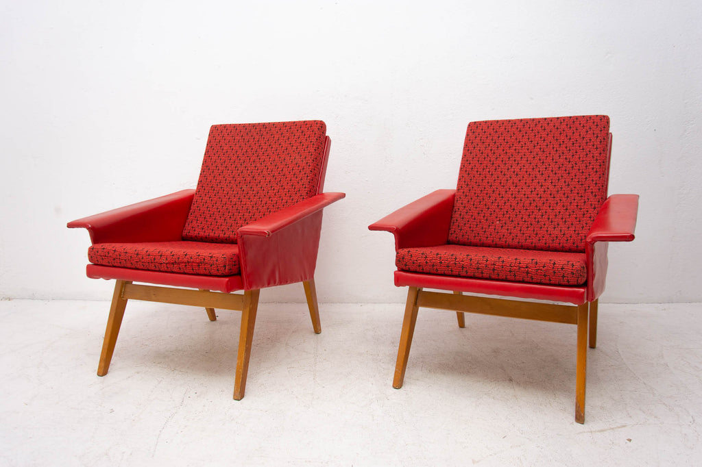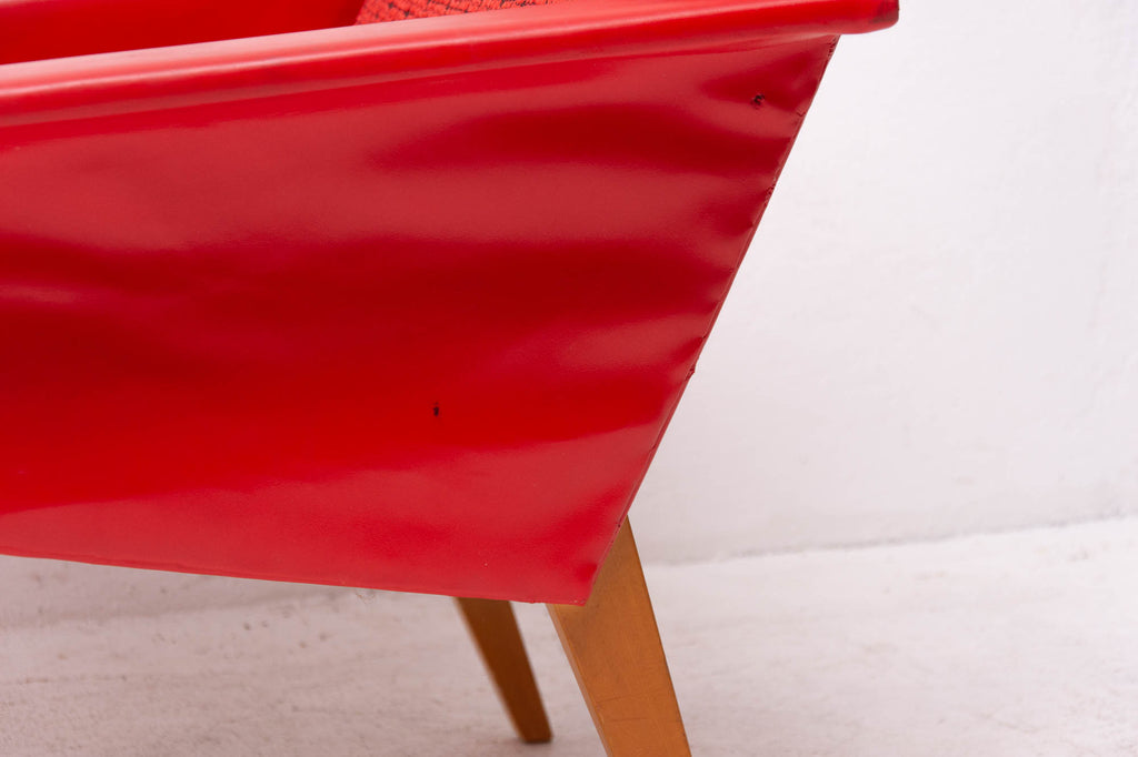 These lounge armchairs were made in the former Czechoslovakia in the 1960´s. It´s covered with burgundy leatherette. The legs are made of beech. In very good condition, small signs of age and using in the form of small cracks or scratches.