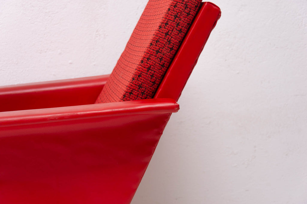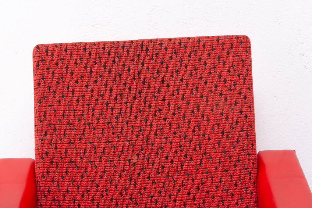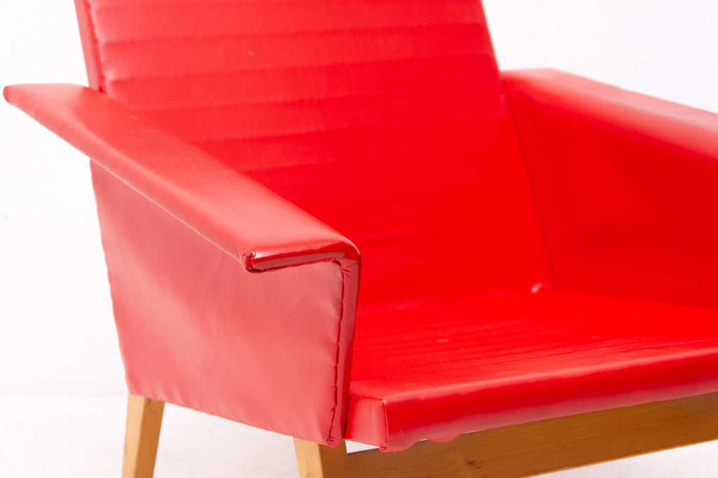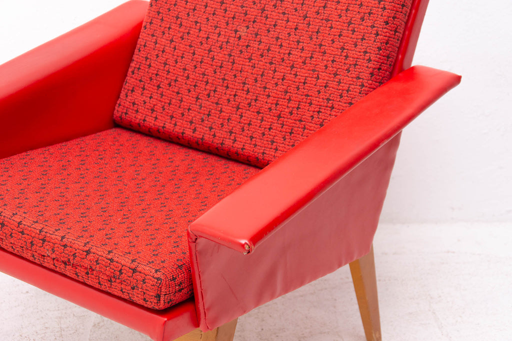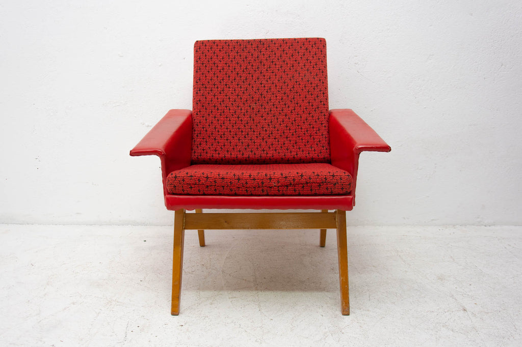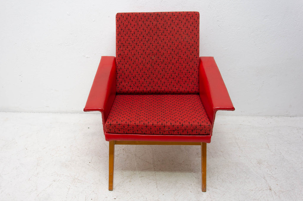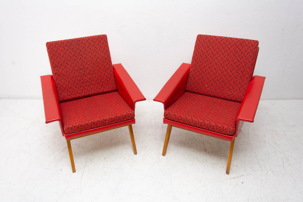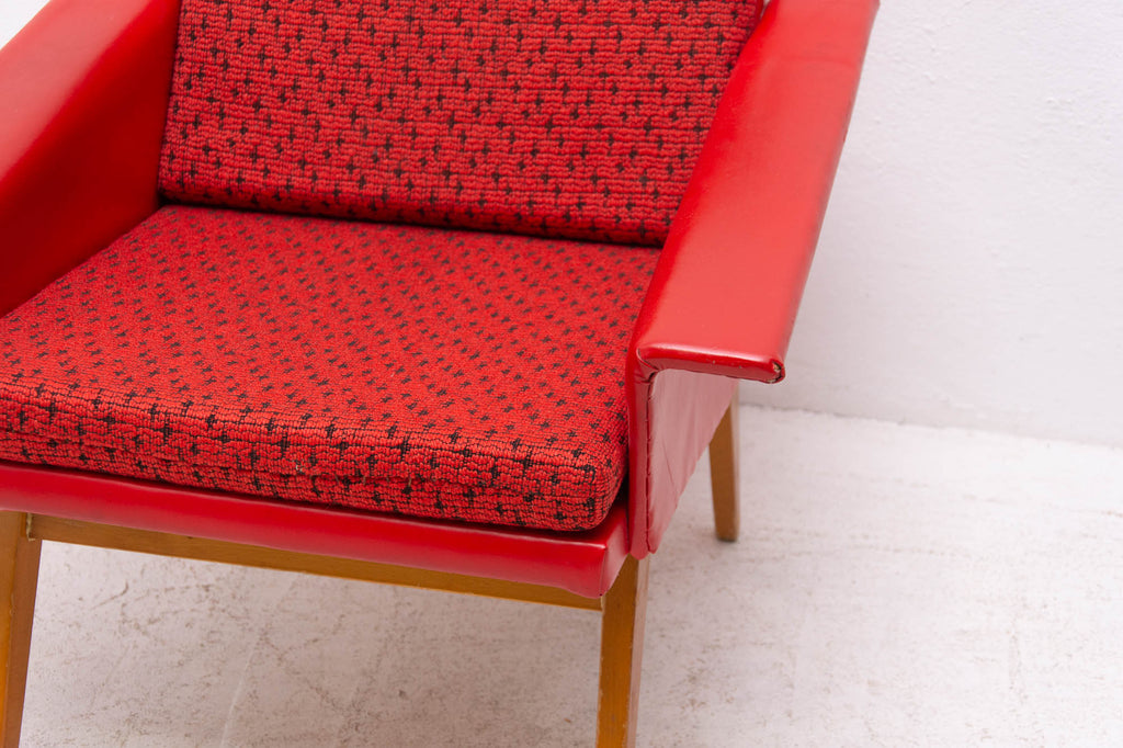 These lounge armchairs were made in the former Czechoslovakia in the 1960´s. It´s covered with burgundy leatherette. The legs are made of beech. In very good condition, small signs of age and using in the form of small cracks or scratches.