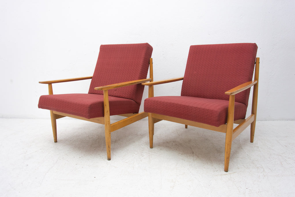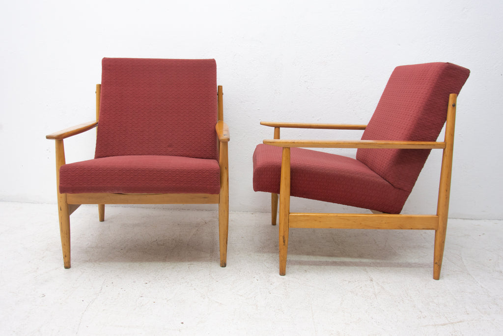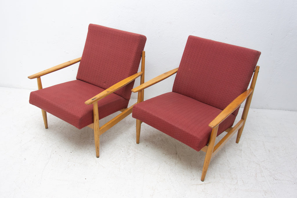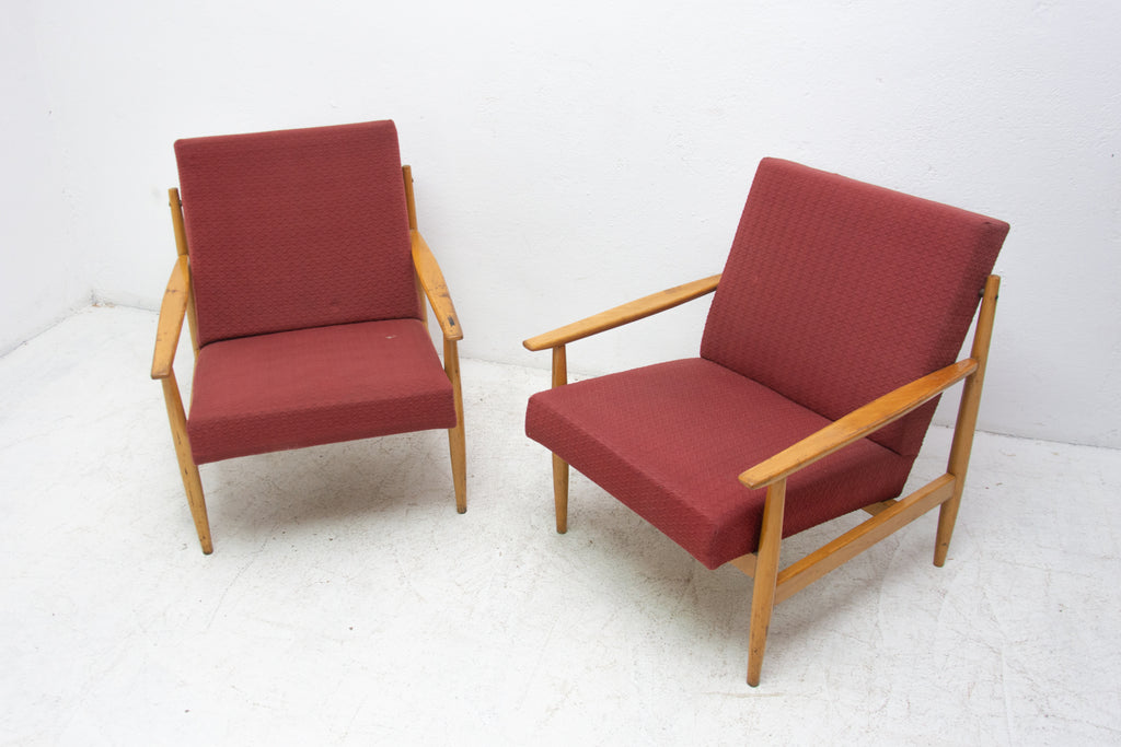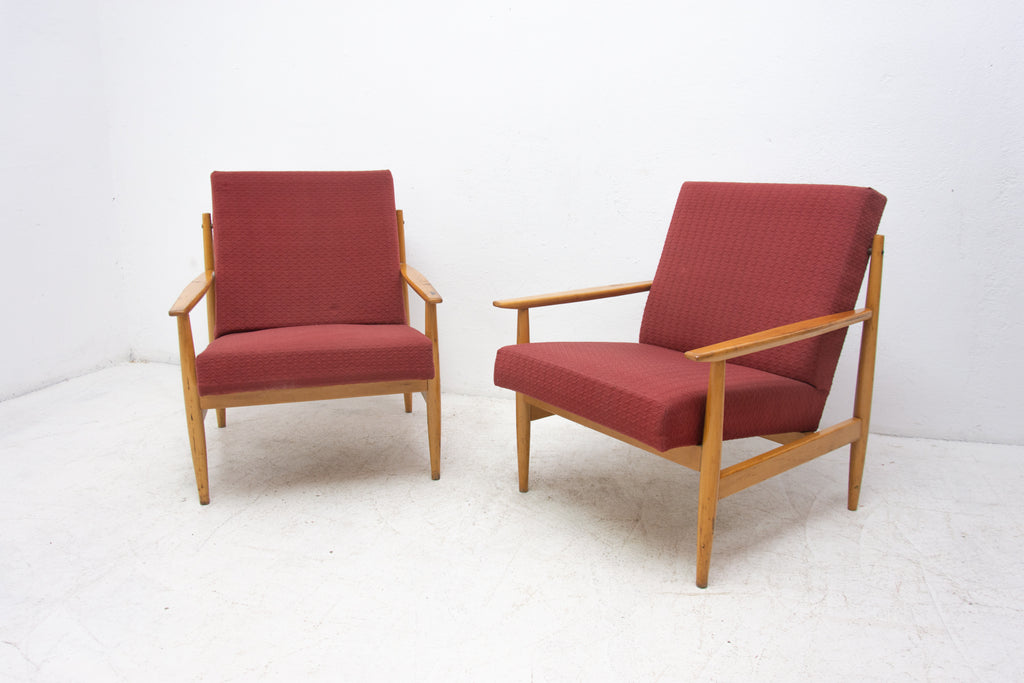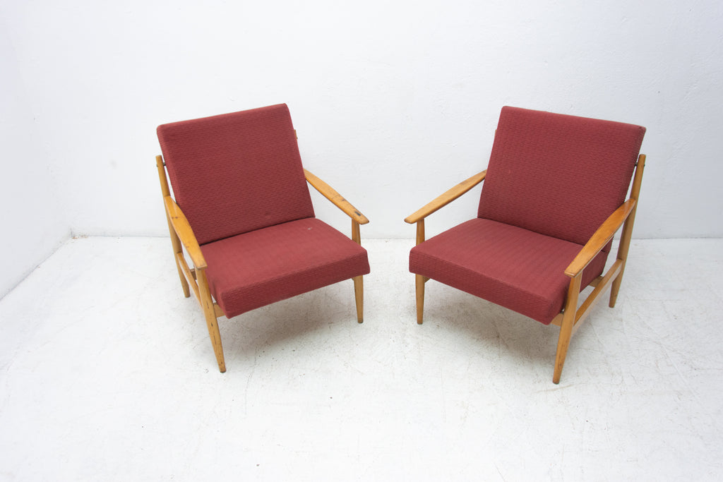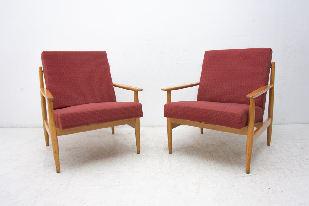 A pair of mid century armchairs in Scandinavian style, made in the former Czechoslovakia by TON company in the 1970´s. It has a beechwood structure and original upholstery in good Vintage condition. The chairs are fully functional, showing signs of age and using. Overall in very good condition. Price is for the pair