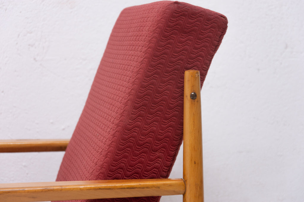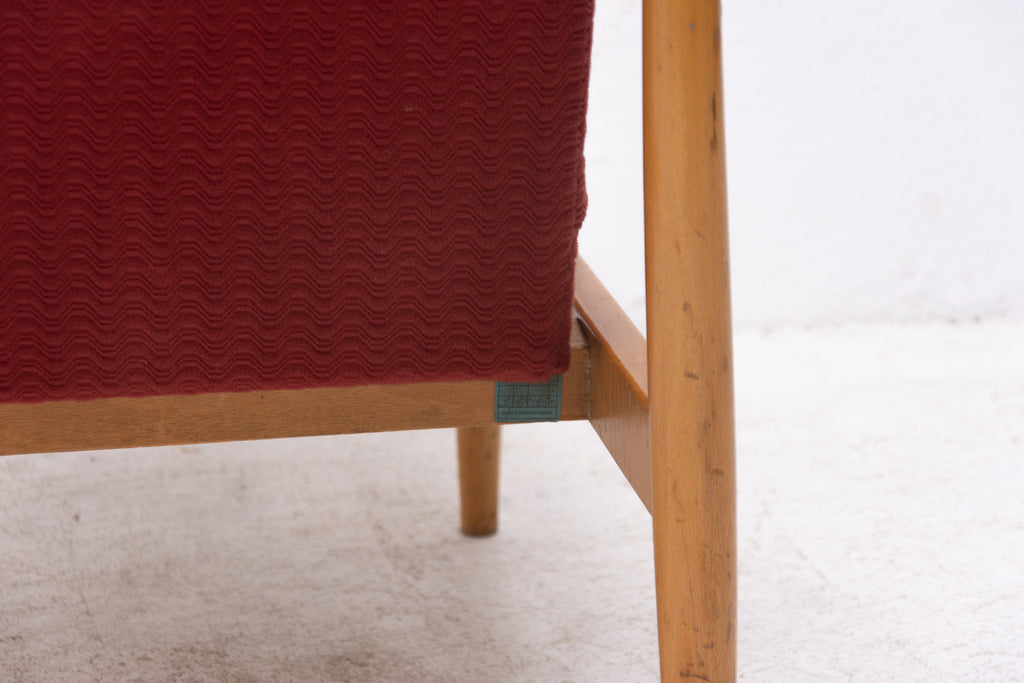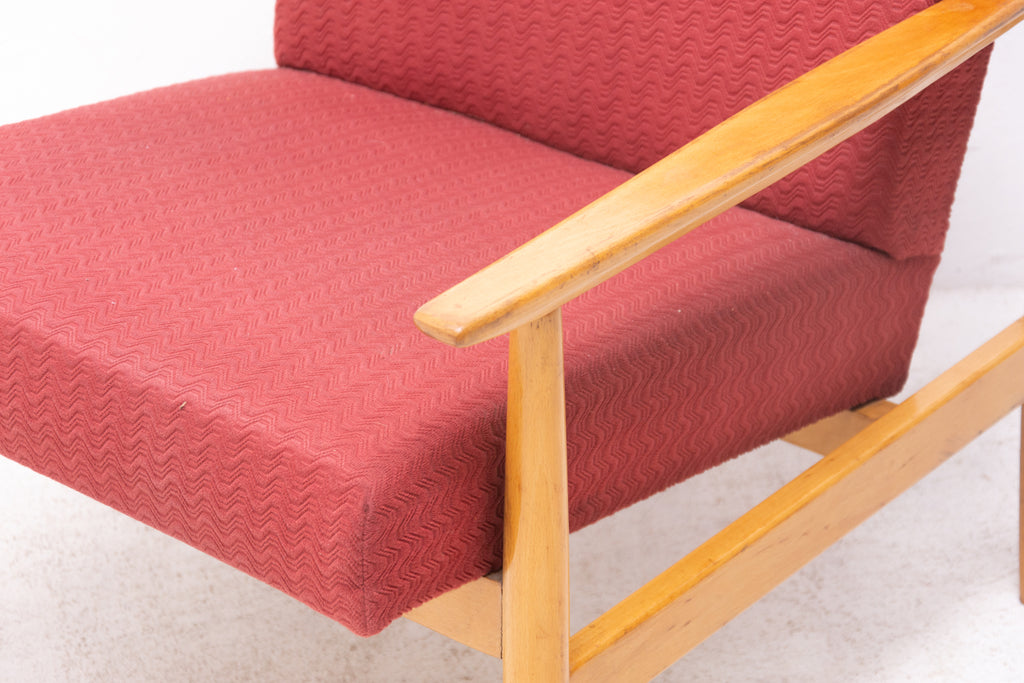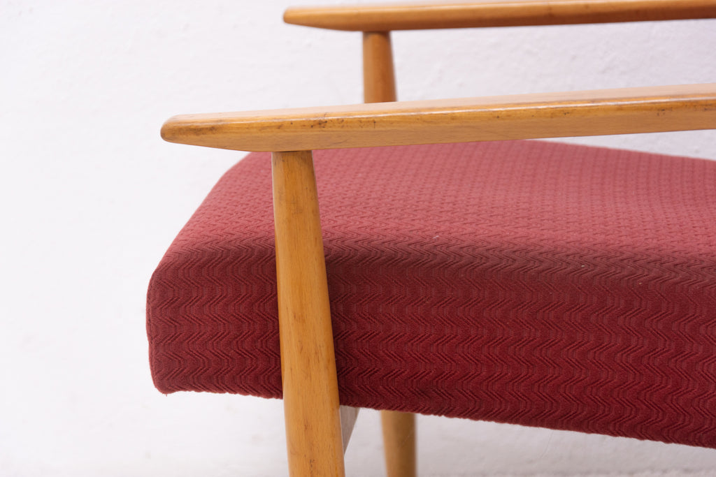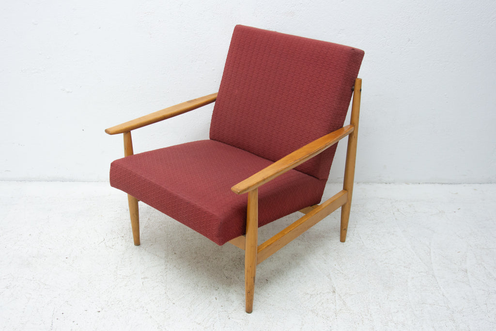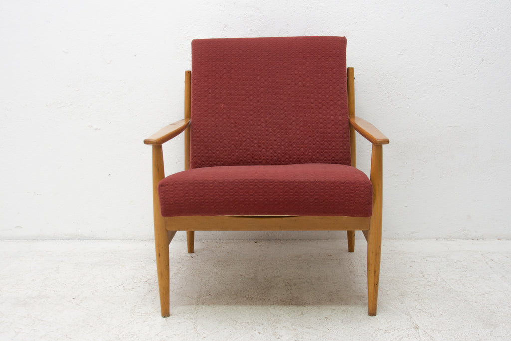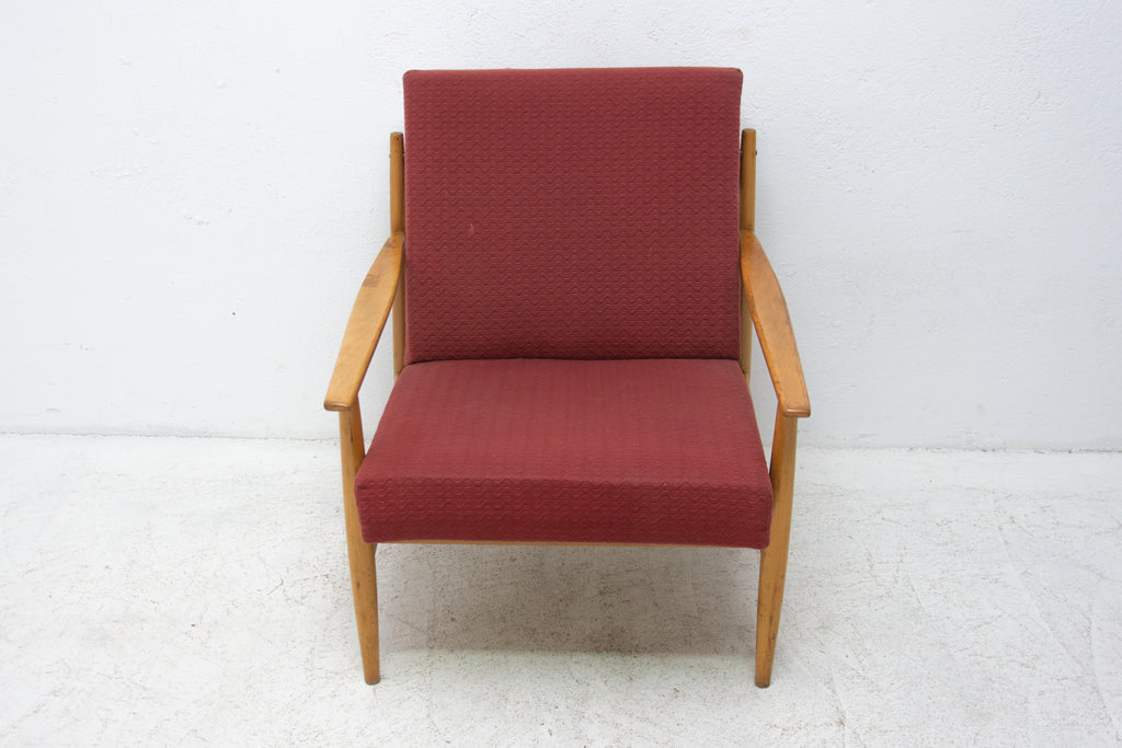A pair of mid century armchairs in Scandinavian style, made in the former Czechoslovakia by TON company in the 1970´s. It has a beechwood structure and original upholstery in good Vintage condition. The chairs are fully functional, showing signs of age and using. Overall in very good condition. Price is for the pair