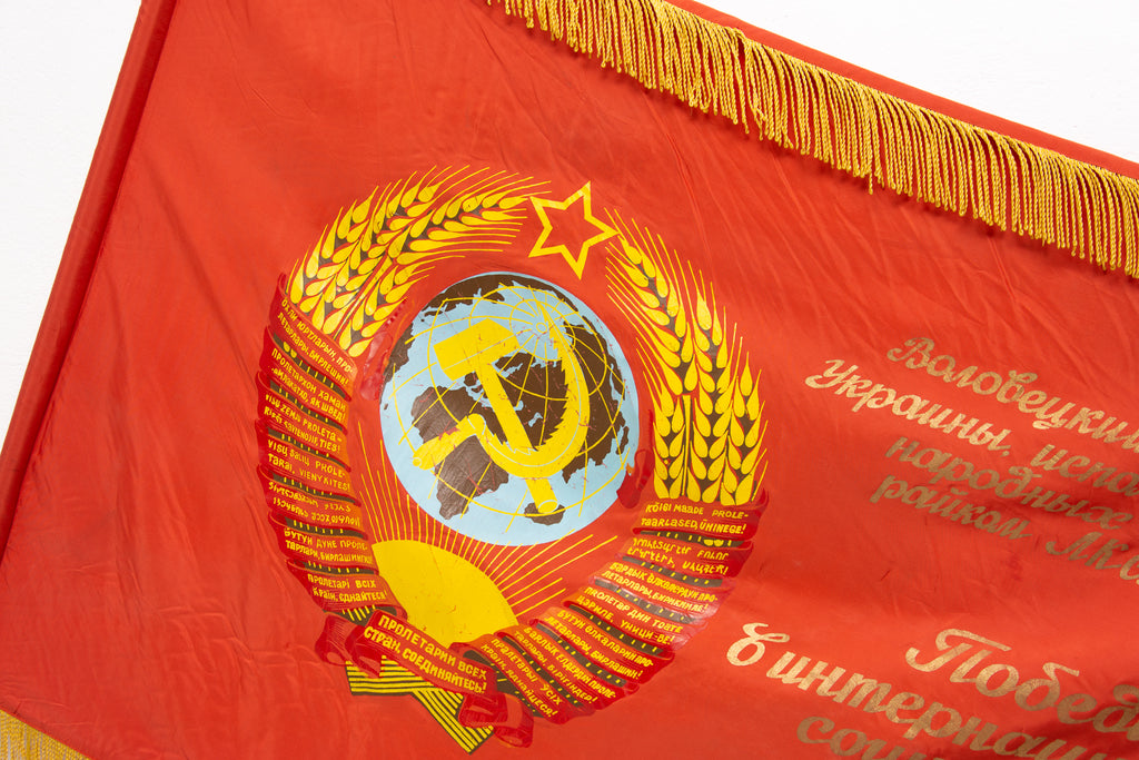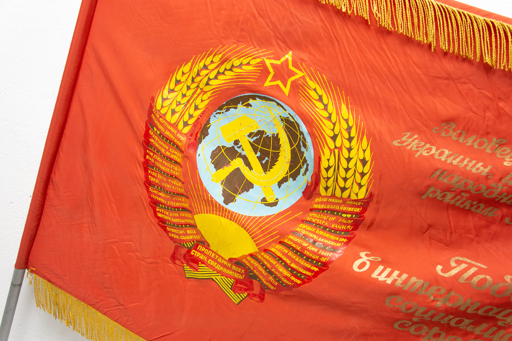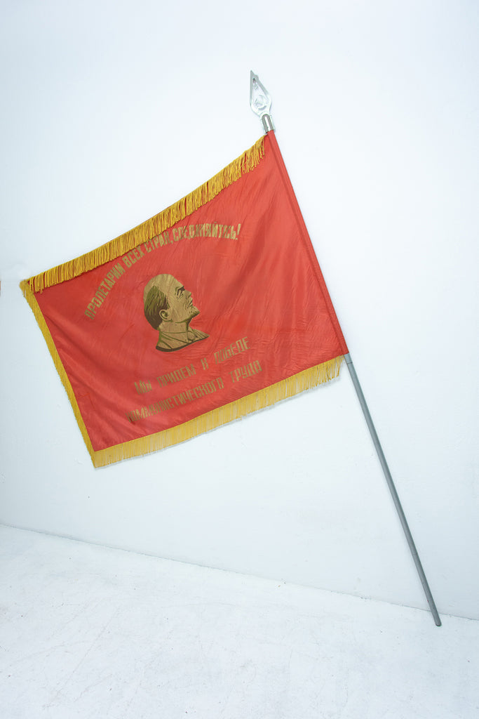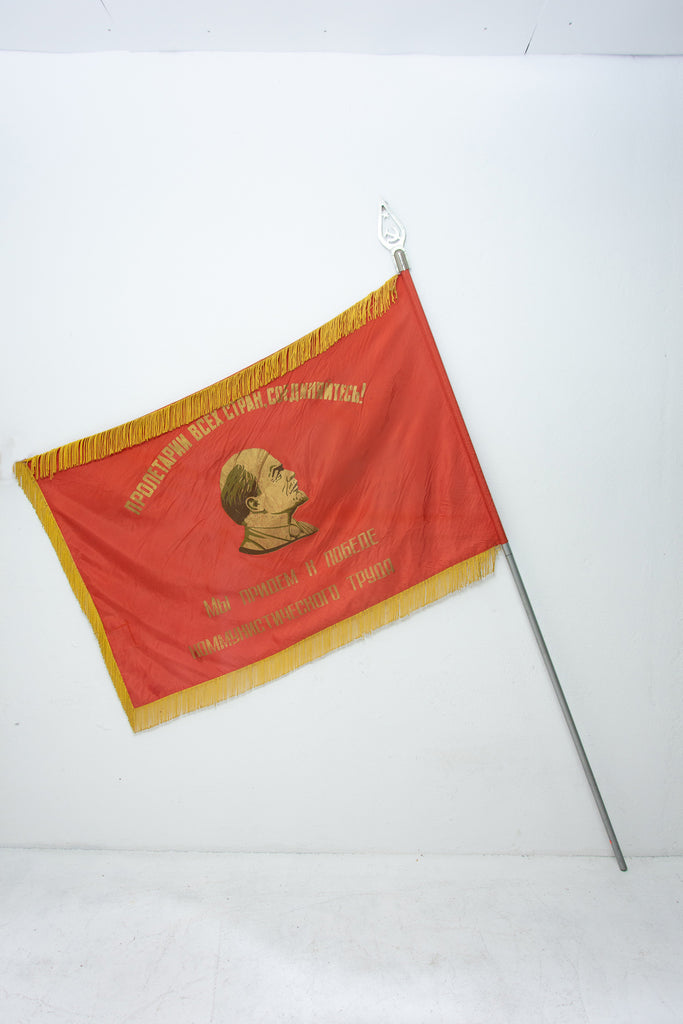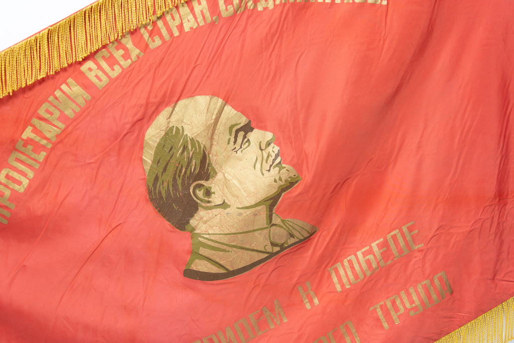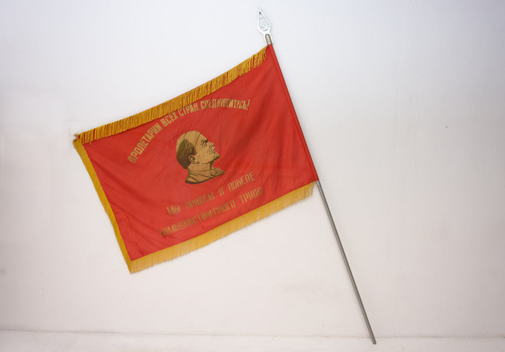 Old original flag from 1950´s with a portrait of Vladimir Ilyich Lenin. The slogan "пролетарии всех стран, объединяйтесь" - "Proletarians of all countries unite!" is written on the flag.