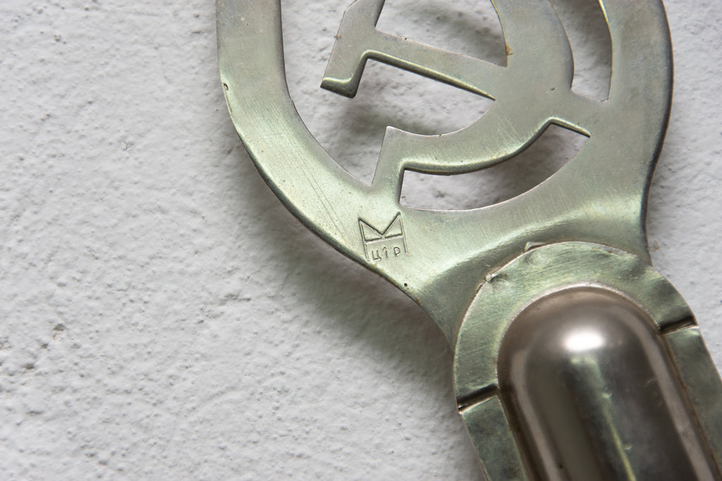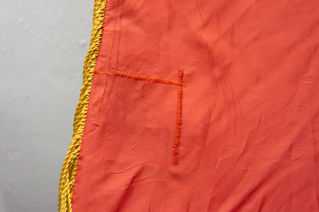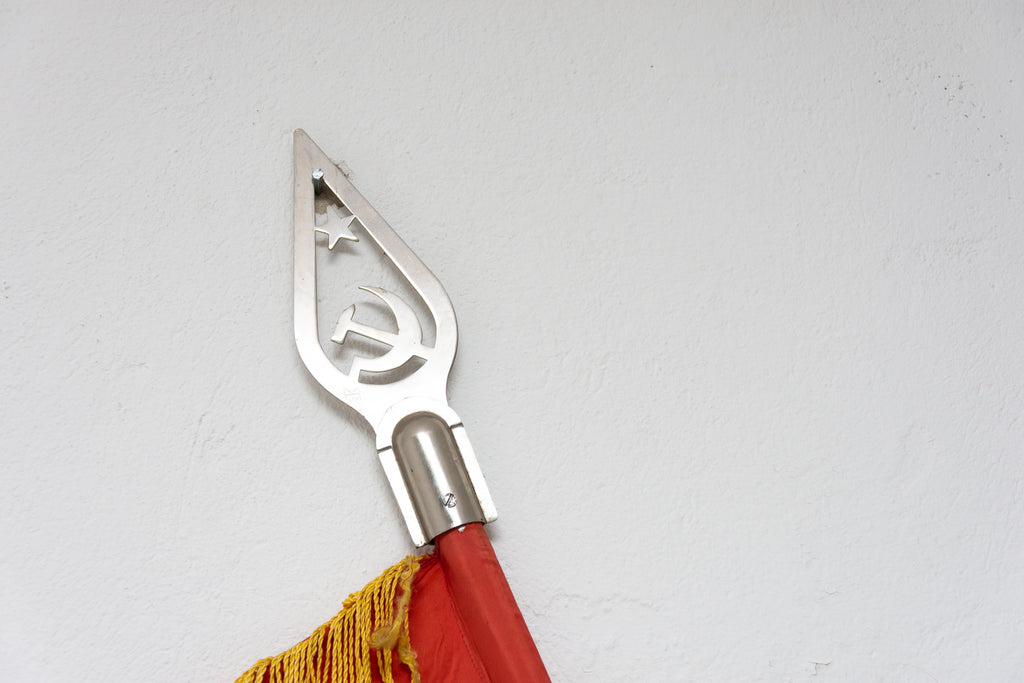The flag is in very good condition, it was torn in one place, but the seam is repaired. It is made of fabric with a metal holder, that is at its peak ended with the hammer and sickle.