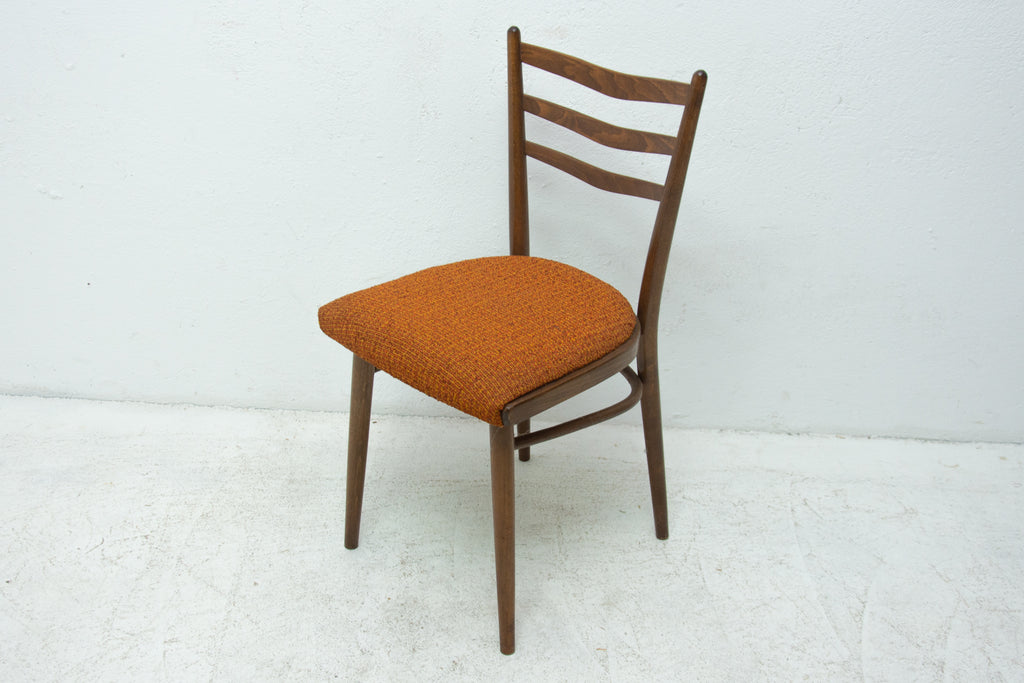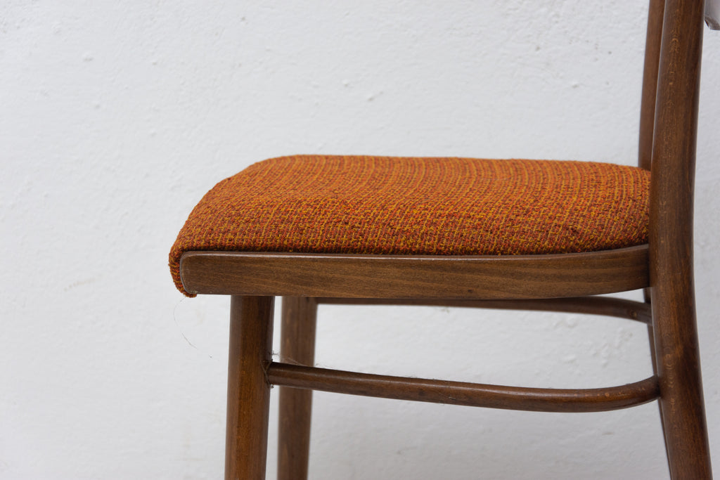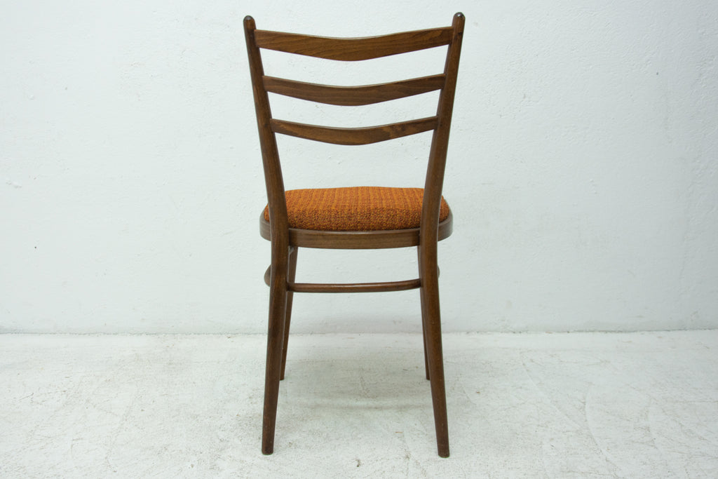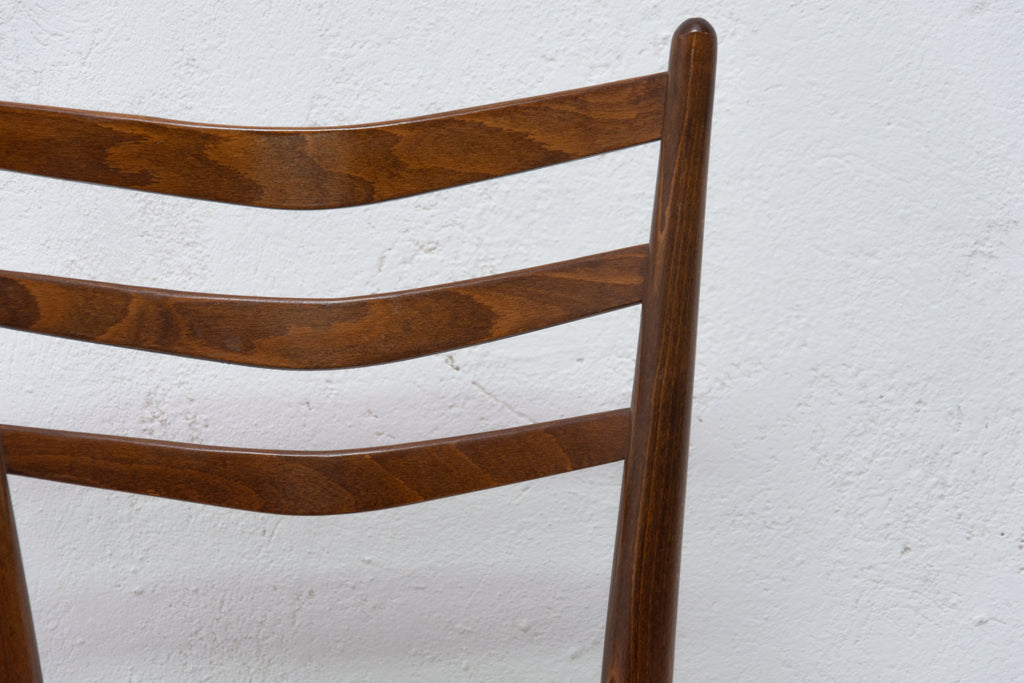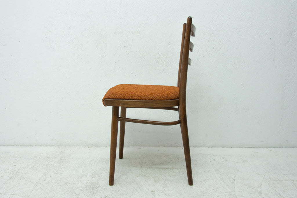 These Czechoslovak dining chairs were made in the 1960´s. It was produced by Univerzal Prostějov company. It´s made of dark stained beech wood.