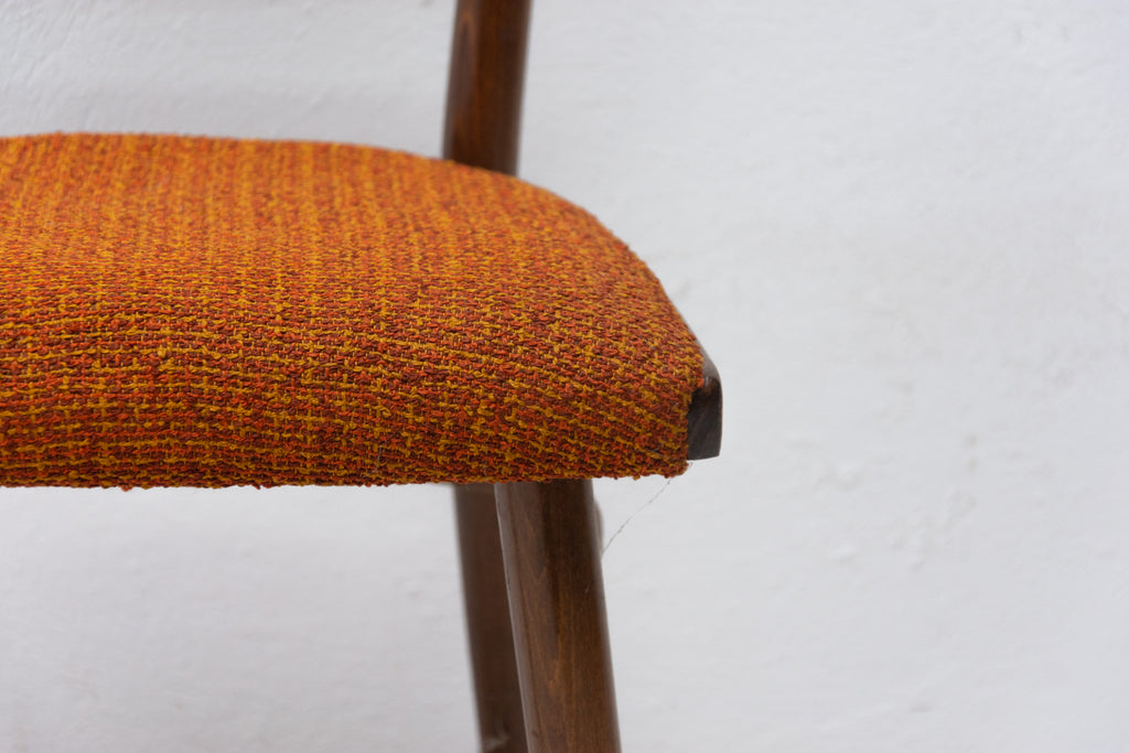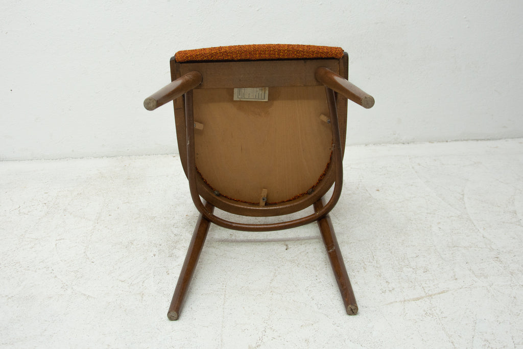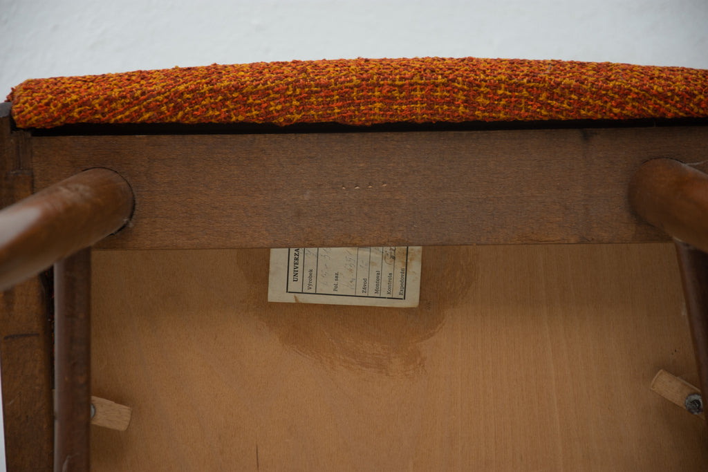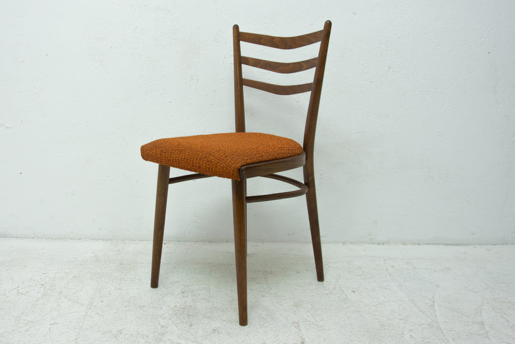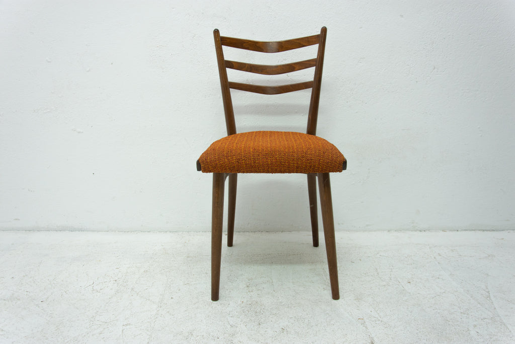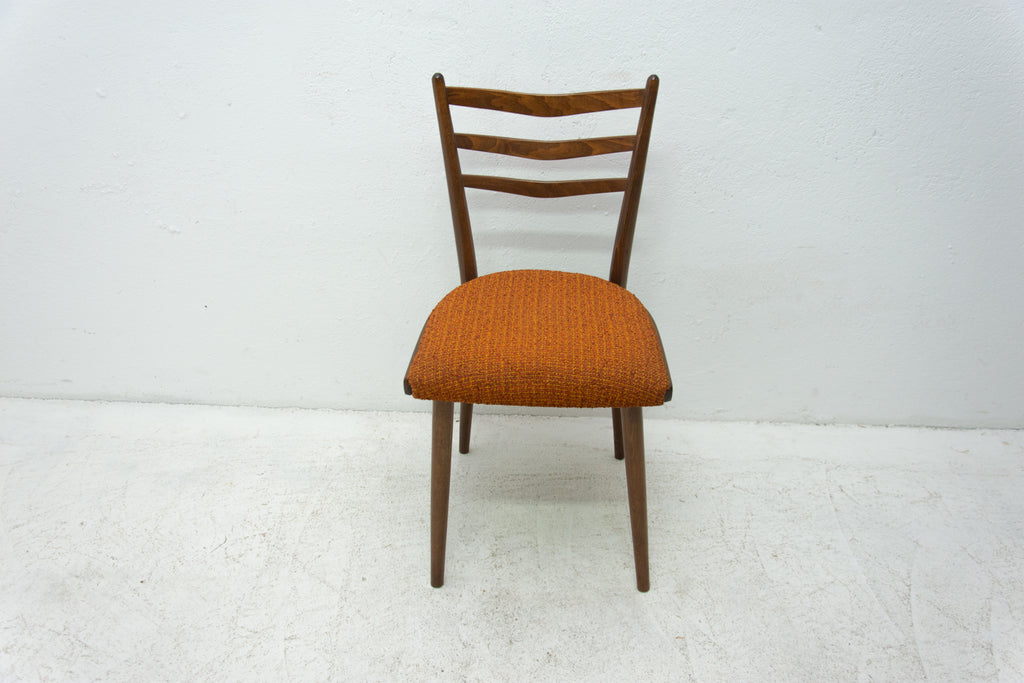 These Czechoslovak dining chairs were made in the 1960´s. It was produced by Univerzal Prostějov company. It´s made of dark stained beech wood.
