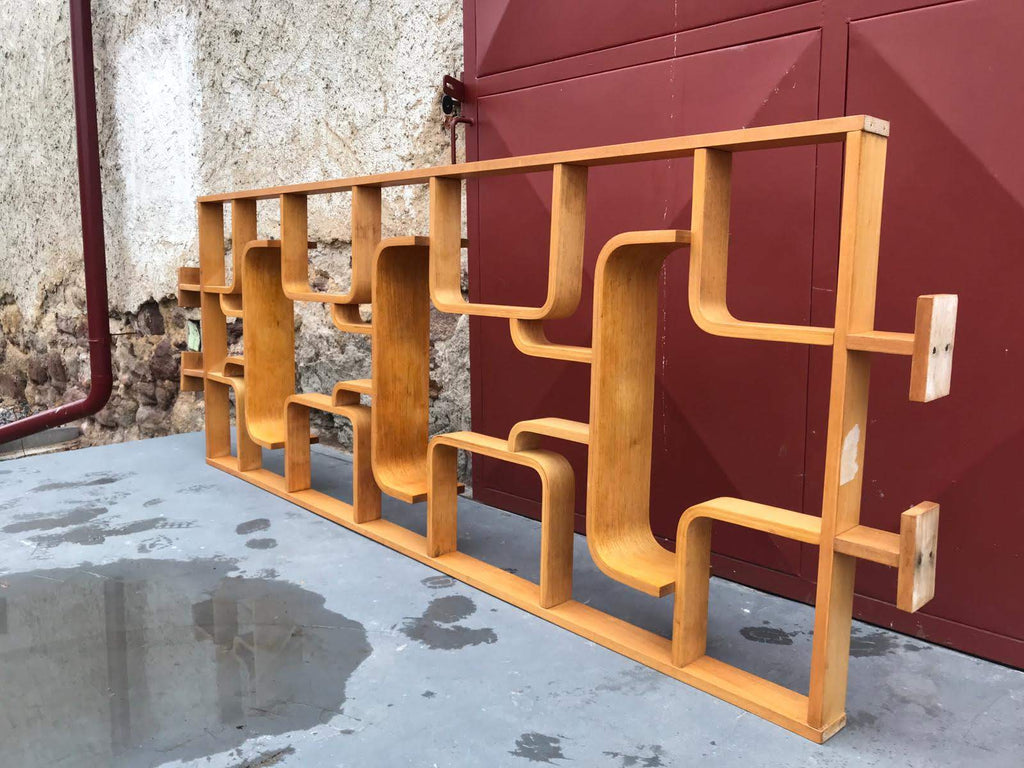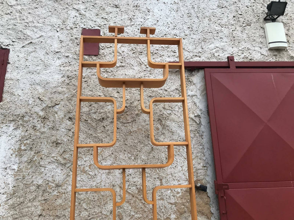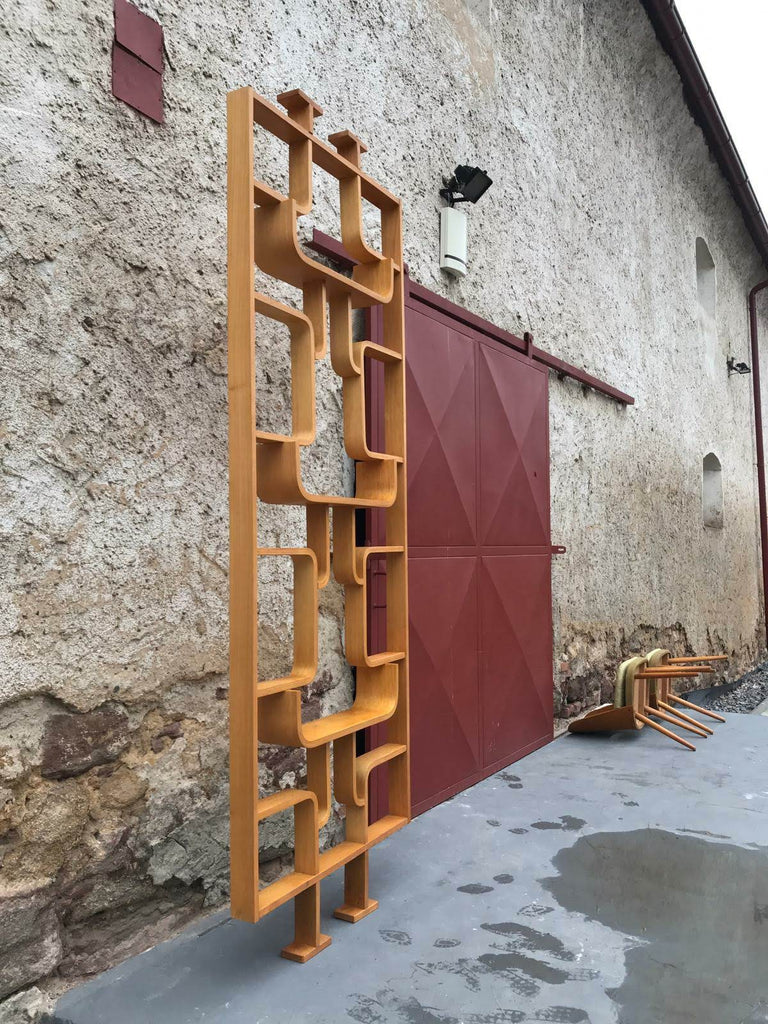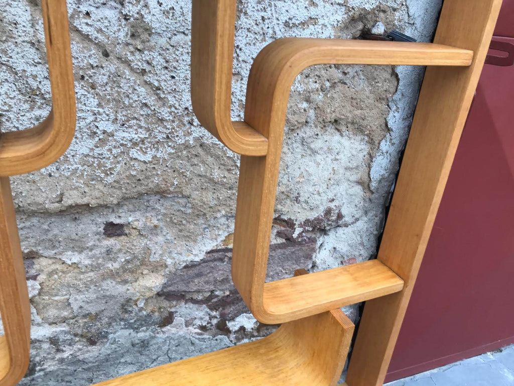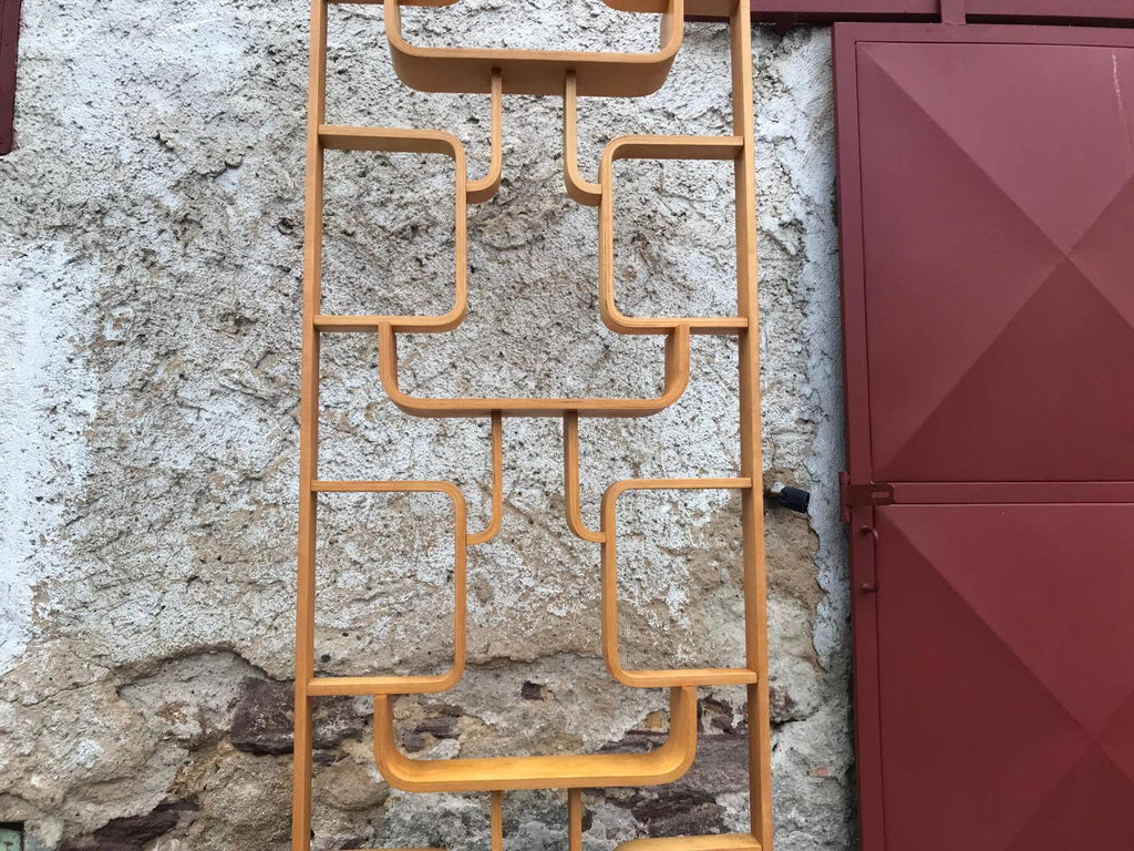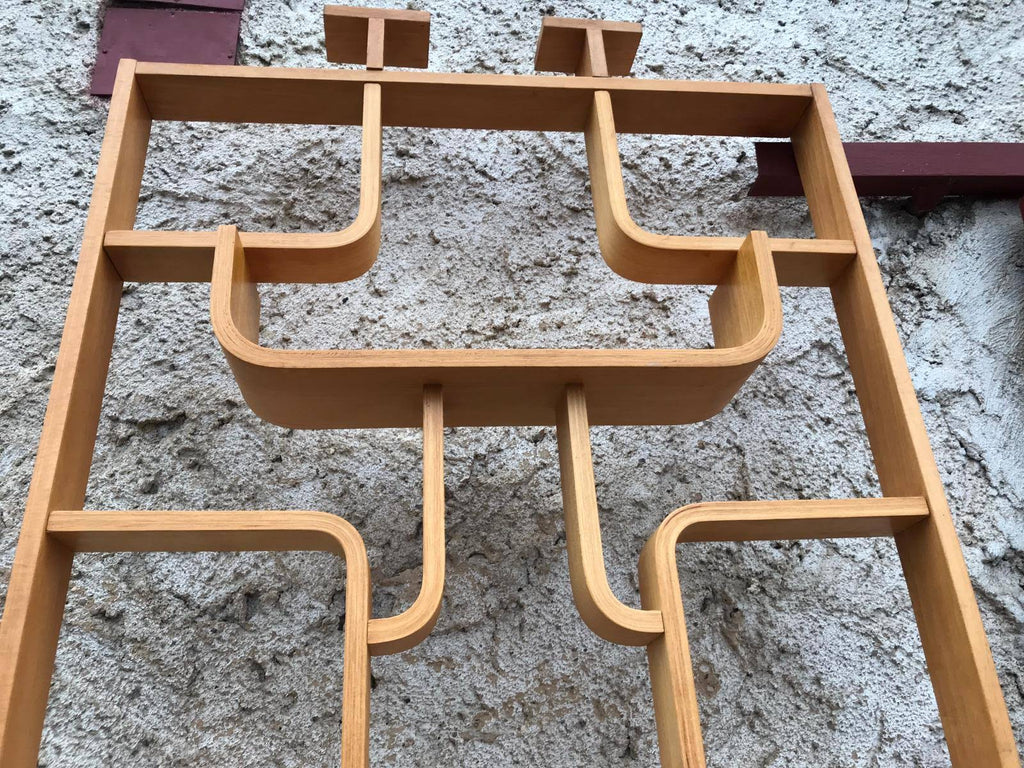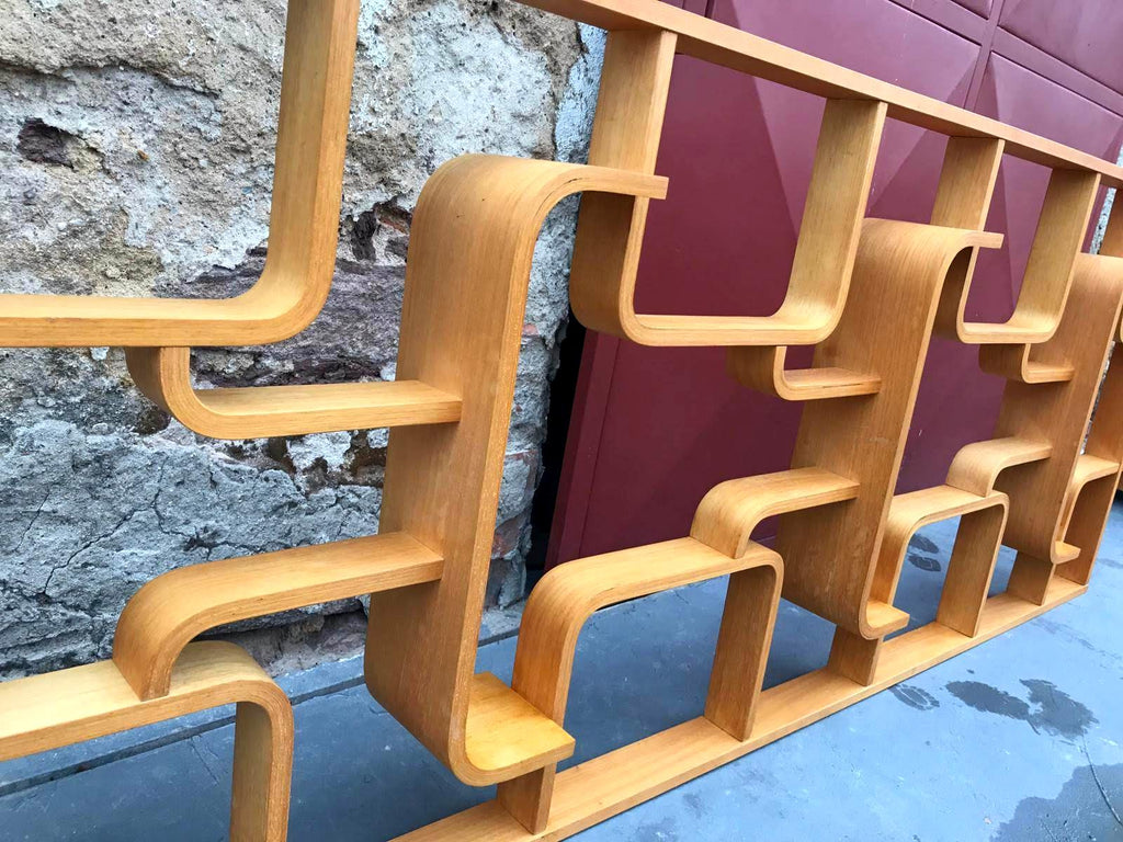 This room/wall divider was designed by the Czech architect Ludvik Volak and produced by Drevopodnik Holesov in the former Czechoslovakia in the 1960s. It features an ash veneered bent plywood structure with removable legs. The height without legs measures 225 cm and 255 cm with legs. It is in very good original condition.