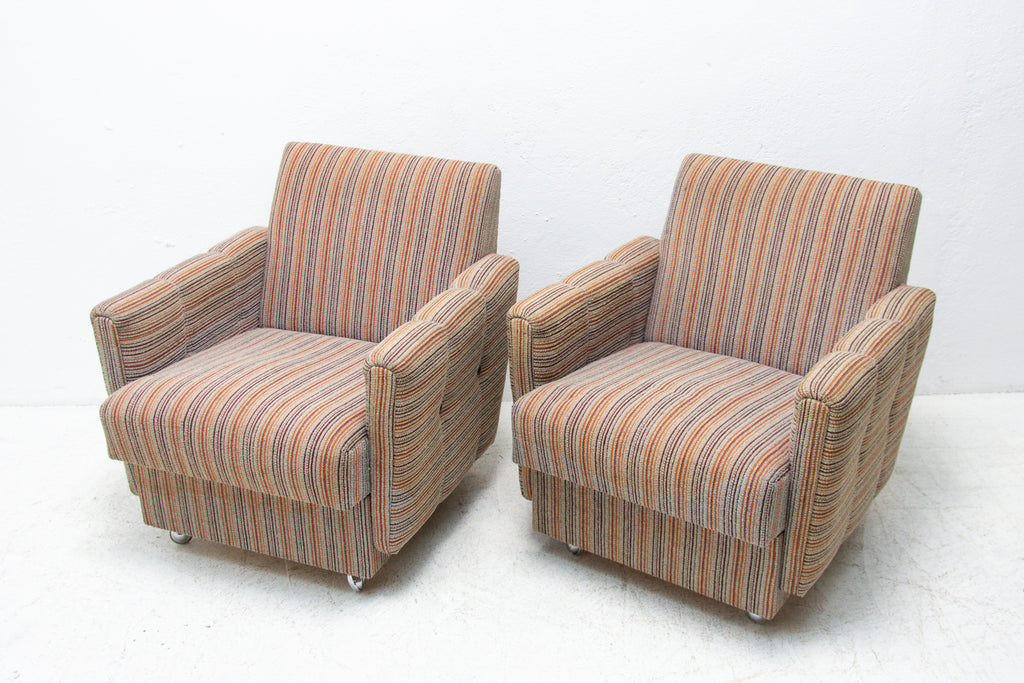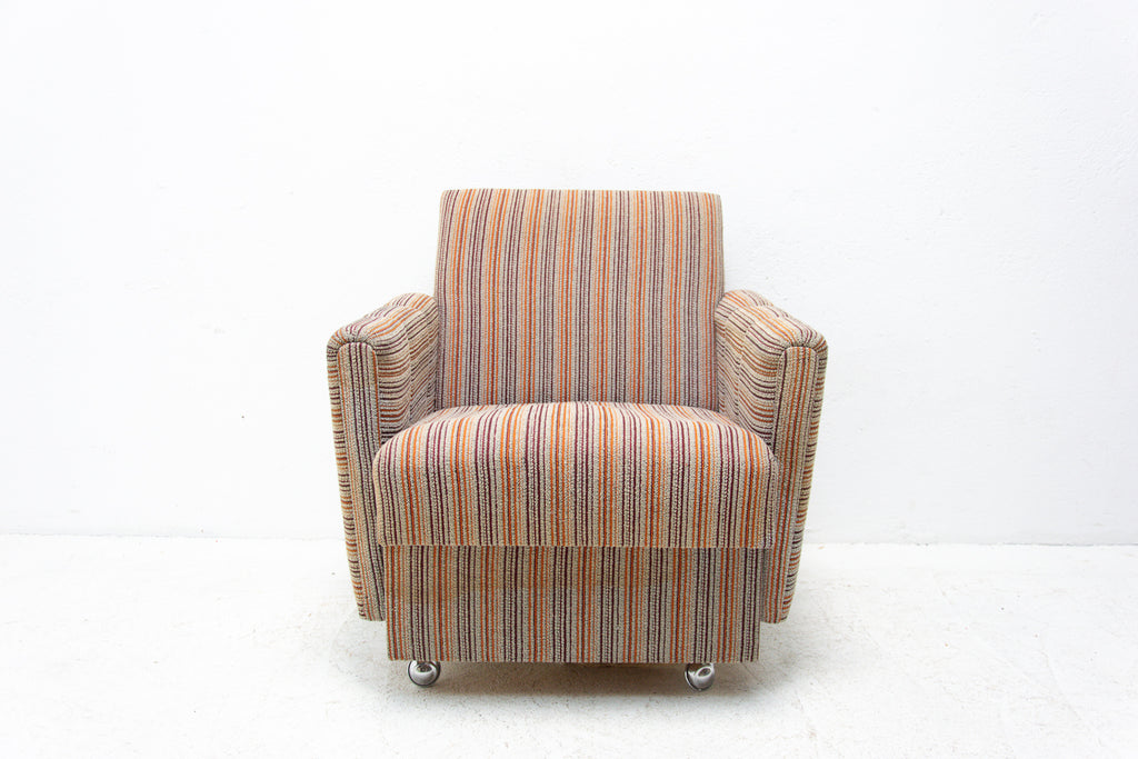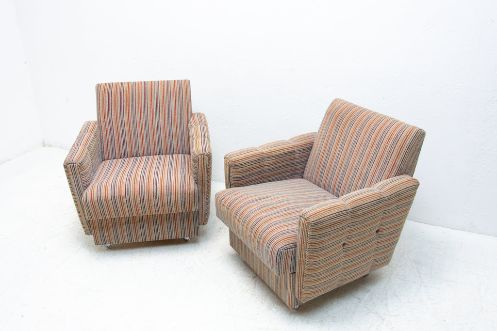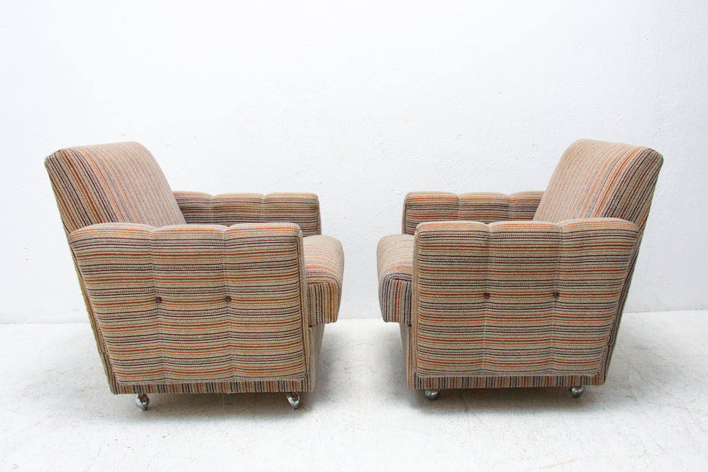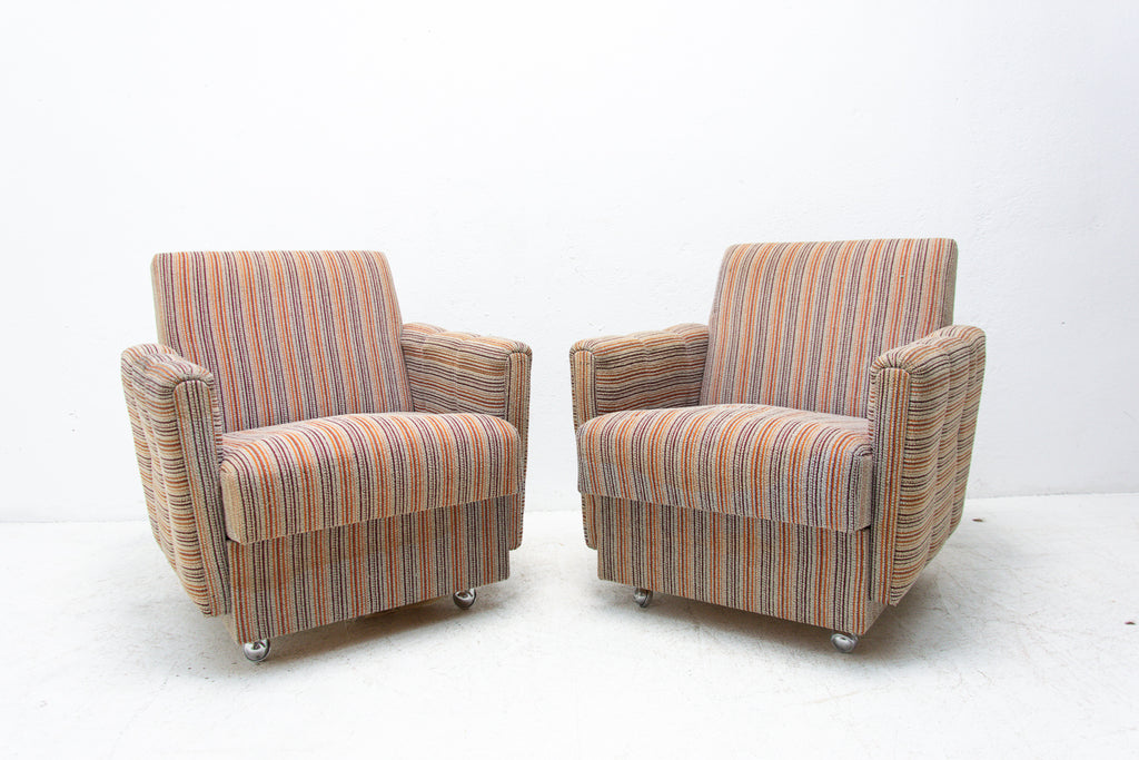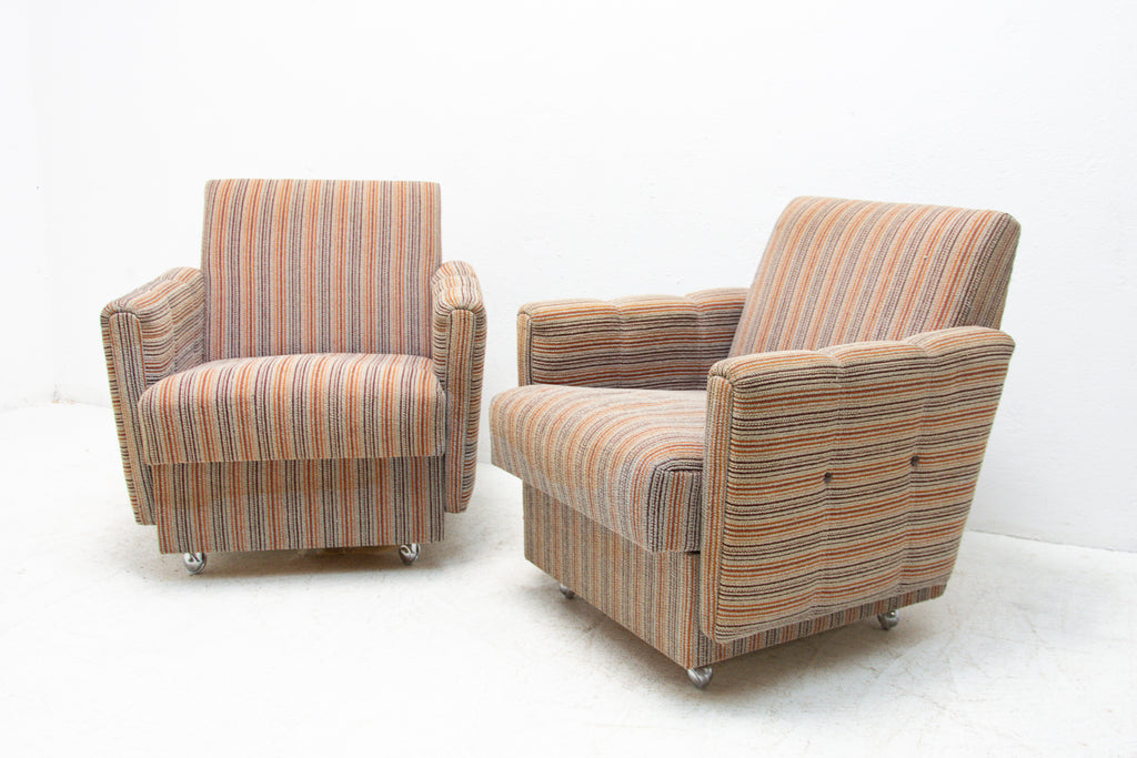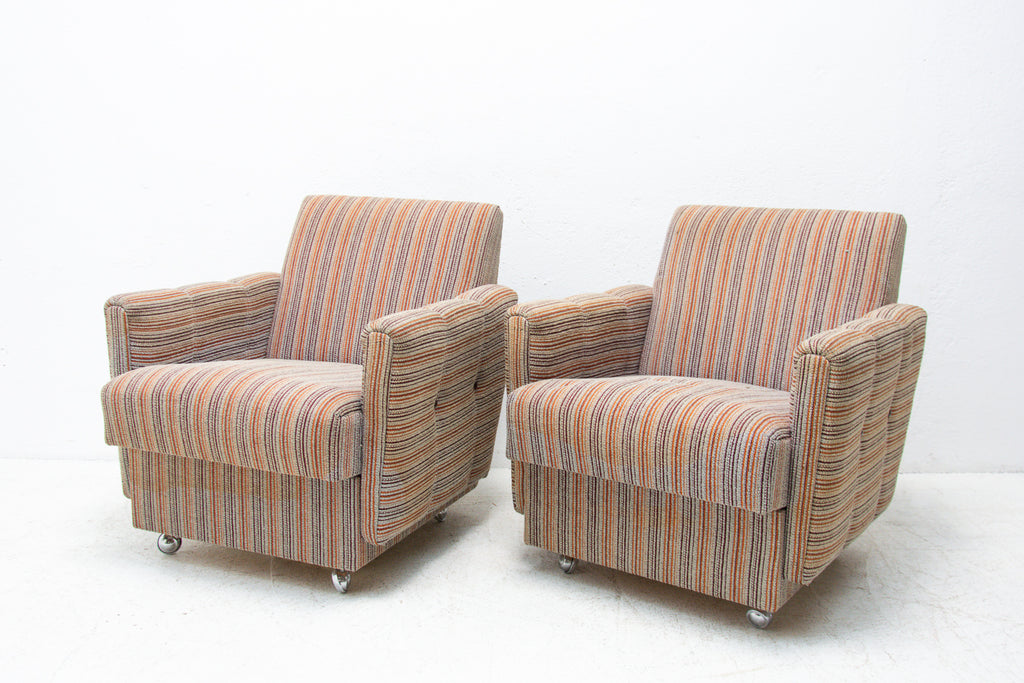 A pair of very comfortable Vintage upholstered armchairs on wheels, made by Dřevotvar company in the former Czechoslovakia in the 1980´s.