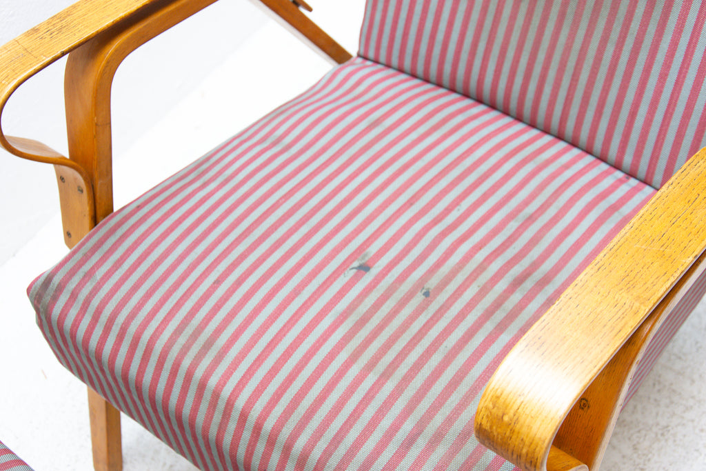 The armchairs features an original bent plywood armrests and the wooden structure is in beech veneer. The upholstery is in original condition and shows significant signs of age and using-suitable for renovation.