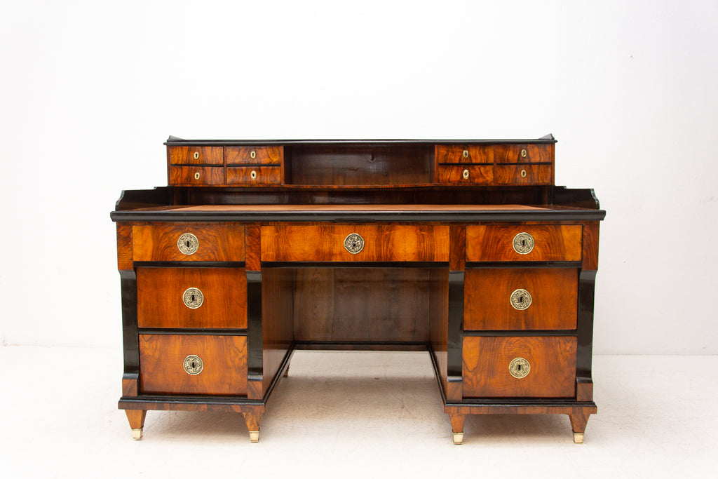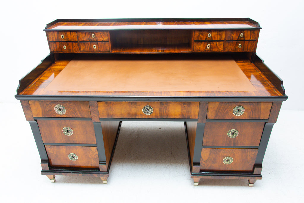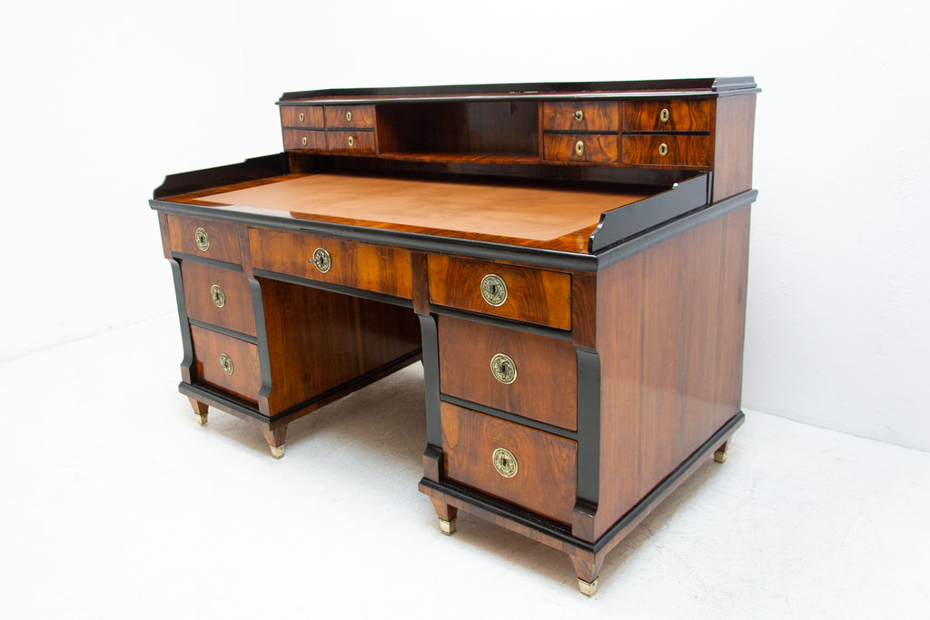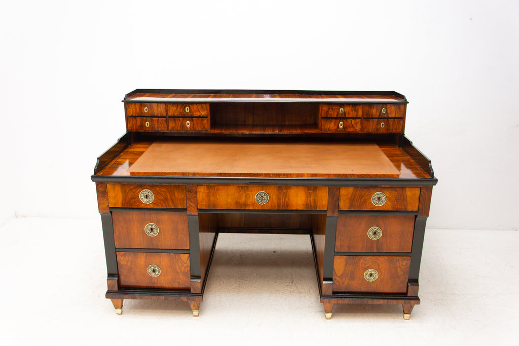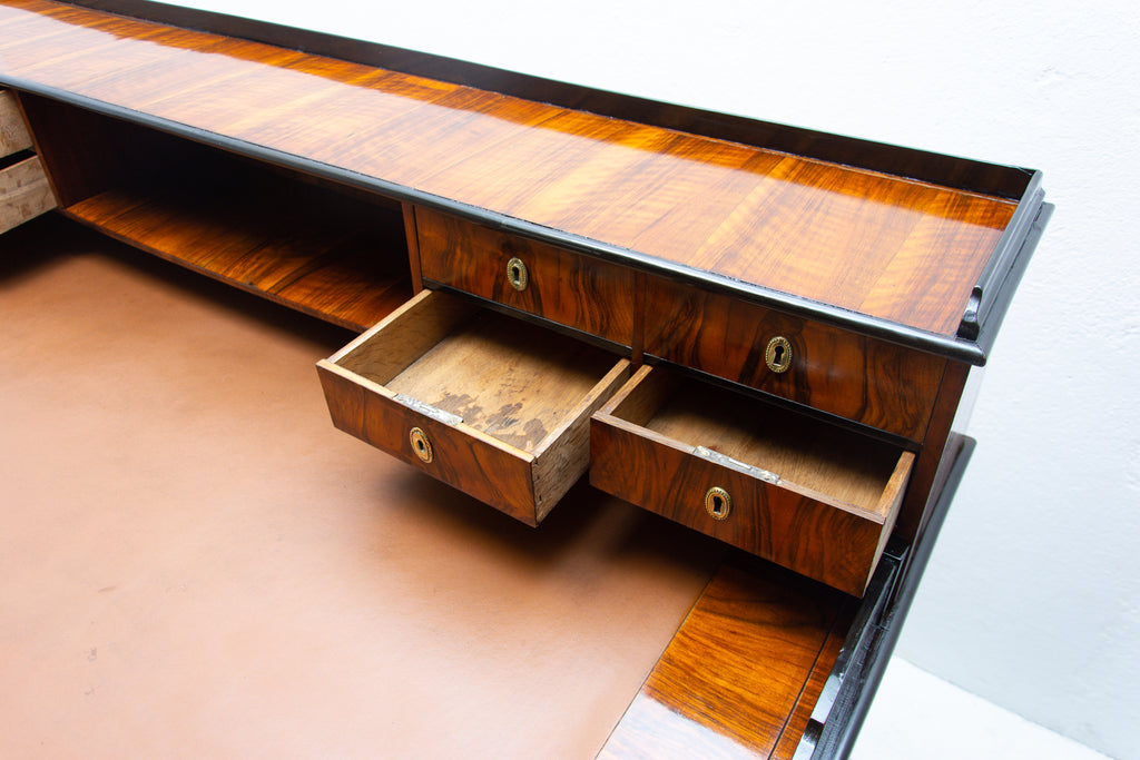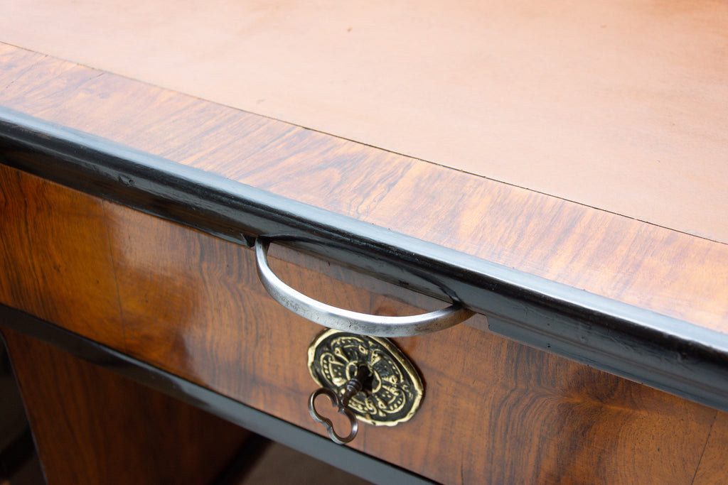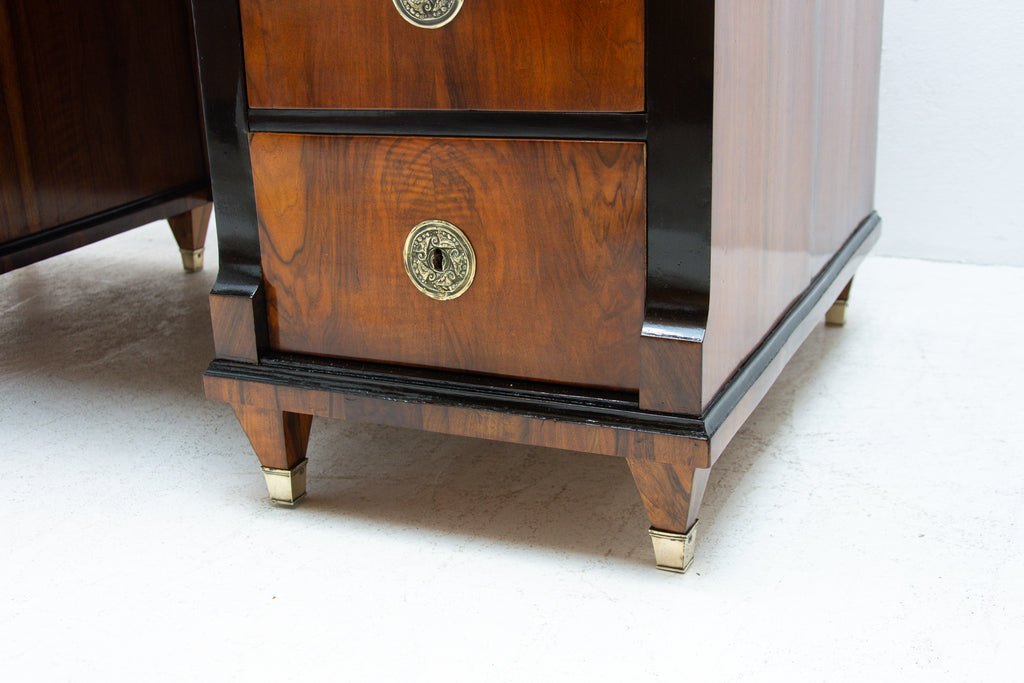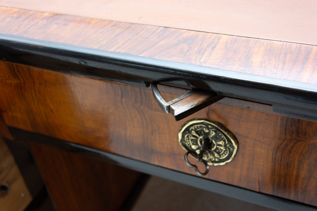 This Biedermeier writing desk was made in Austria-Hungary, circa 1830. It is made of walnut wood. The table is characterized by traditional elements of this style. Brass decorative elements are fitted on the door front. The table is in excellent condition after a complete renovation.
