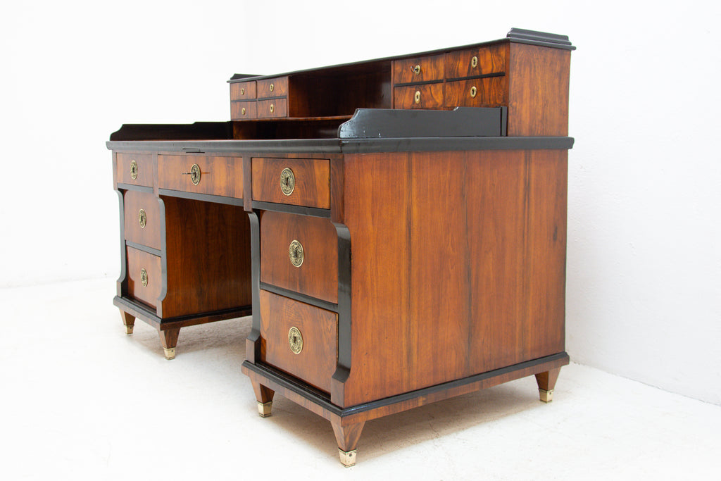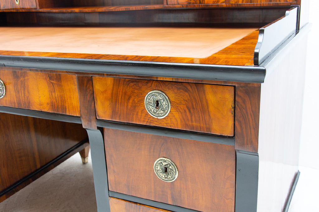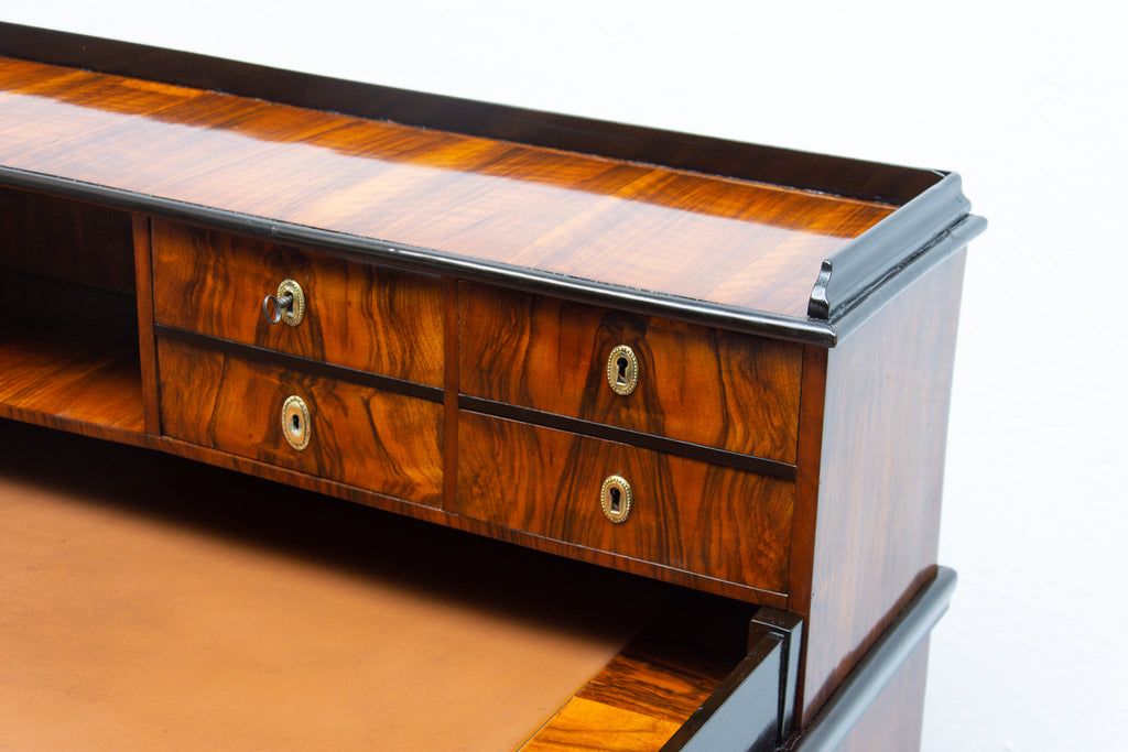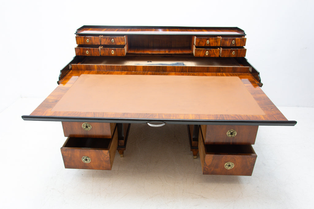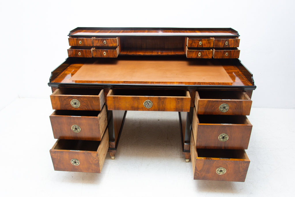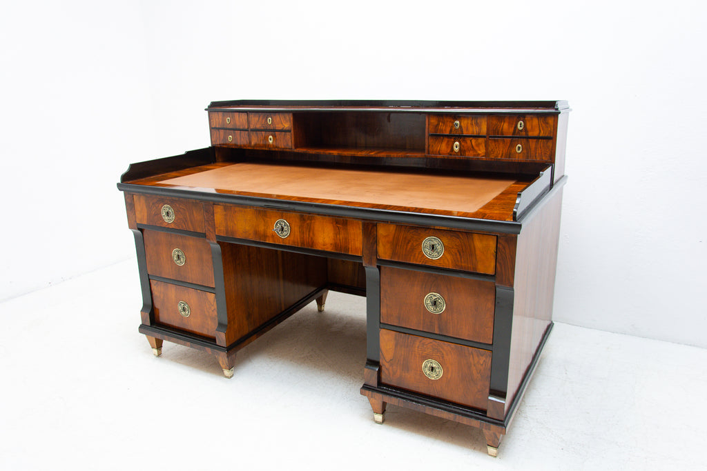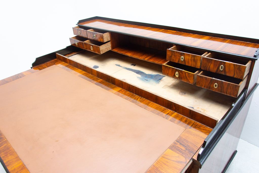 This Biedermeier writing desk was made in Austria-Hungary, circa 1830. It is made of walnut wood. The table is characterized by traditional elements of this style. Brass decorative elements are fitted on the door front. The table is in excellent condition after a complete renovation.
