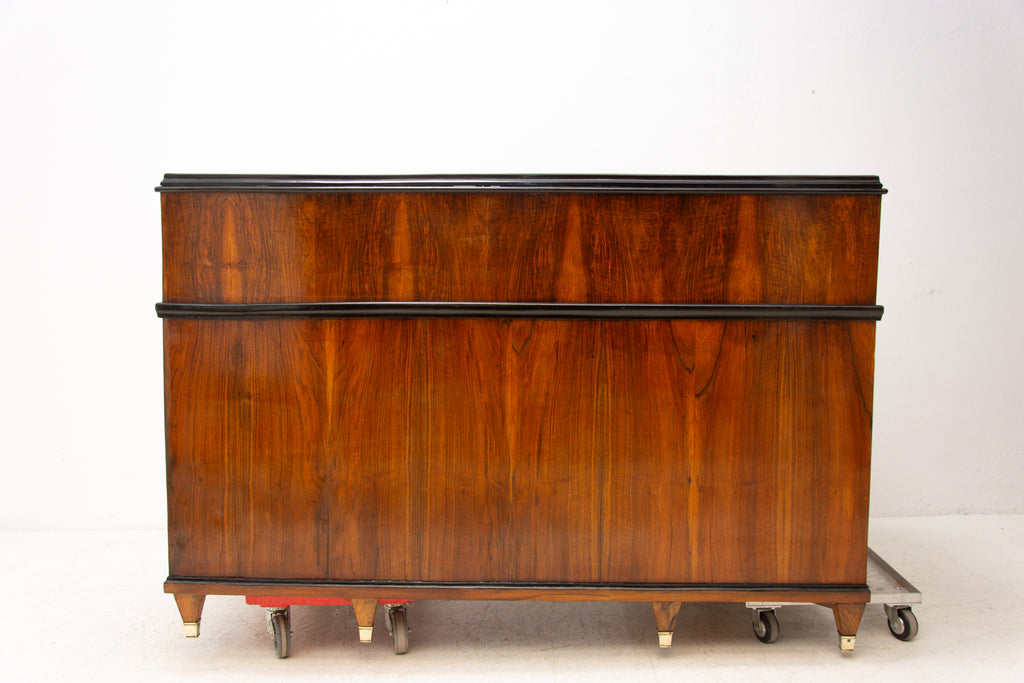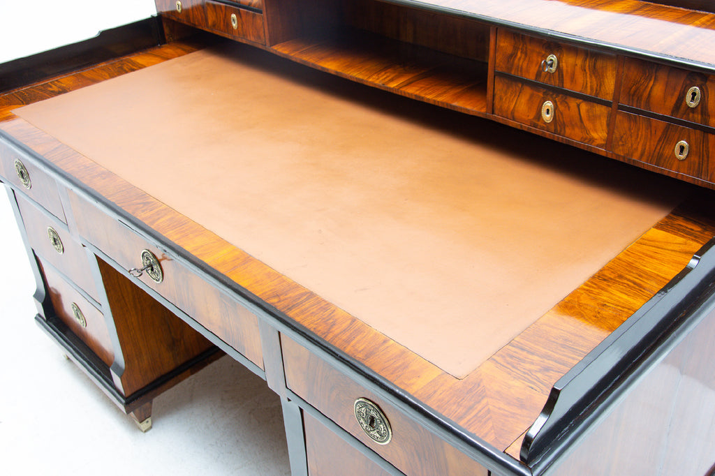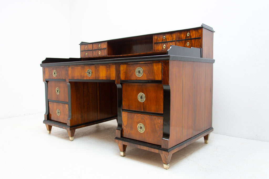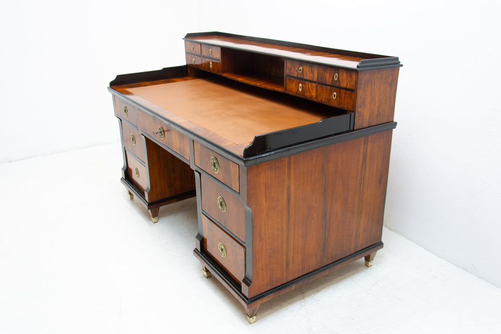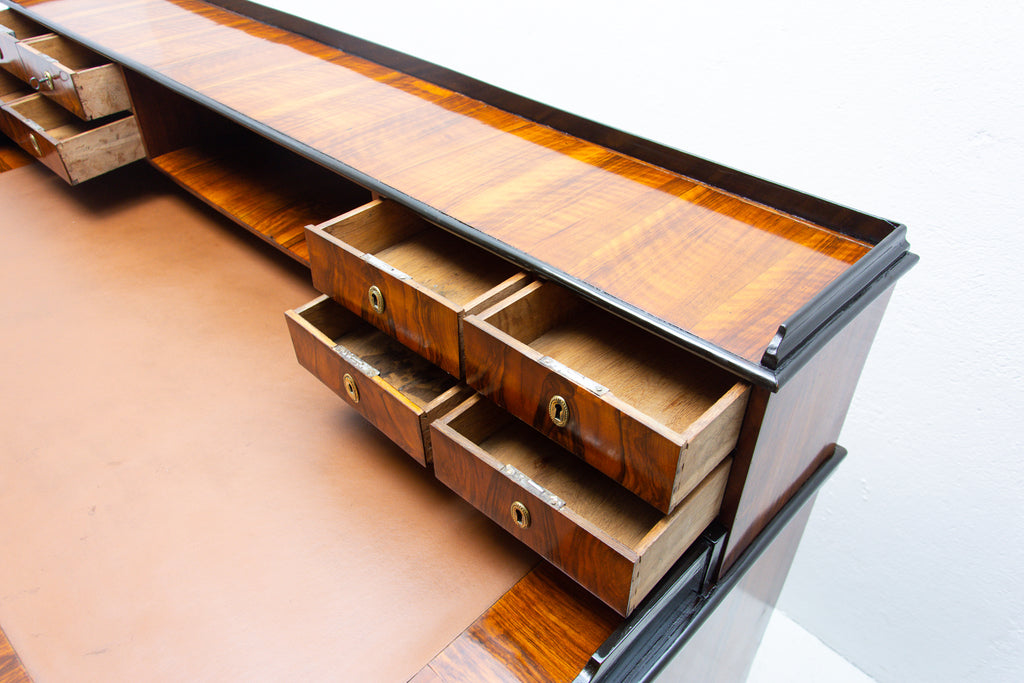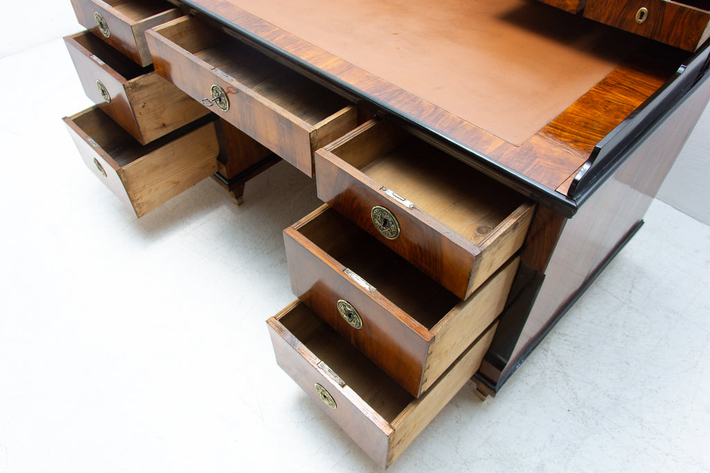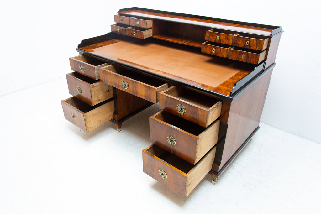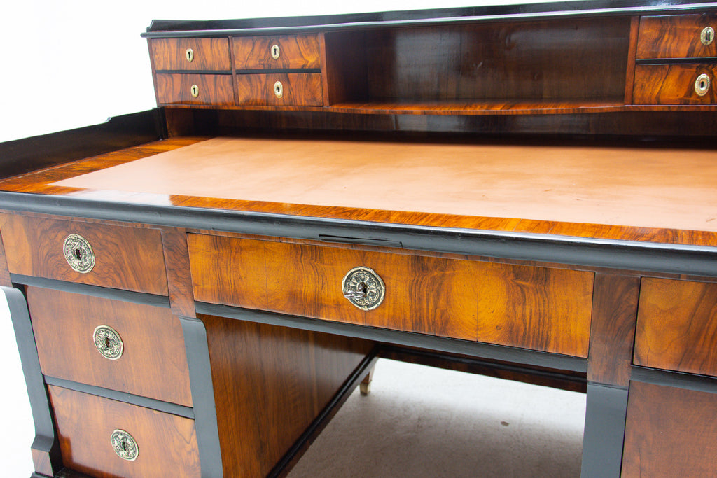 This Biedermeier writing desk was made in Austria-Hungary, circa 1830. It is made of walnut wood. The table is characterized by traditional elements of this style. Brass decorative elements are fitted on the door front. The table is in excellent condition after a complete renovation.