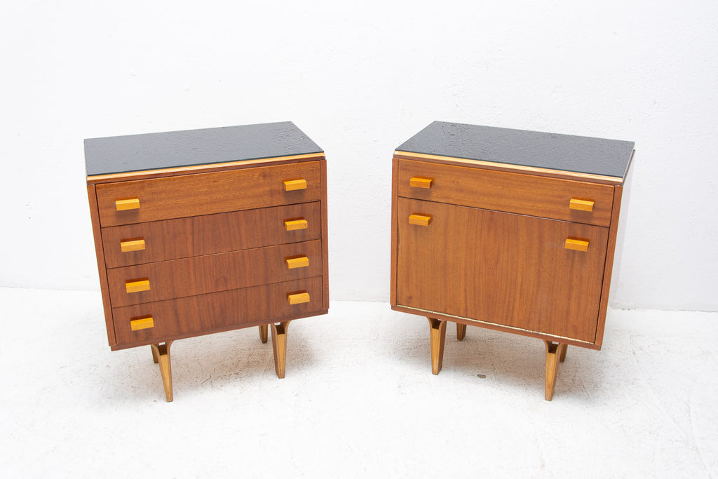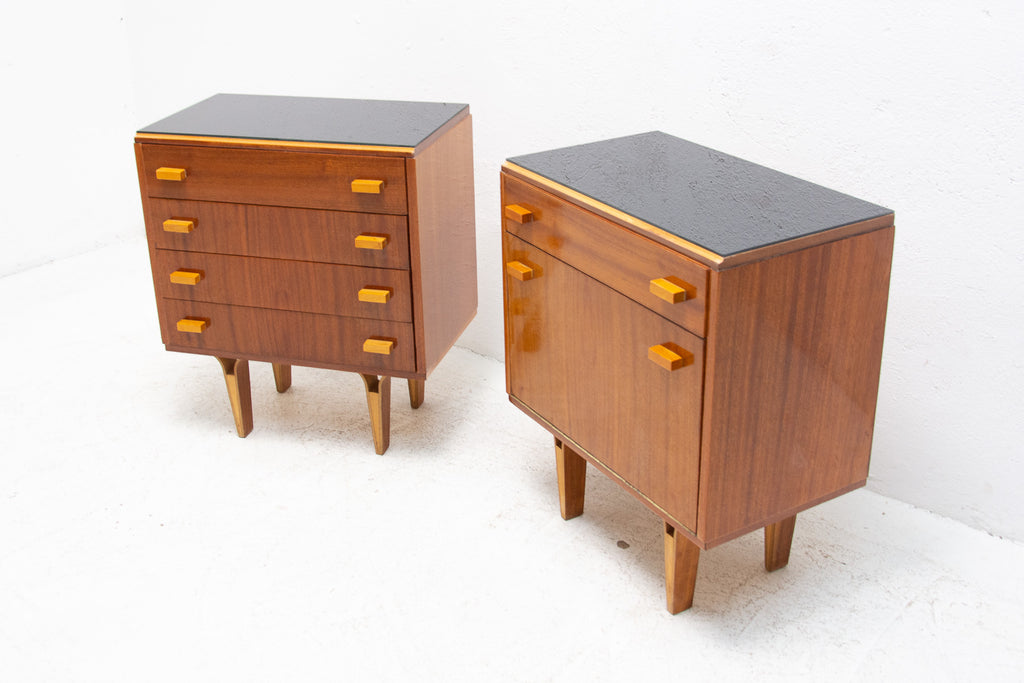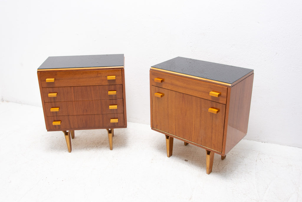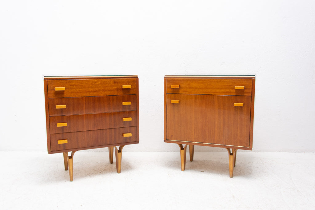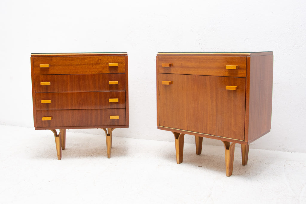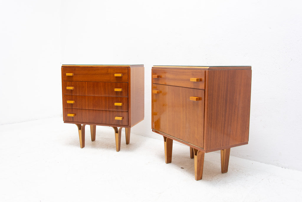 Pair of Mid century mahogany night stands, chest of drawers, Frantisek Mezulanik, 1970s