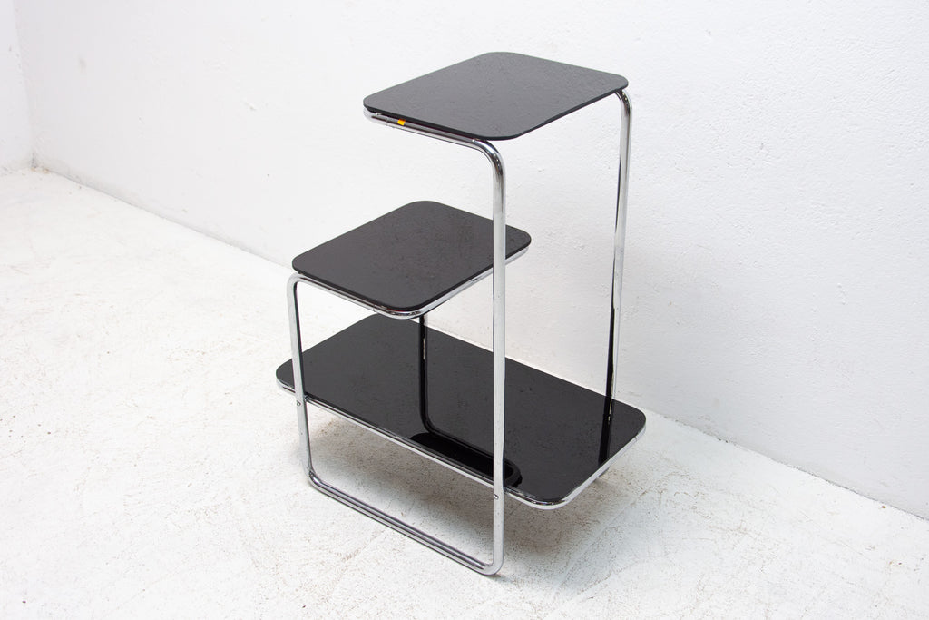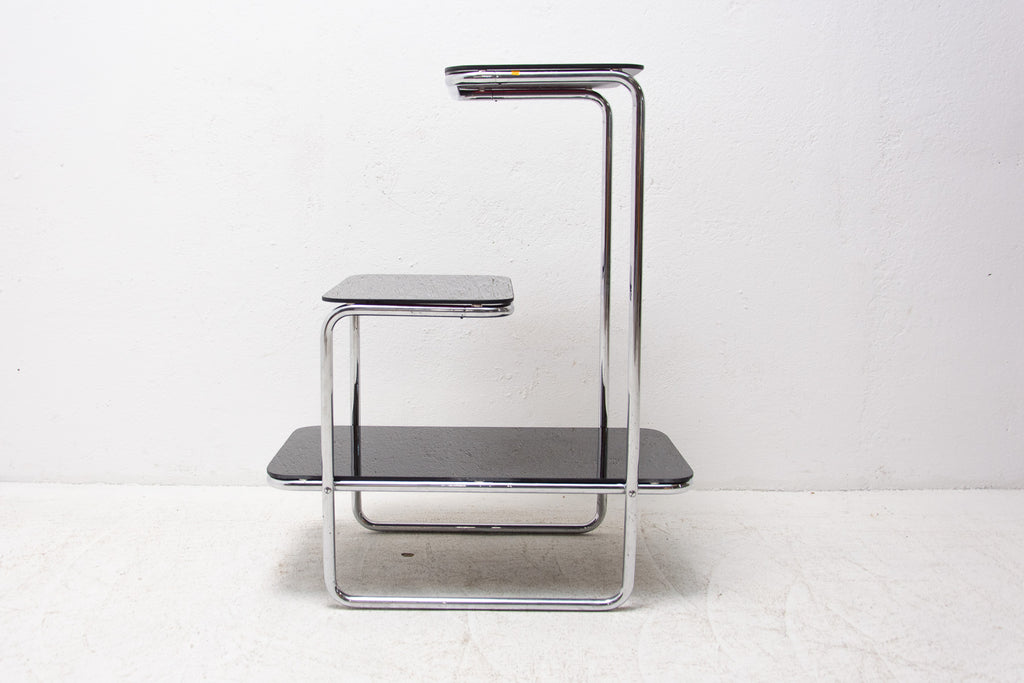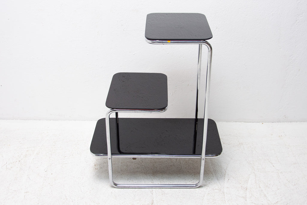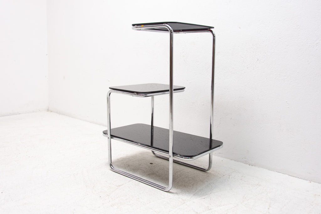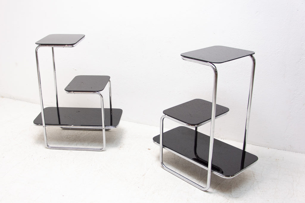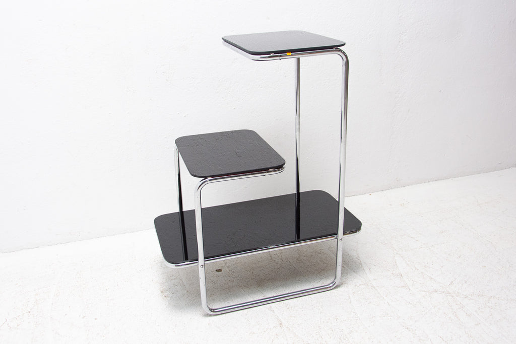 This functionalist plant stand was designed by arch. Emile Guillot and made in Central Europe in the 1930´s. It features an original chromed tubular steel tructure and and three glass pedestals for flowers