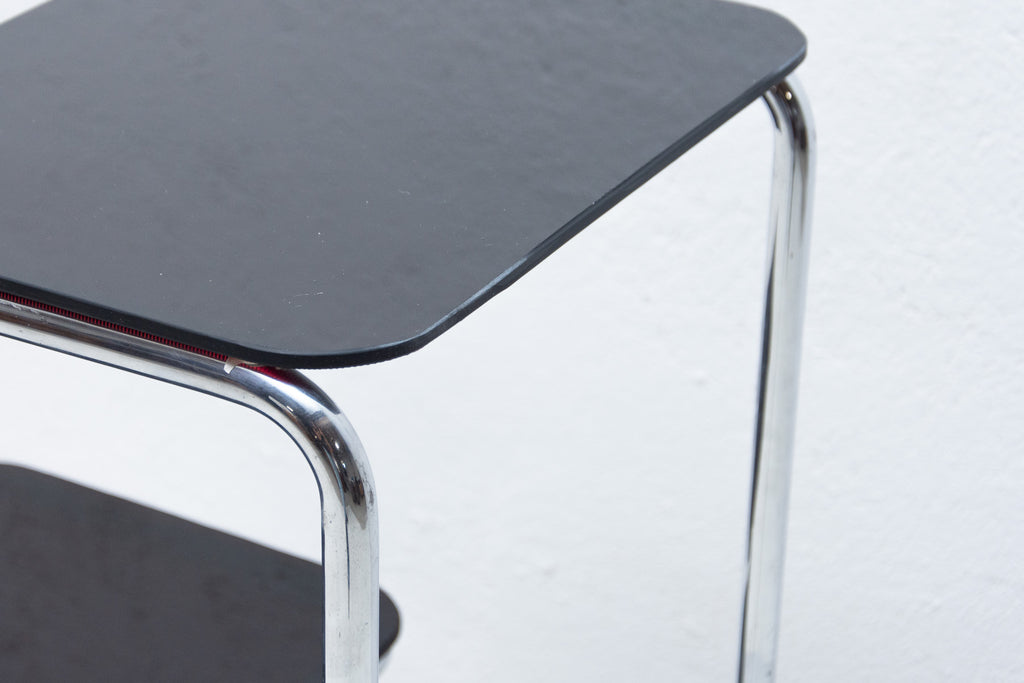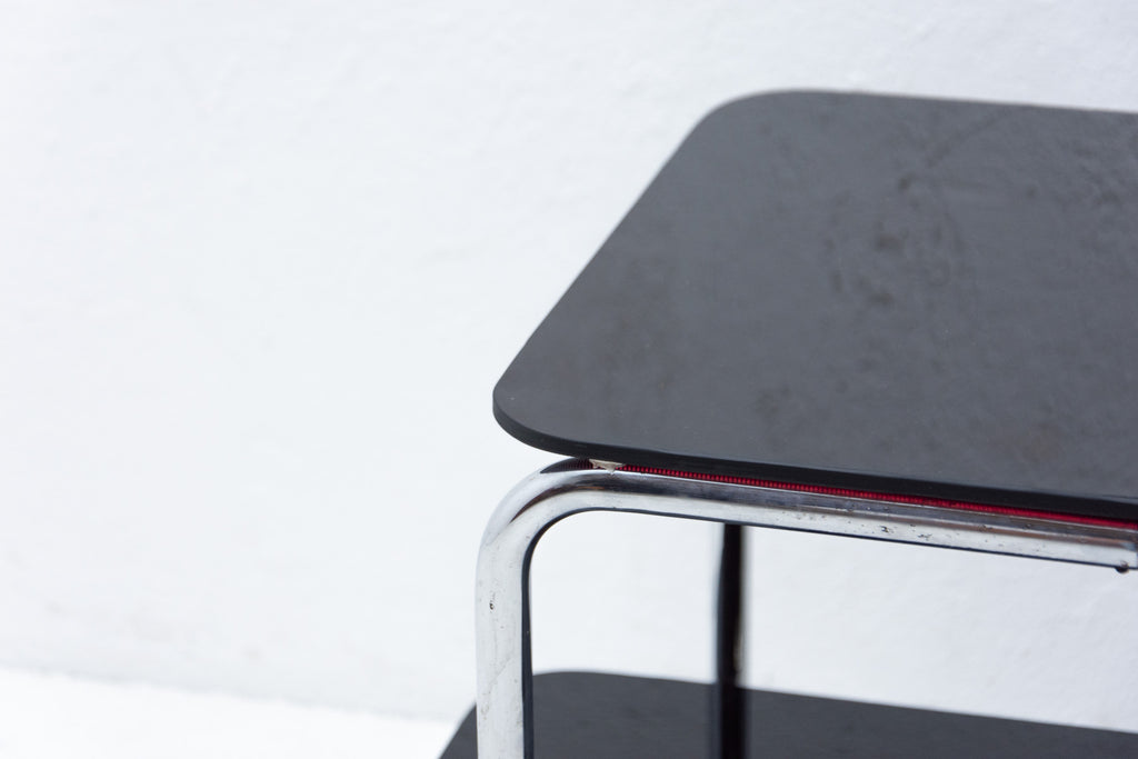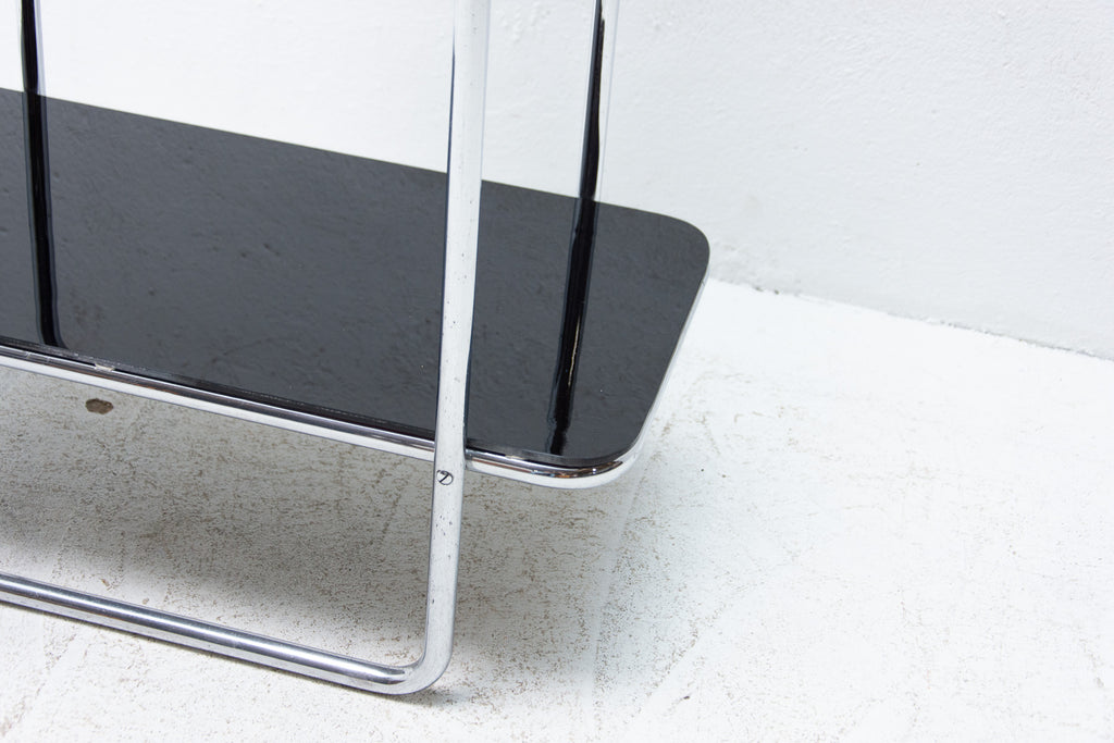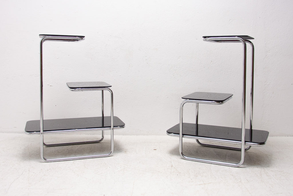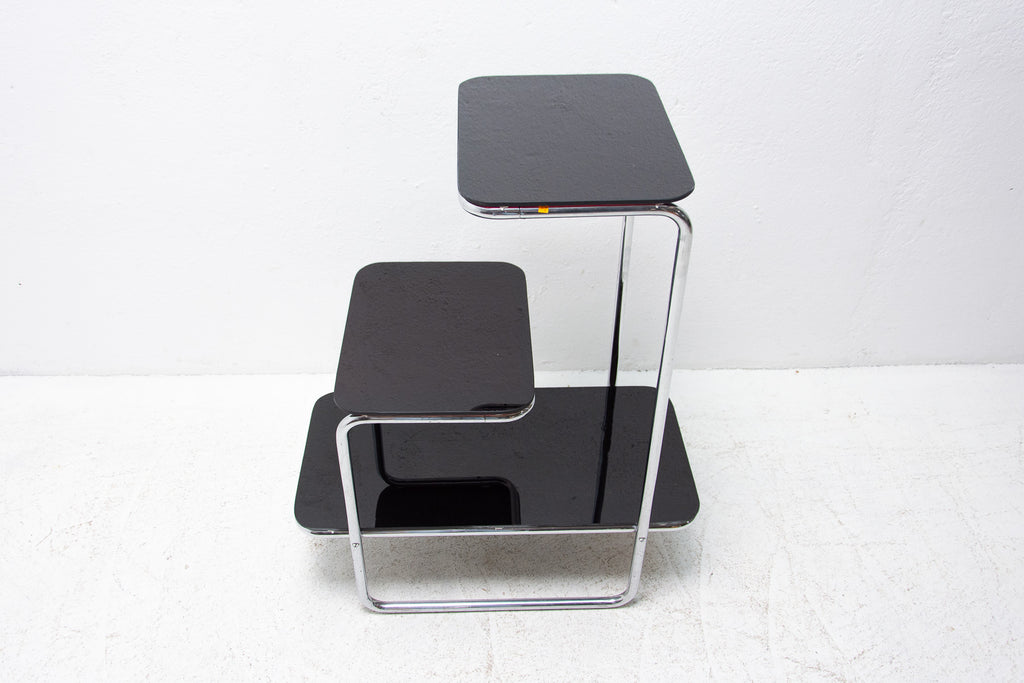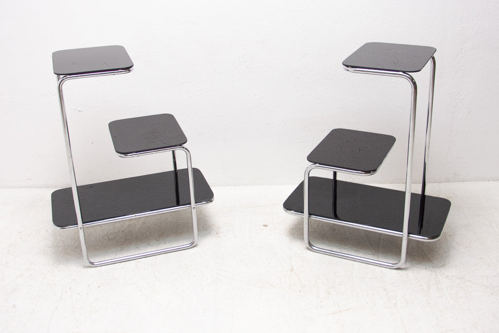 This functionalist plant stand was designed by arch. Emile Guillot and made in Central Europe in the 1930´s. It features an original chromed tubular steel tructure and and three glass pedestals for flowers