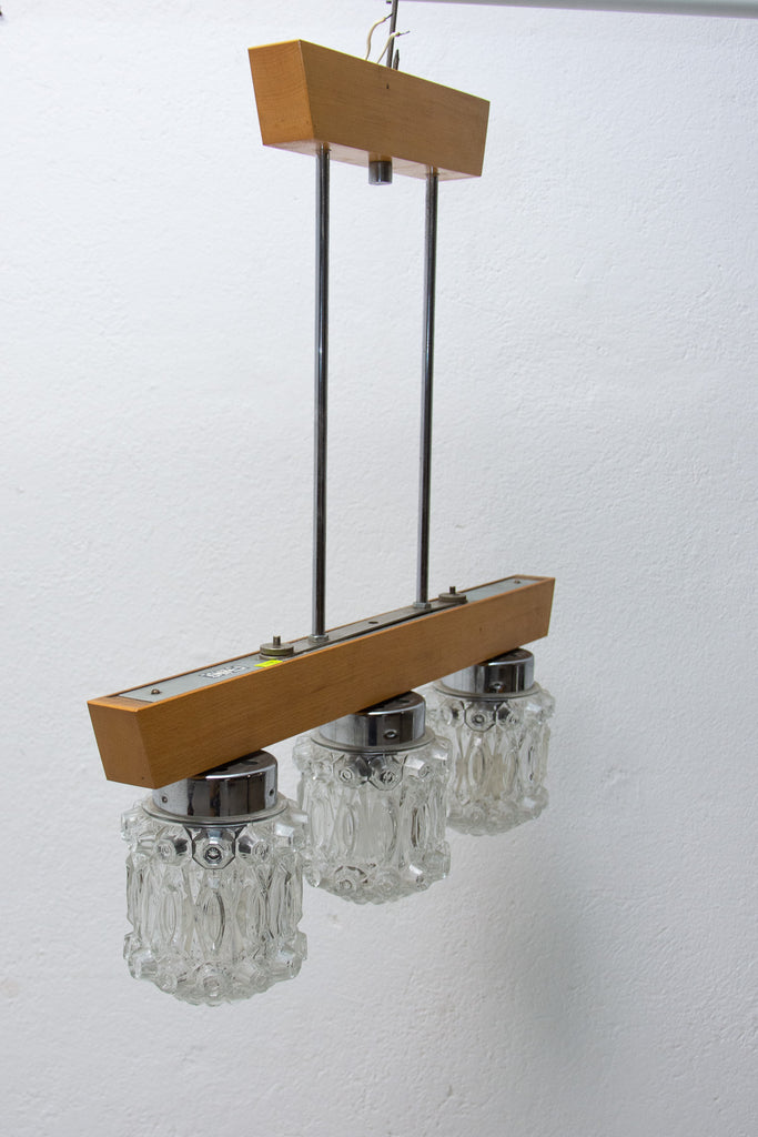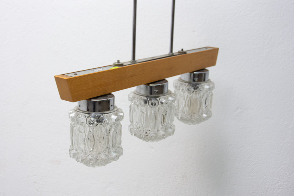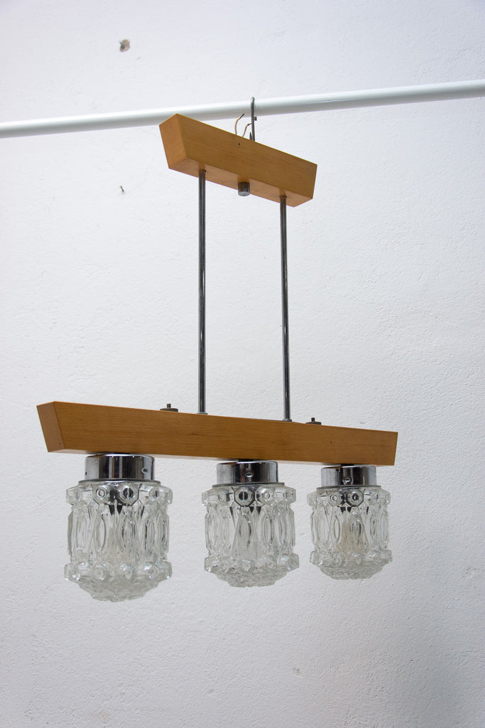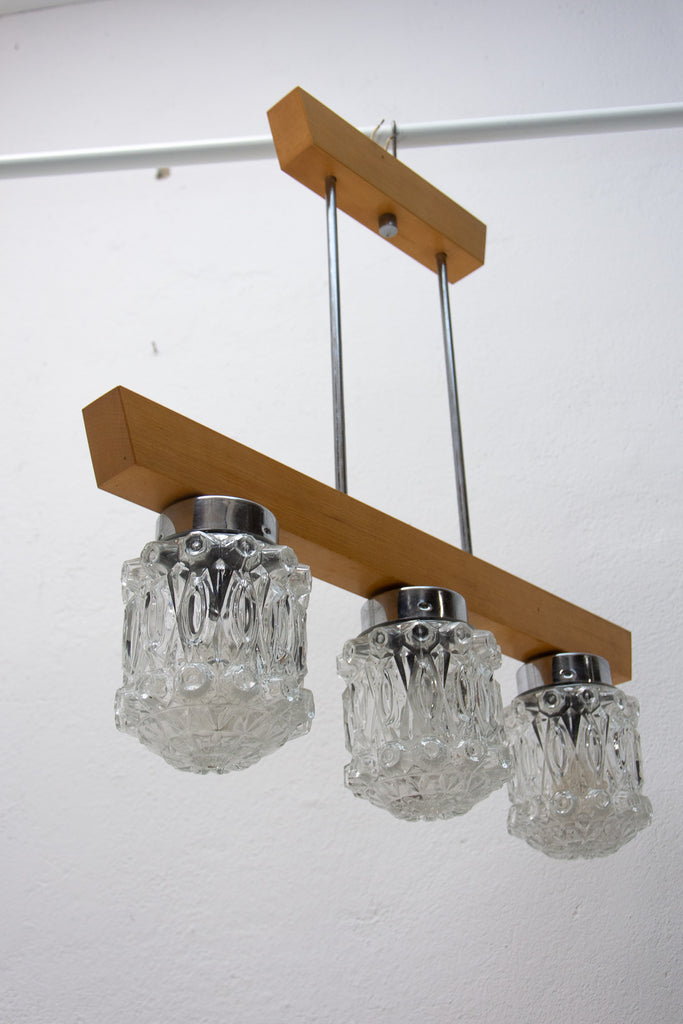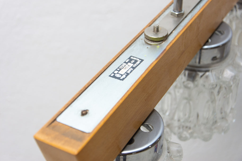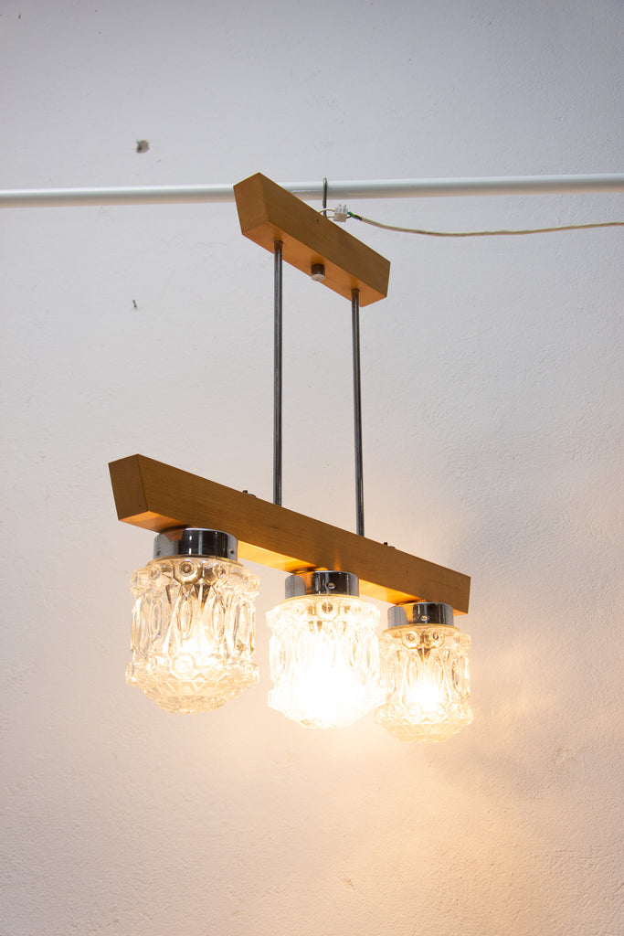 This chandelier comes from a Czechoslovak hotel and comes from the so-called Brutalist era of the former Eastern bloc in the 1970´s. It´s made of cut glass and wood.