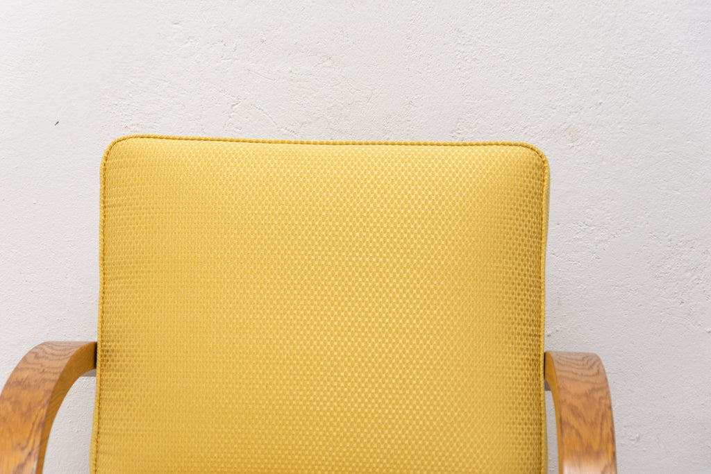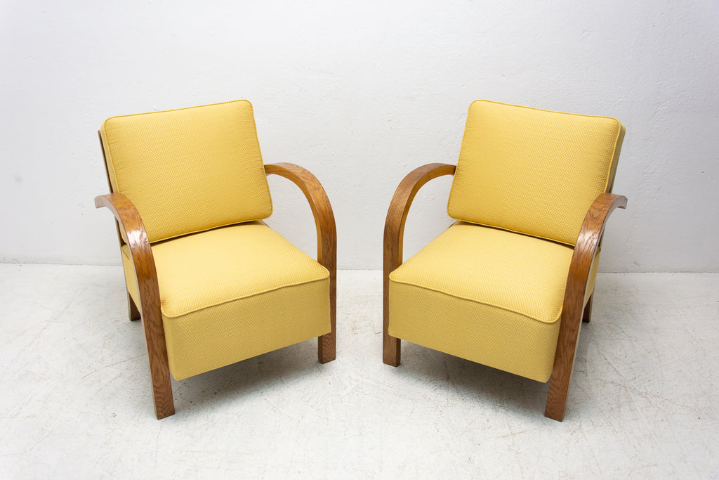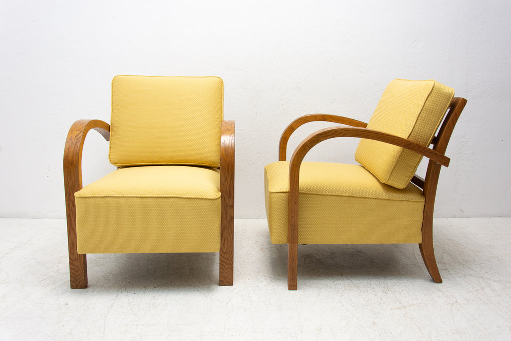 These ART DECO bentwood armchairs were made in the former Czechoslovakia in the 1930's. Fully restored and are in excellent condition. New upholstery, polished veneer. The armchairs are an exceptional in their design and comfort as well.