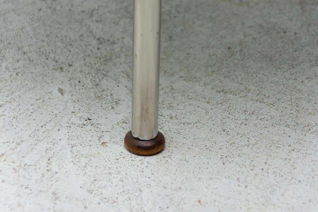 The table has a chrome-plated metal base and walnut wood tops. Chrome structure is in very good Vintage condition. The wood was fully renovated.