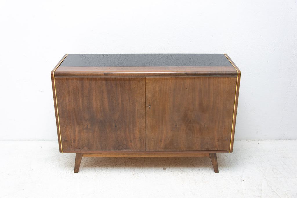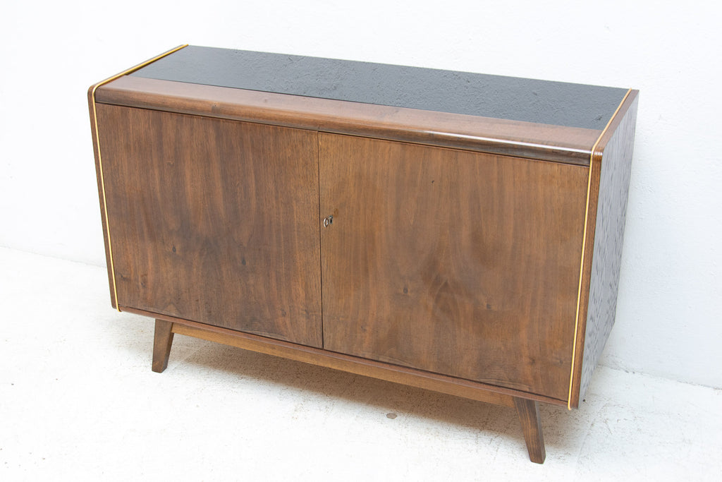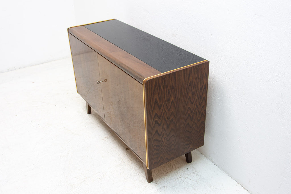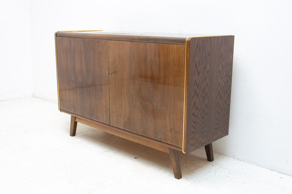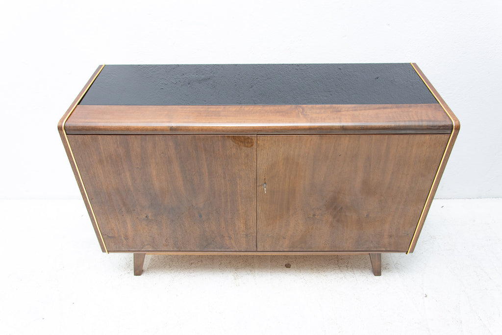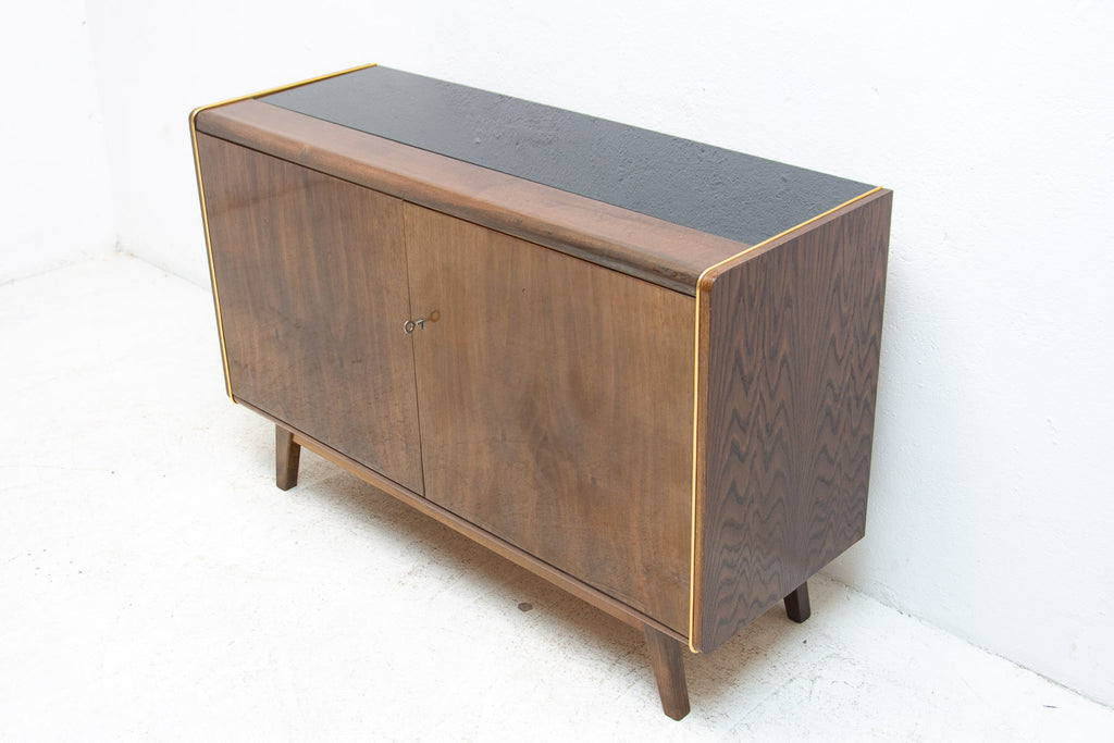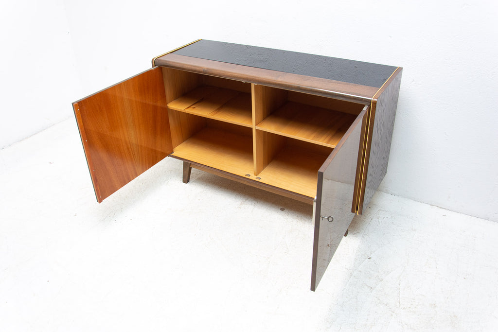 This mid century sideboard was designed by Hubert Nepožitek & Bohumil Landsman for Jitona company in the 1960´s. Beautiful walnut veneer. Material: walnut, mahogany, plywood, opaxite glass on the top. In very good condition.
