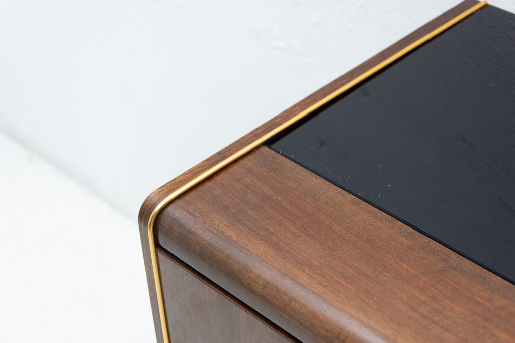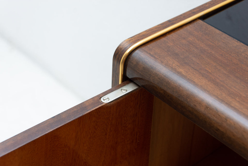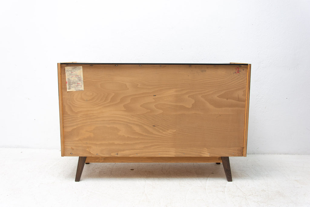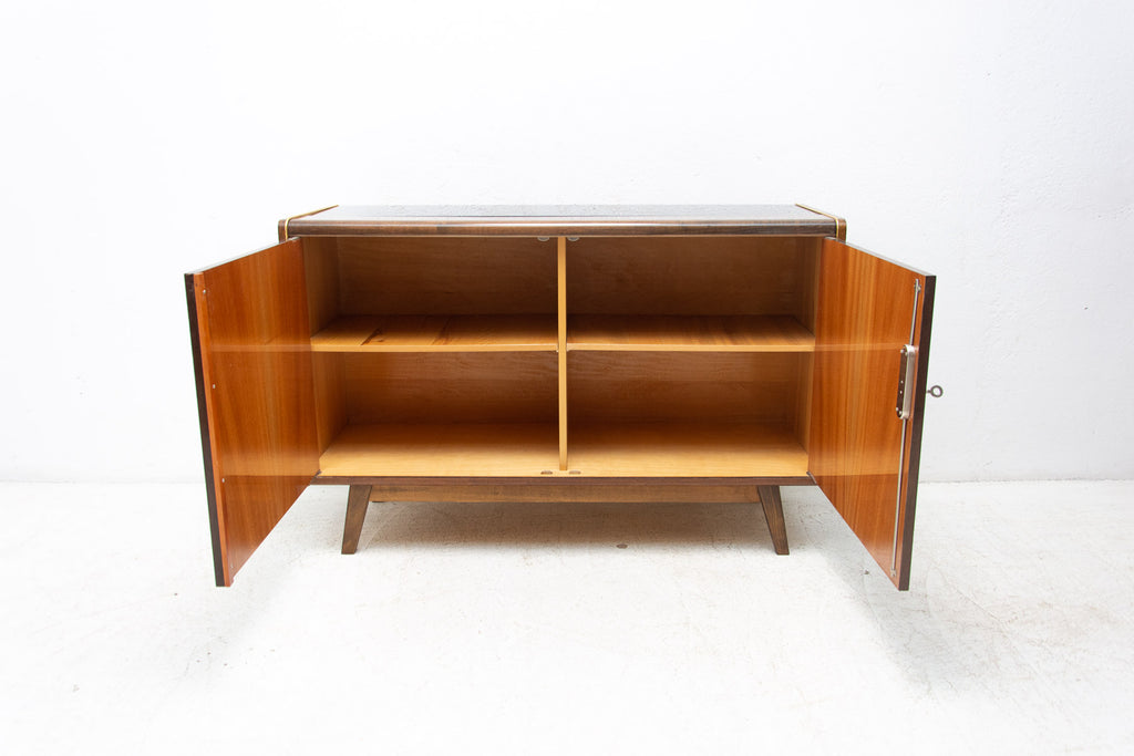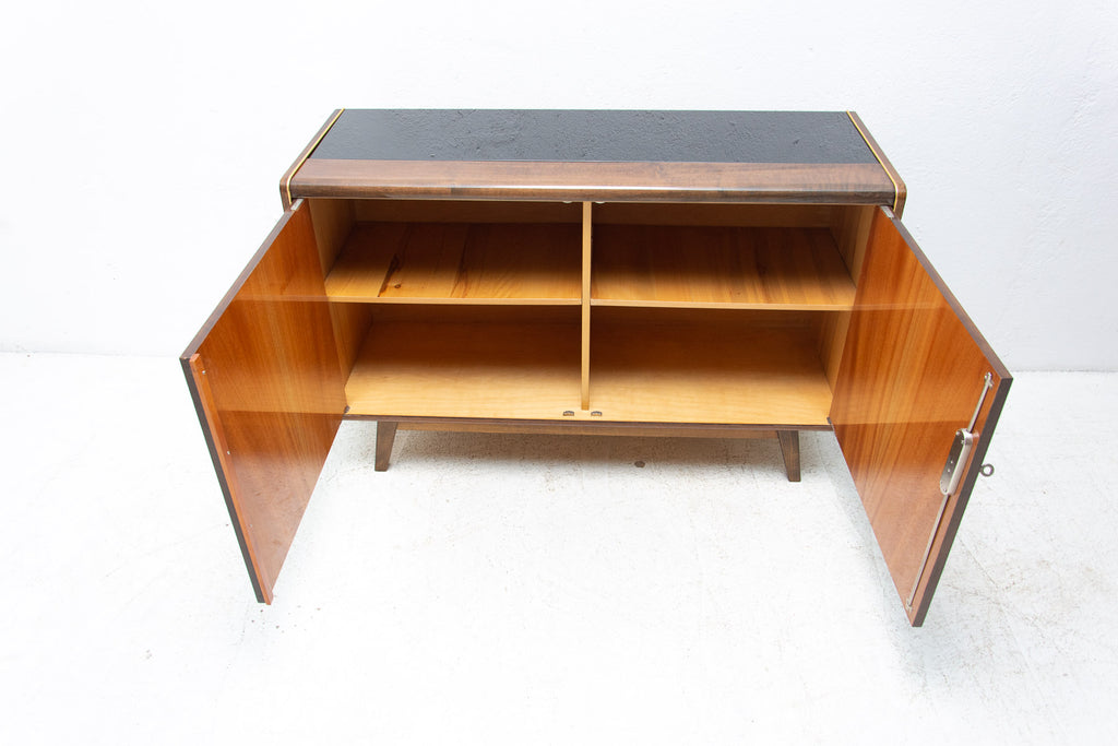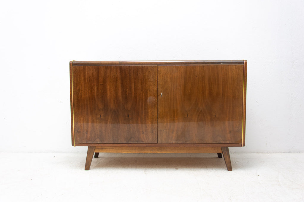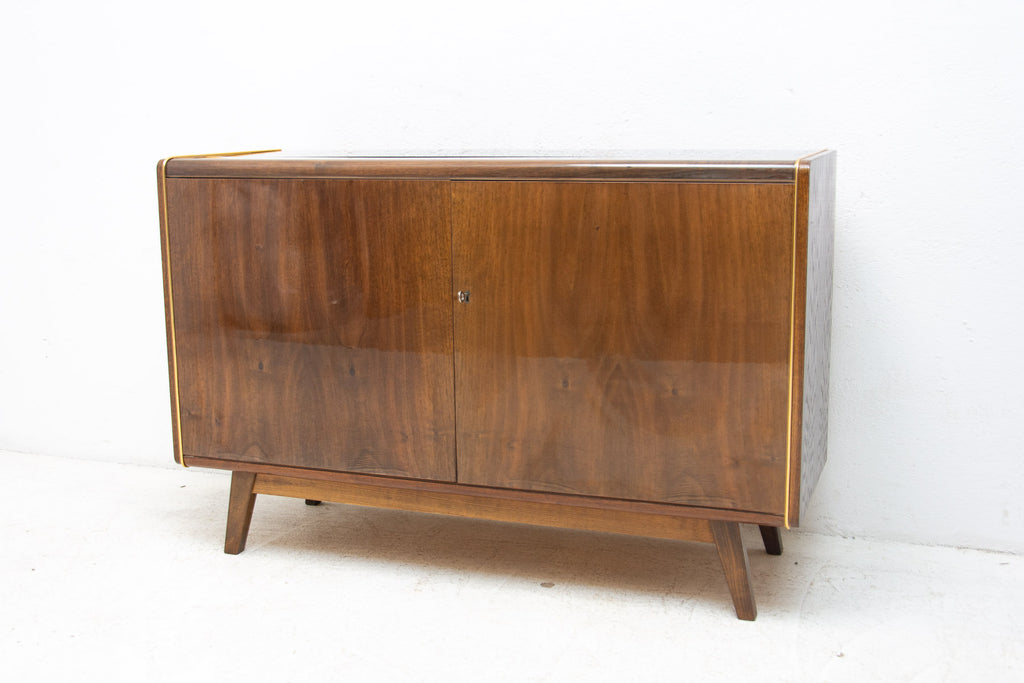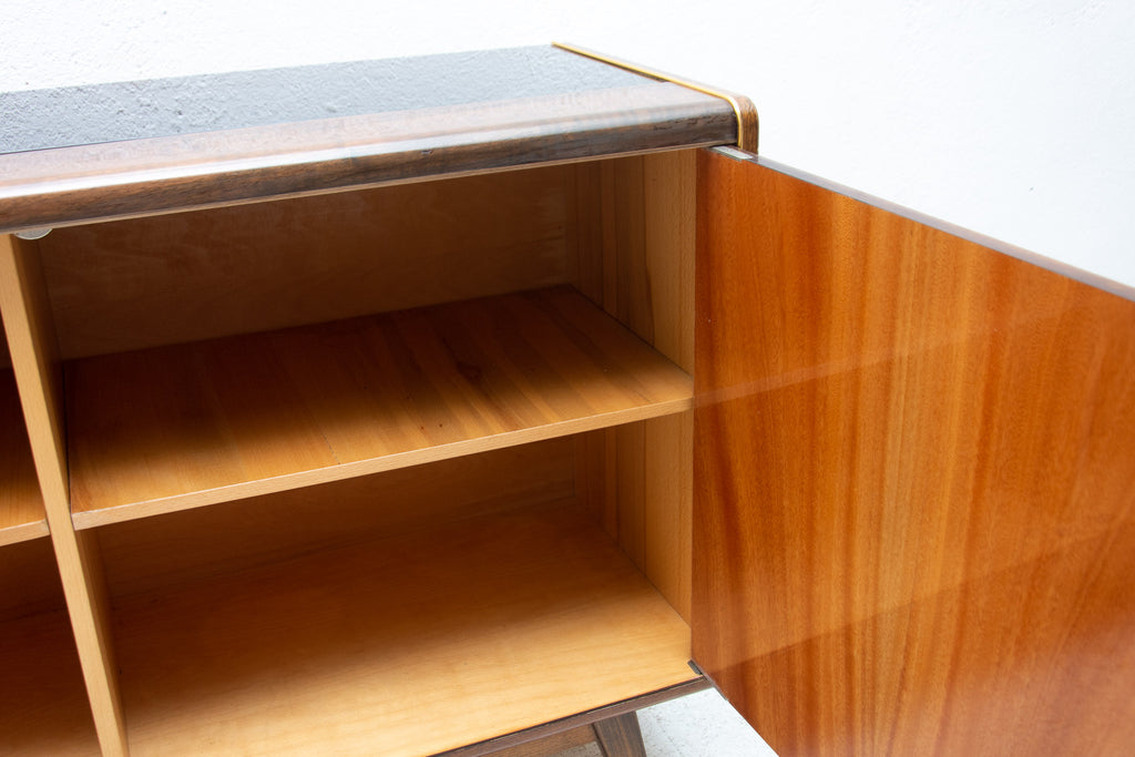 This mid century sideboard was designed by Hubert Nepožitek & Bohumil Landsman for Jitona company in the 1960´s. Beautiful walnut veneer. Material: walnut, mahogany, plywood, opaxite glass on the top. In very good condition.