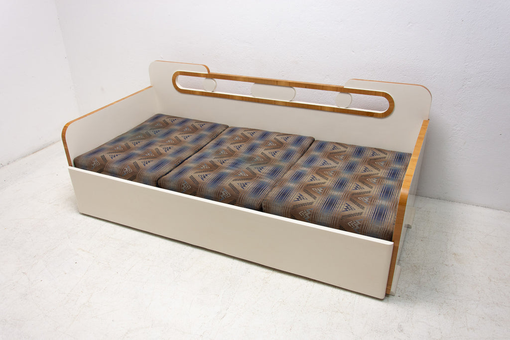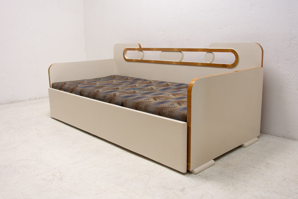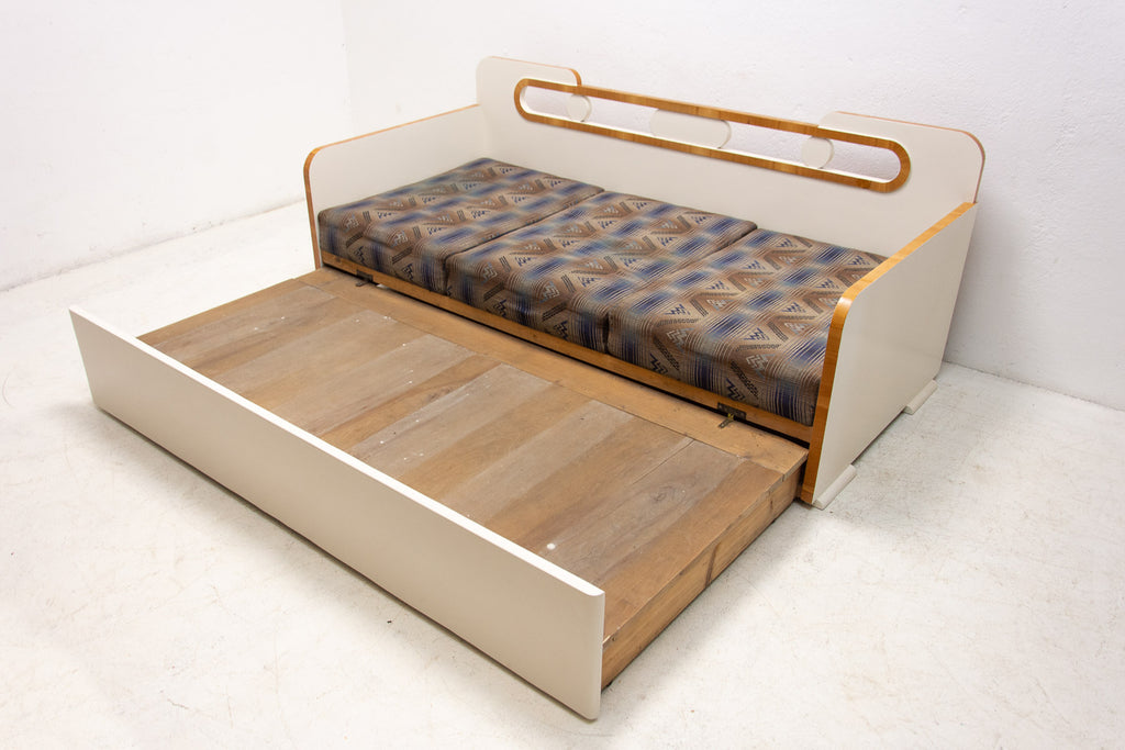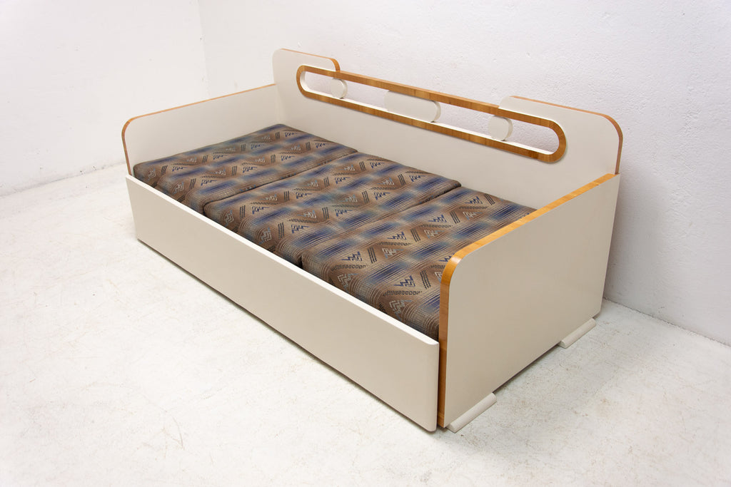 This folding Art Deco sofa was made in the 1930s in the former Czechoslovakia. The piece is an example of the Czechoslovak Pre-war Art Deco style in combination with Cubist elements and it ´s characterized by white painted wooden structure and storage space. It can be unfolded like a bed. Sofa is in excellent condition, fully restored.The mattresses are not restored but it´s in very good condition.