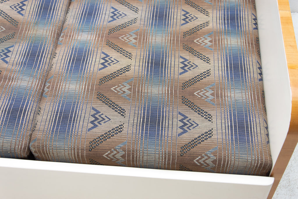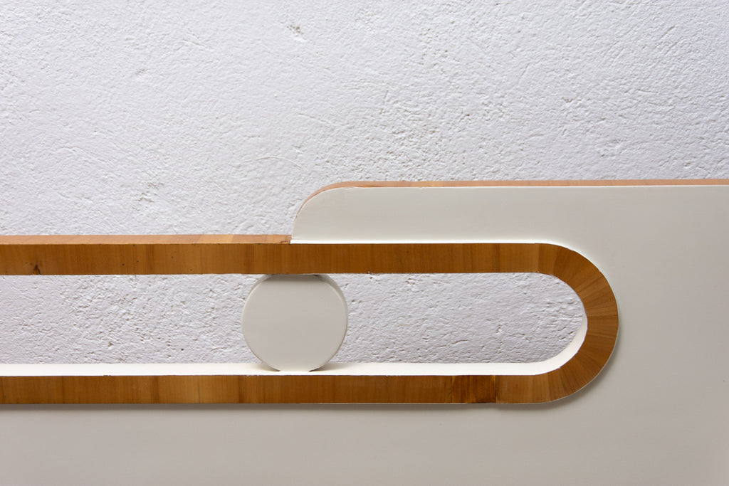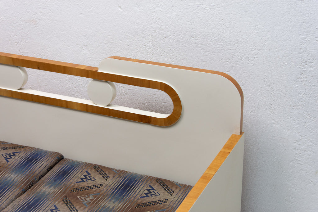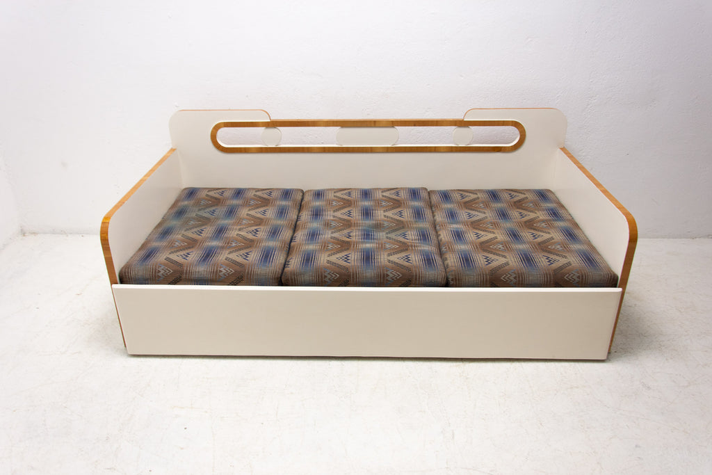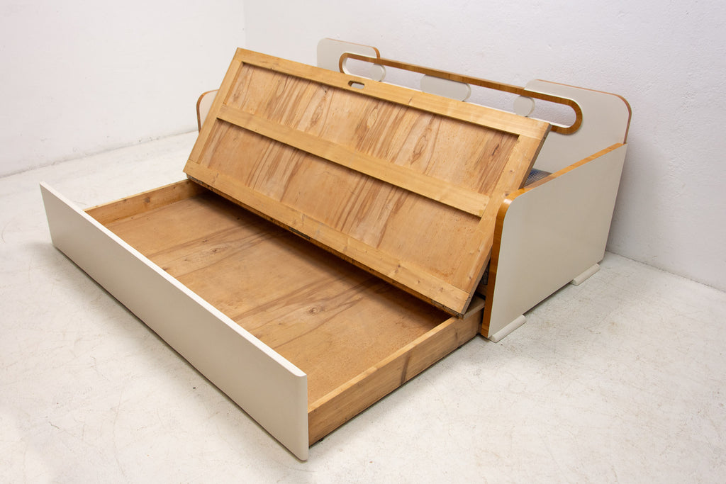 This folding Art Deco sofa was made in the 1930s in the former Czechoslovakia. The piece is an example of the Czechoslovak Pre-war Art Deco style in combination with Cubist elements and it ´s characterized by white painted wooden structure and storage space. It can be unfolded like a bed. Sofa is in excellent condition, fully restored.The mattresses are not restored but it´s in very good condition.