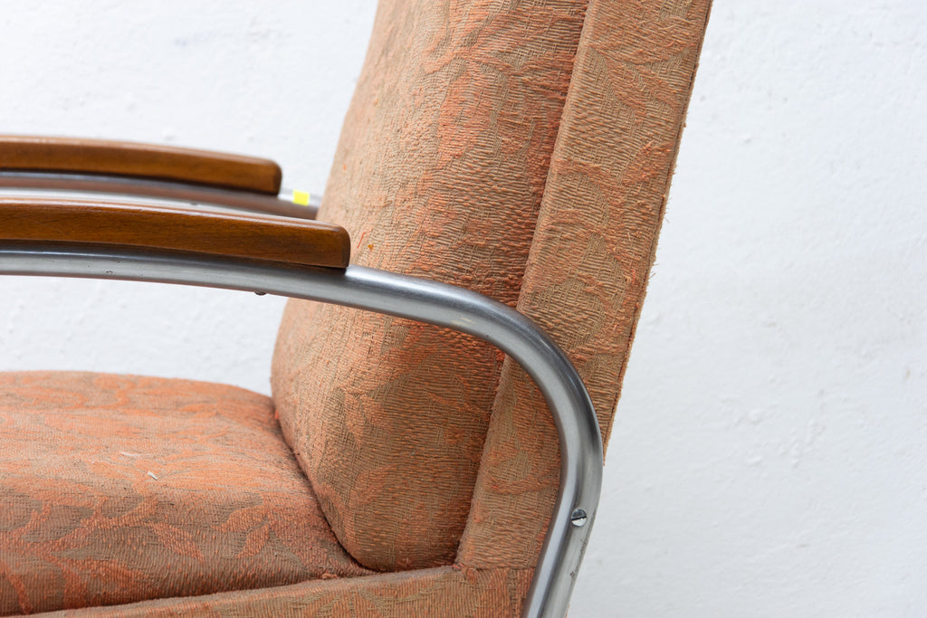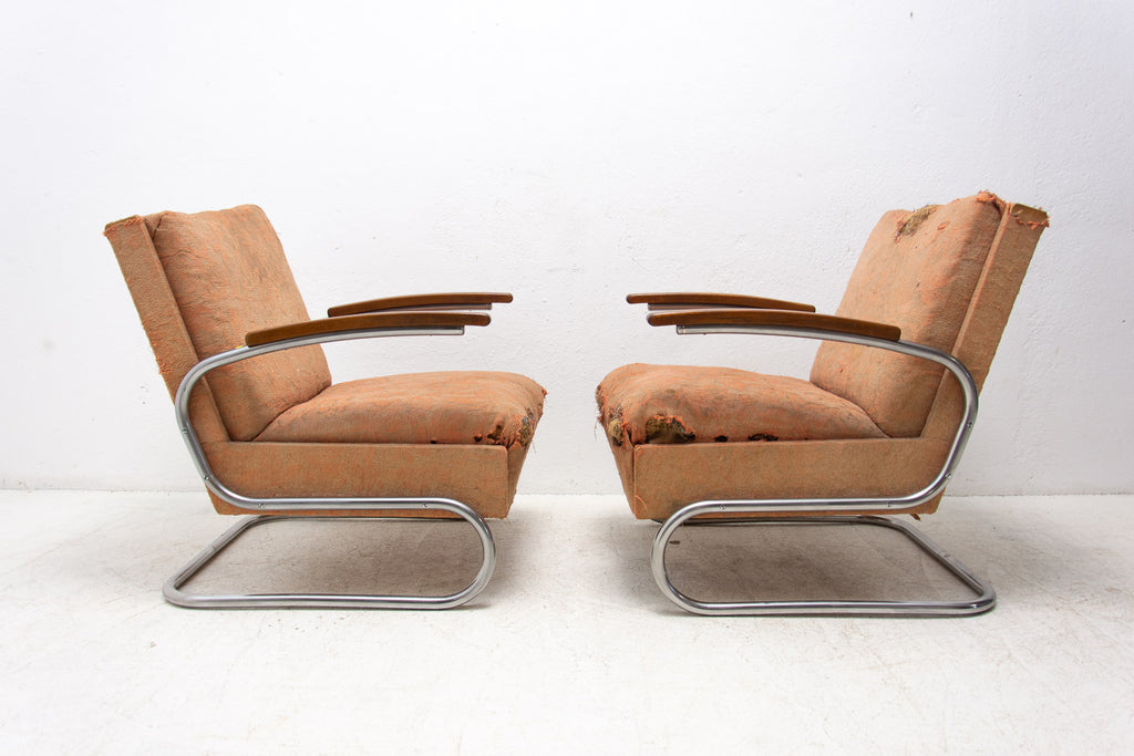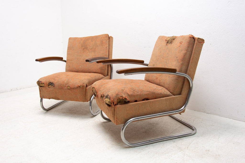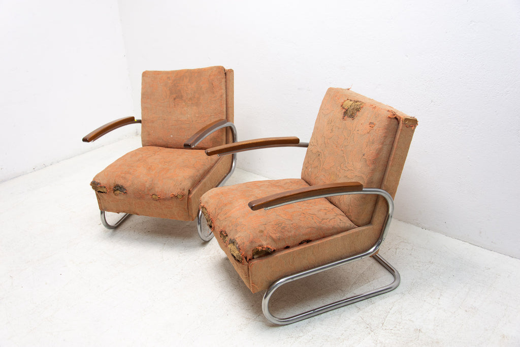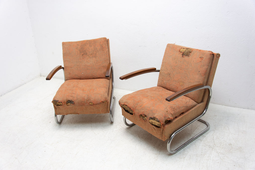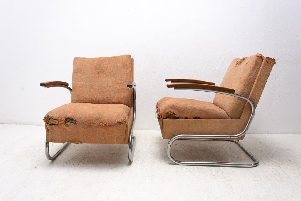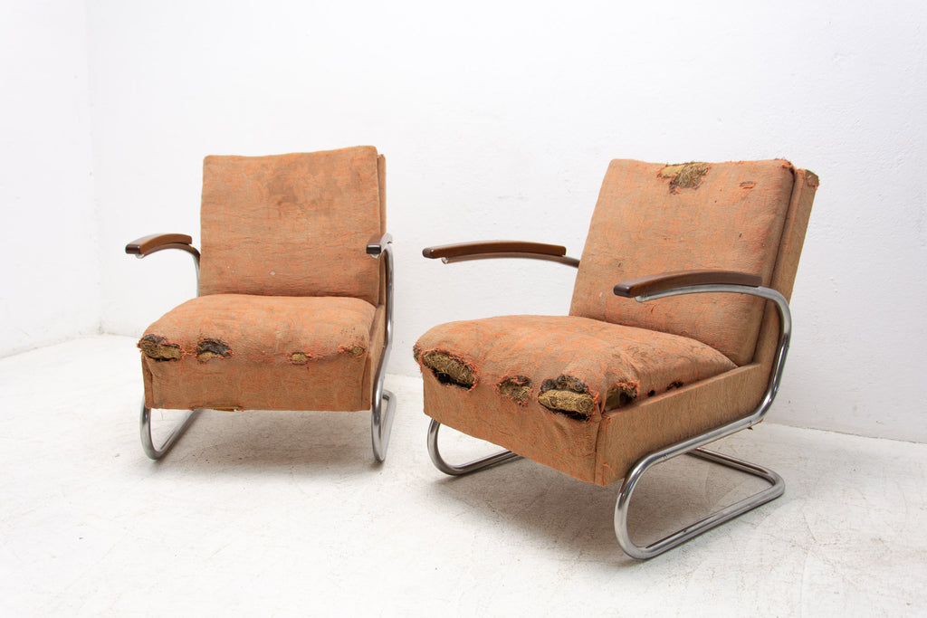 These armchairs was originally designed by W. H. Gispen in 1933 for Thonet. Then were produced under Thonet licence by Mucke Melder and Kovona Company in the Czechoslovakia. The armchairs are structurally in very good condition, expertly renovated metal frame, newly coated armrests lacquered with high gloss polyurethane. They needs a total reupholstery. If interested, we can provide at a price of 200 EUR per one piece.