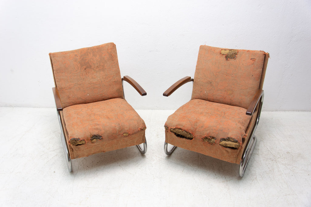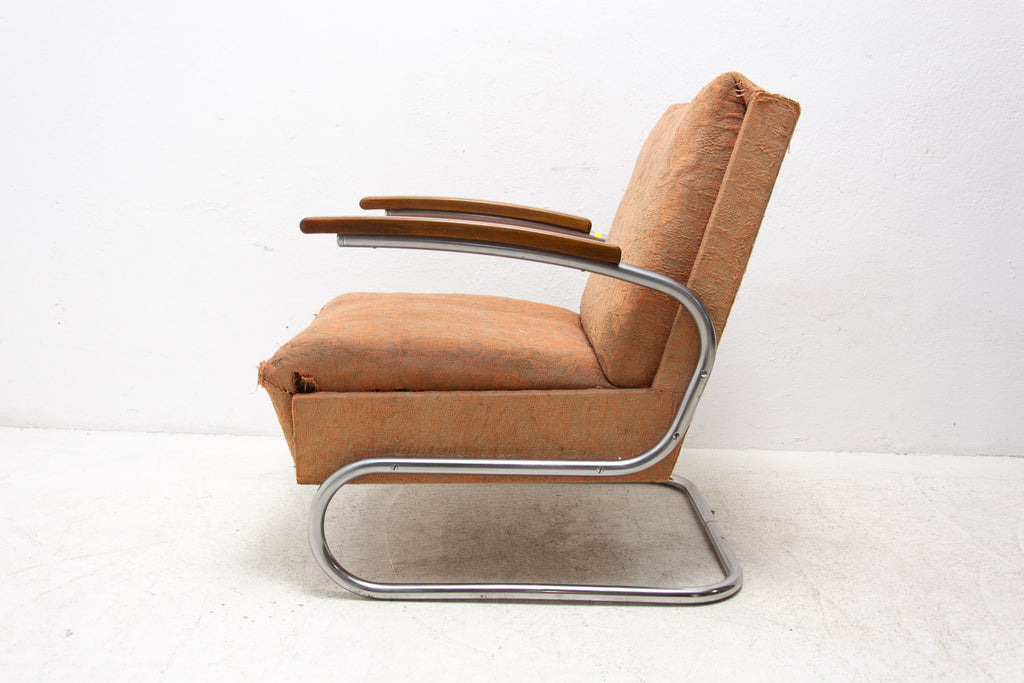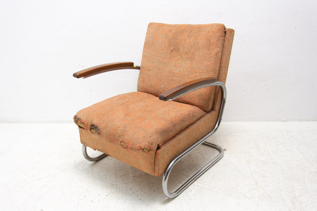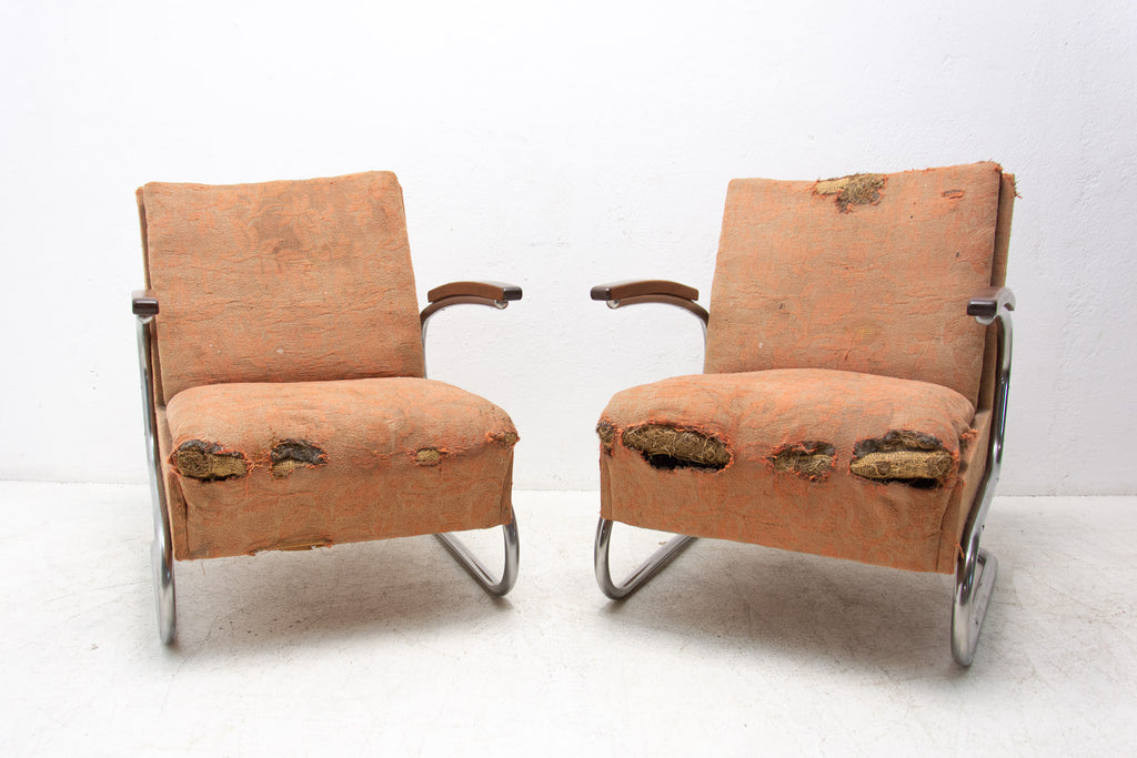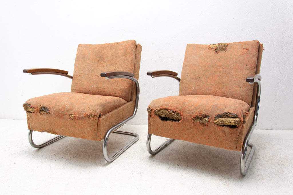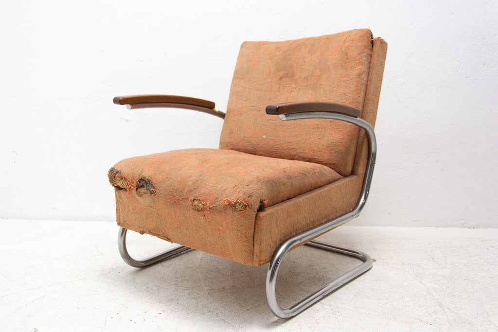 These armchairs was originally designed by W. H. Gispen in 1933 for Thonet. Then were produced under Thonet licence by Mucke Melder and Kovona Company in the Czechoslovakia. The armchairs are structurally in very good condition, expertly renovated metal frame, newly coated armrests lacquered with high gloss polyurethane. They needs a total reupholstery. If interested, we can provide at a price of 200 EUR per one piece.