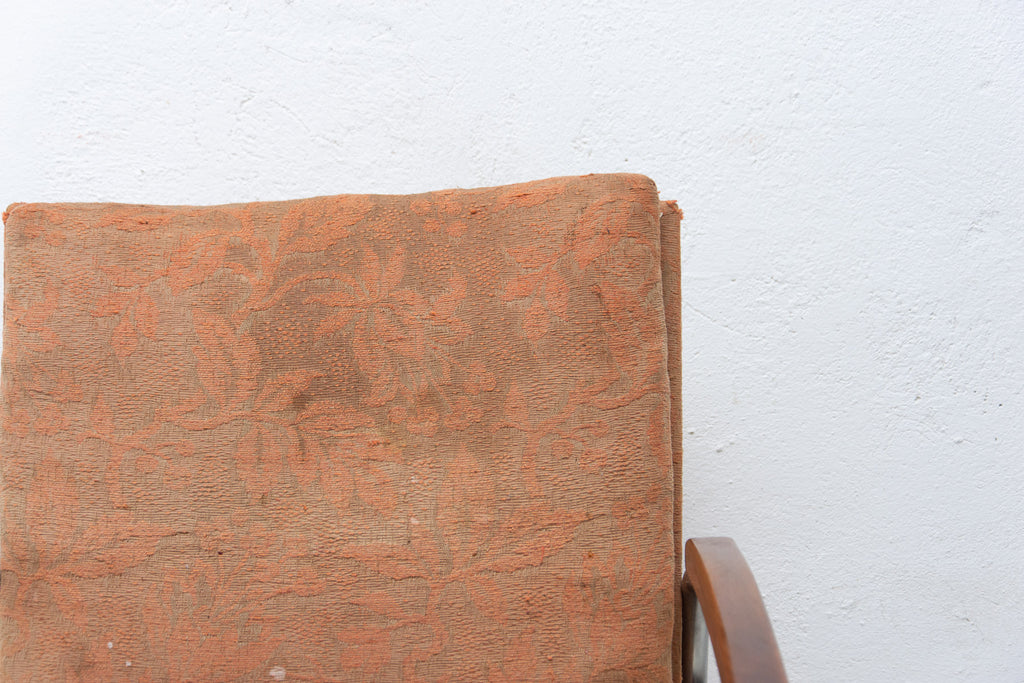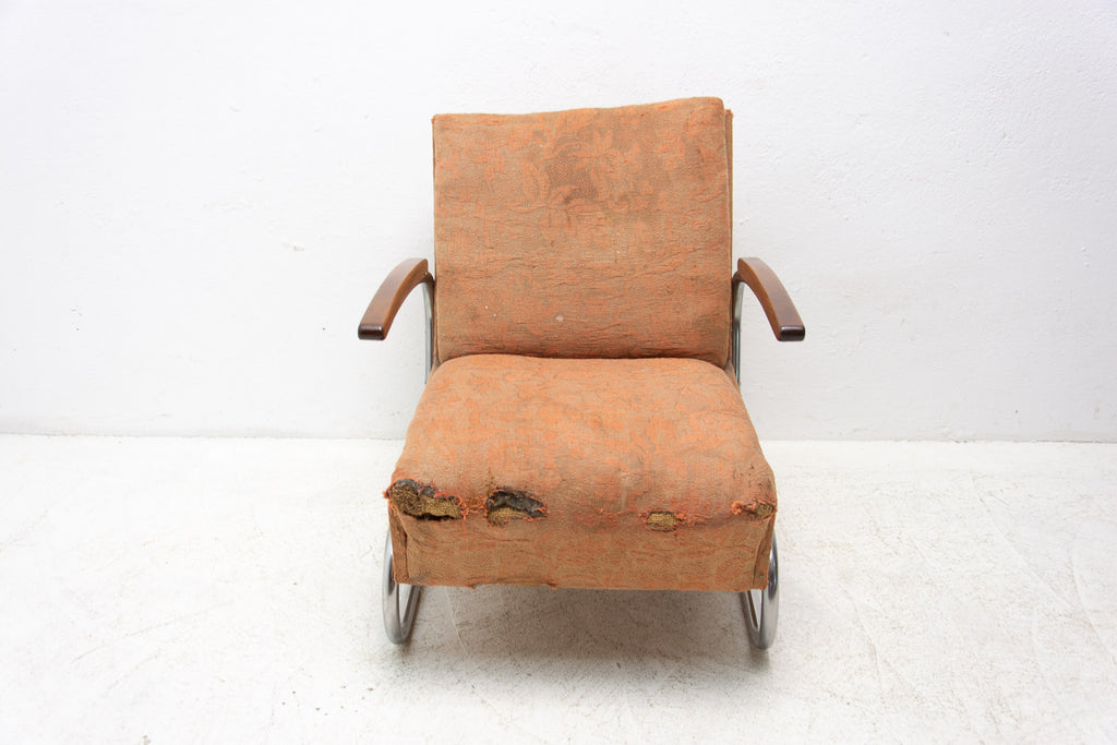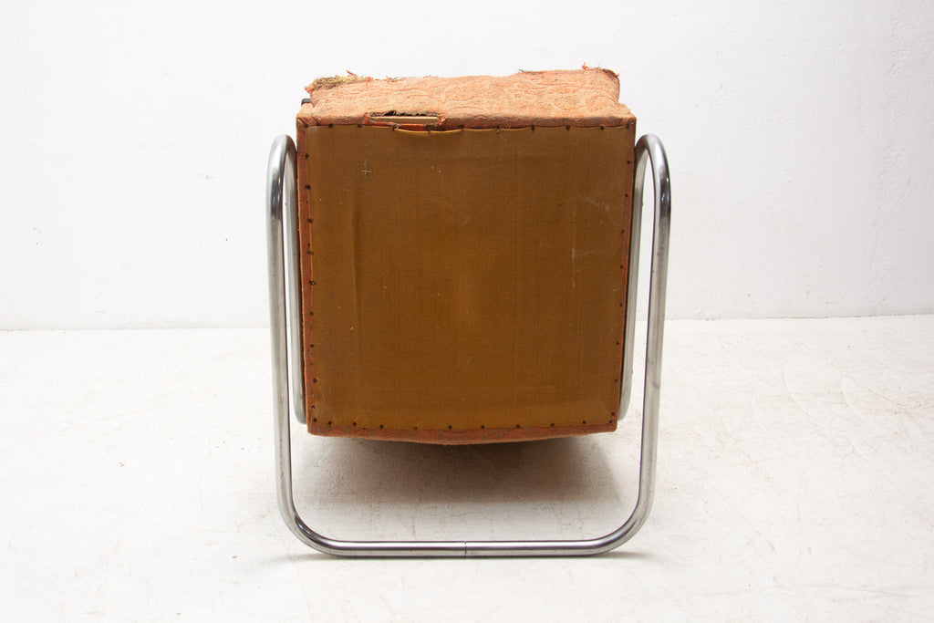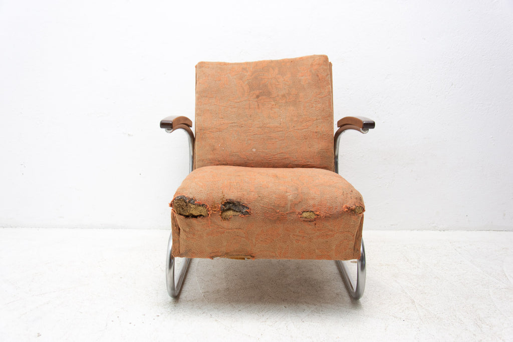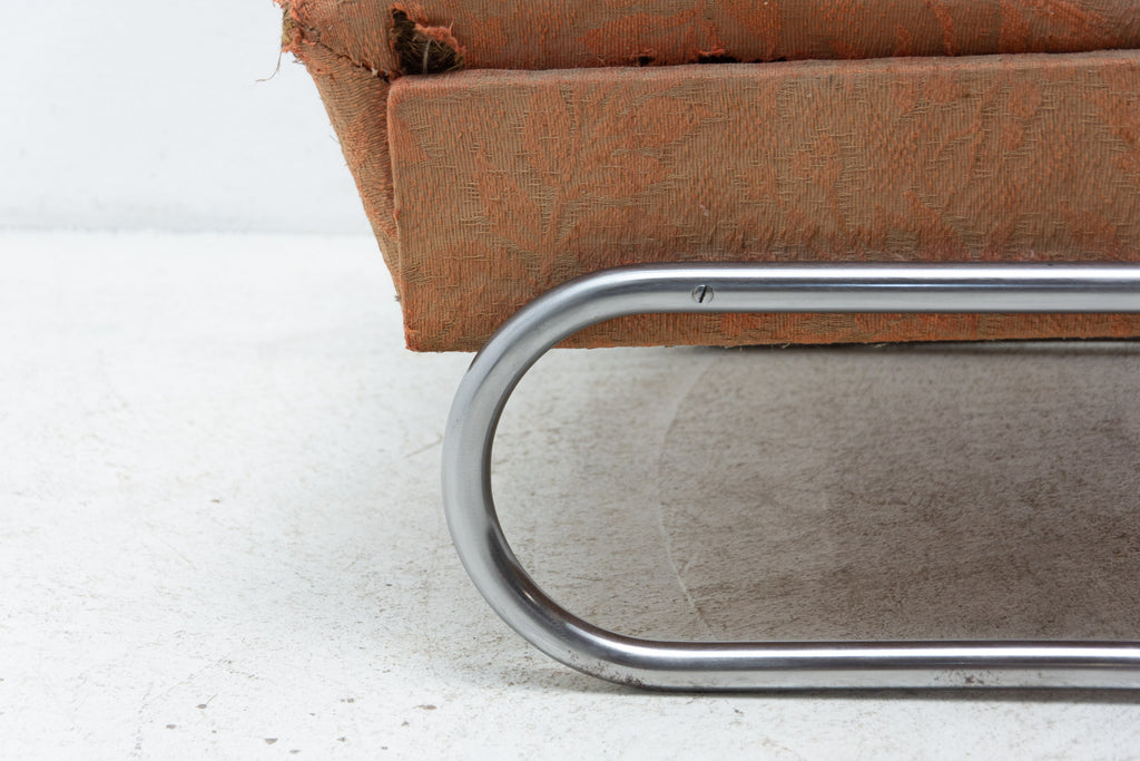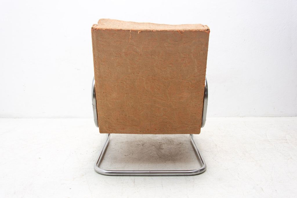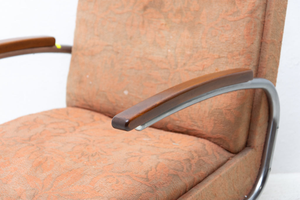 These armchairs was originally designed by W. H. Gispen in 1933 for Thonet. Then were produced under Thonet licence by Mucke Melder and Kovona Company in the Czechoslovakia. The armchairs are structurally in very good condition, expertly renovated metal frame, newly coated armrests lacquered with high gloss polyurethane. They needs a total reupholstery. If interested, we can provide at a price of 200 EUR per one piece.
