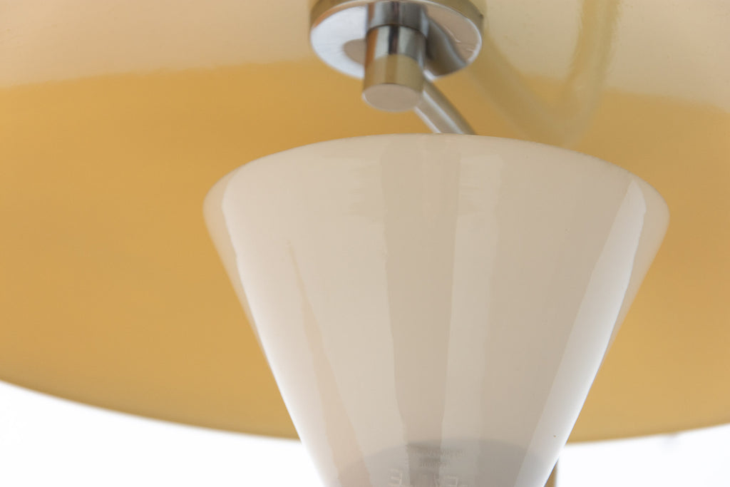 The lamp stands out for its extraordinary shapes typical of the Art Deco period and Bauhaus. It is switched on and off using the button located on the base. Overall, it is in very good condition.
