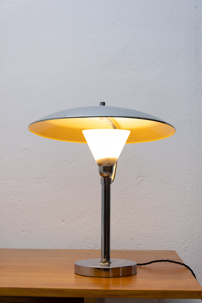 Beautiful midcentury chrome desk lamp with yellow glass shade and chrome construction. Made in the 1940´s in the former Czechoslovakia.