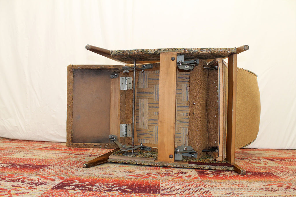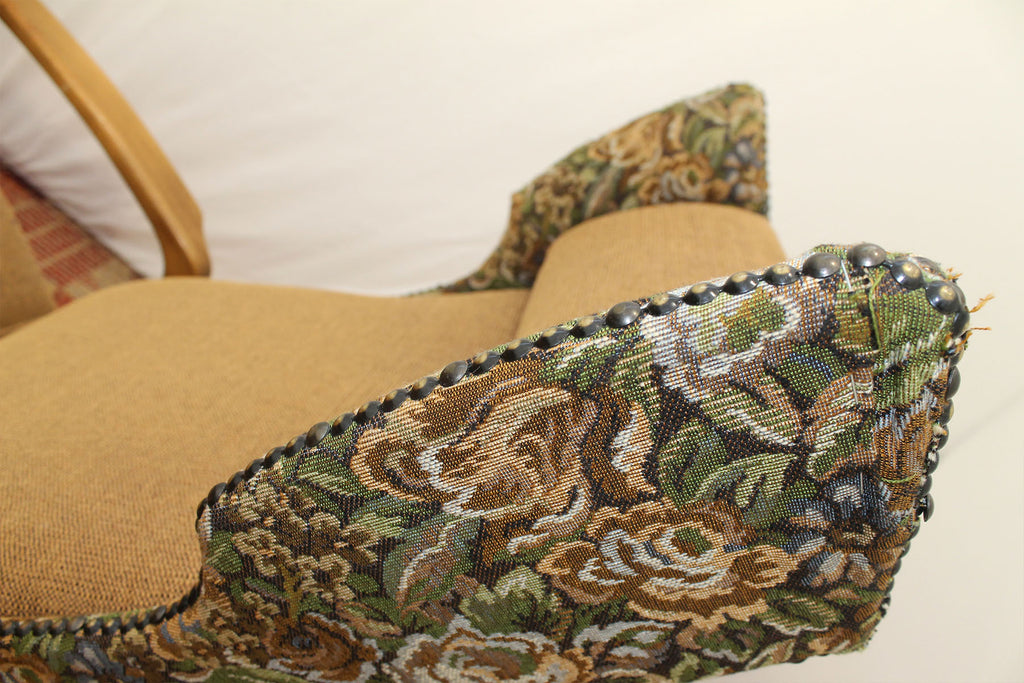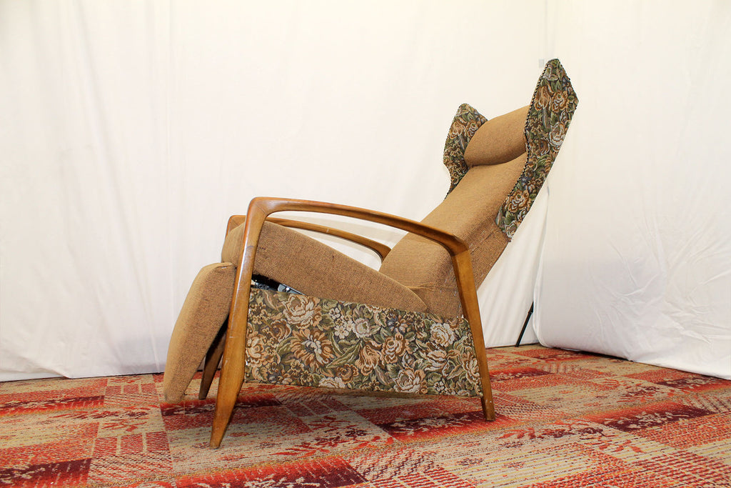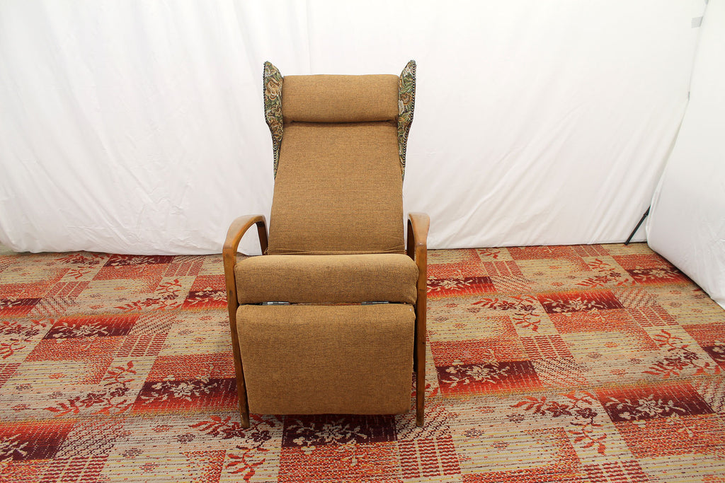 The chair is upholstered in fabric and the armrests are made of teak. The chair is very comfortable with a simple positioning system.