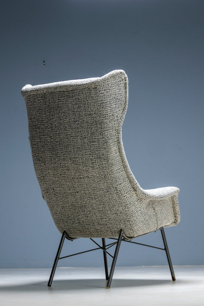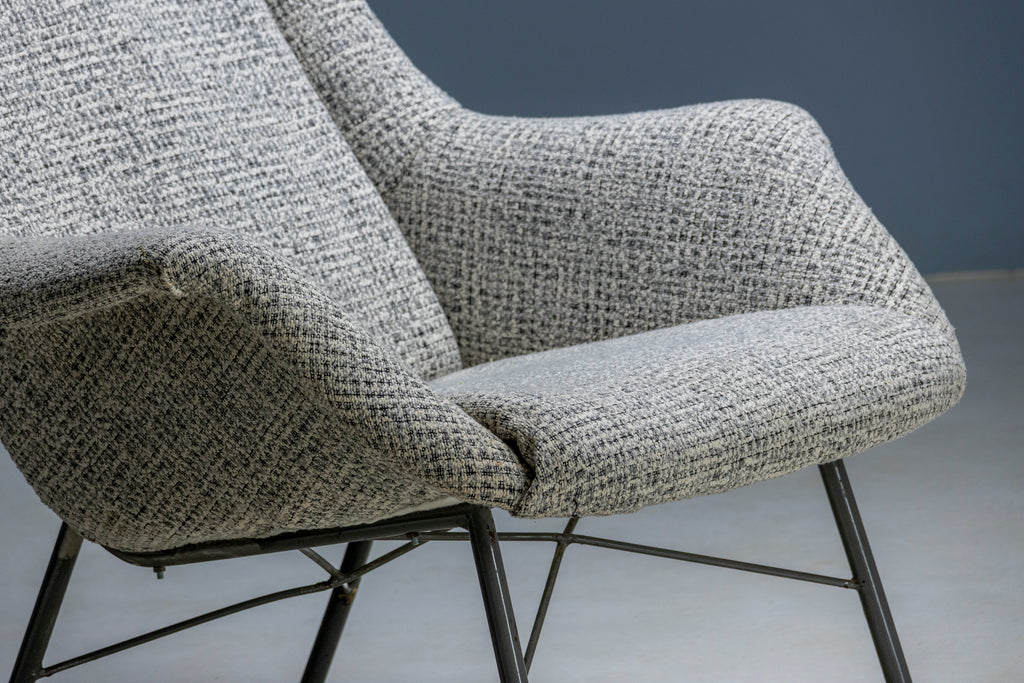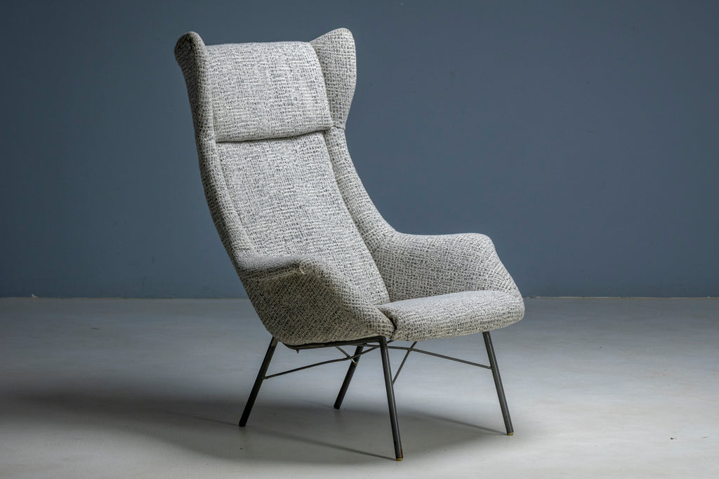 The chair features a molded fiberglass shell mounted on a slender metal frame, newly upholstered for renewed comfort. Its clean silhouette and practical form express Navrátil’s focus on ergonomics and simplicity. The piece has been professionally restored and is in excellent condition.