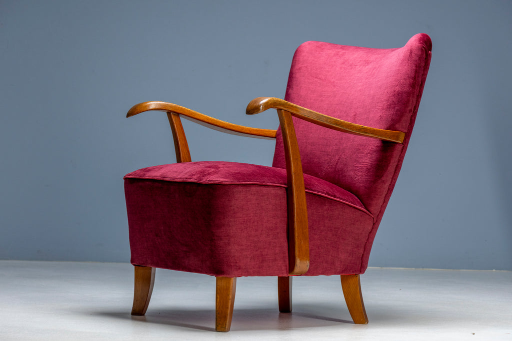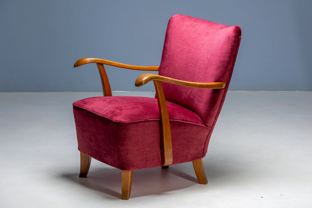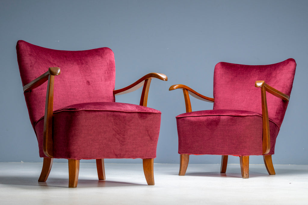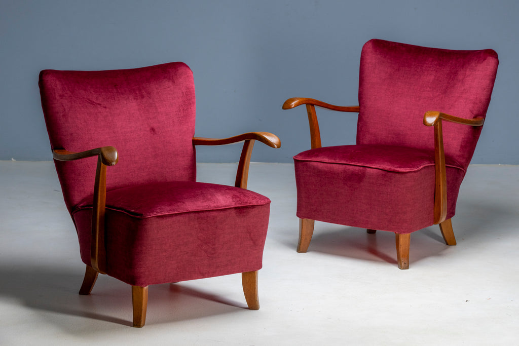 Each chair features a solid wooden frame with newly upholstered deep red velvet, offering both visual richness and comfort. The restoration preserved the integrity of the original structure while renewing the seating for modern use.