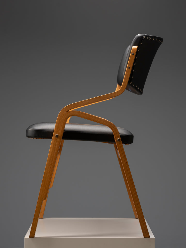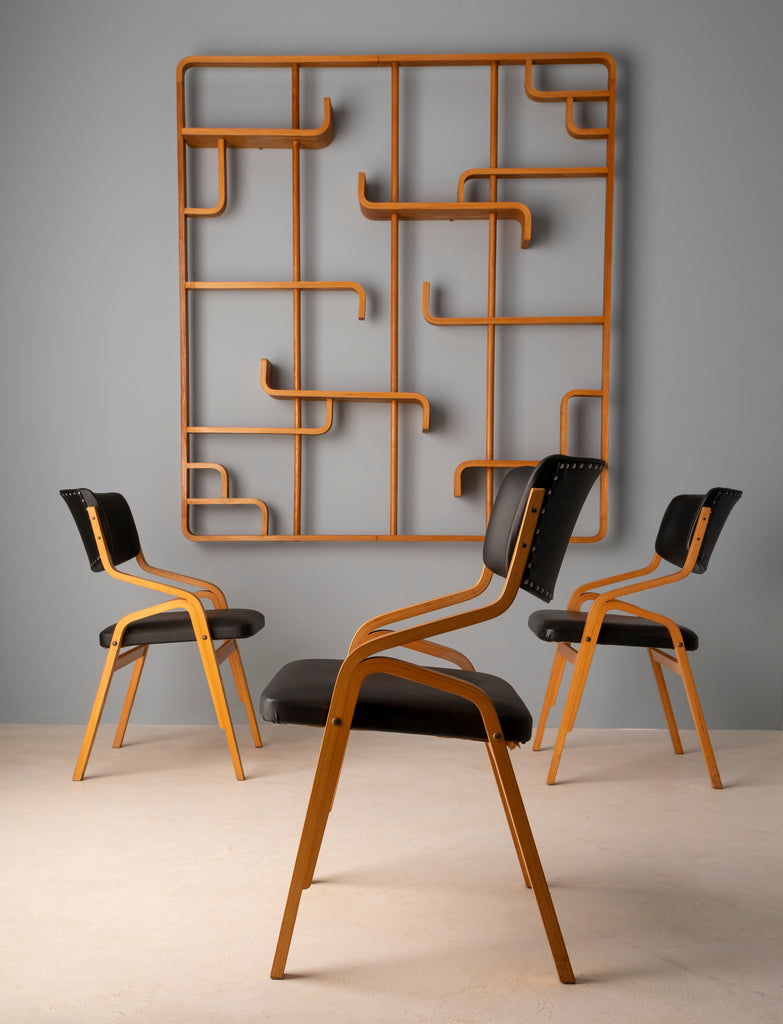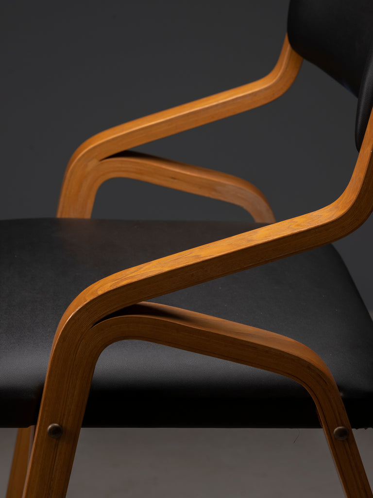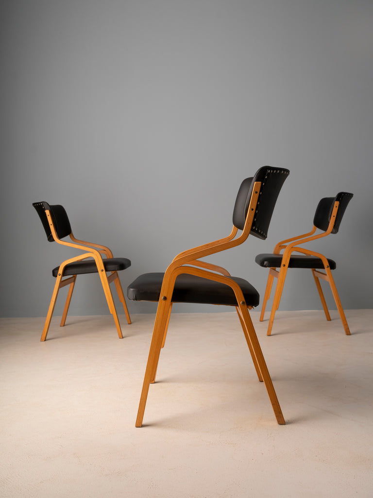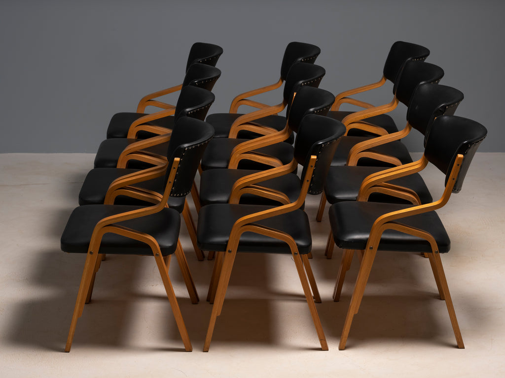 A set of twelve original vintage chairs designed by Ludvík Volák for the Dřevopodnik Holešov factory in Czechoslovakia during the 1960s–1970s. Each chair features a bent plywood structure veneered in beech wood with black finishes. The set remains in good original condition and is ready for use.