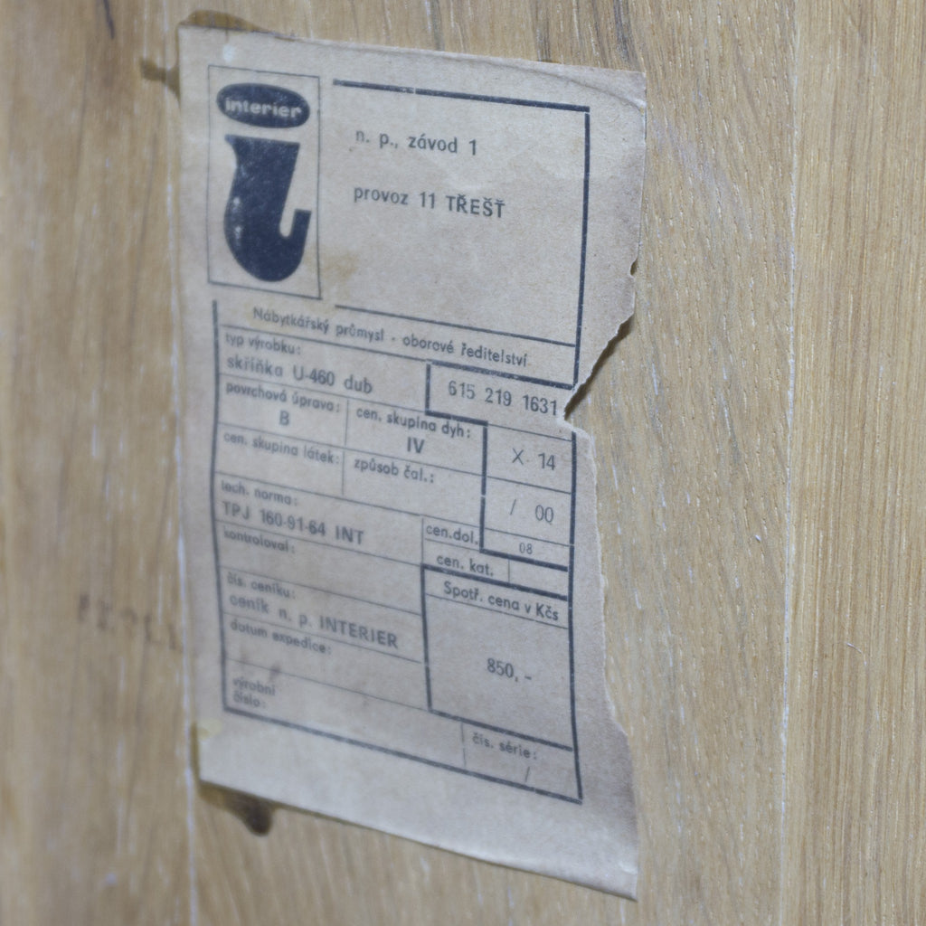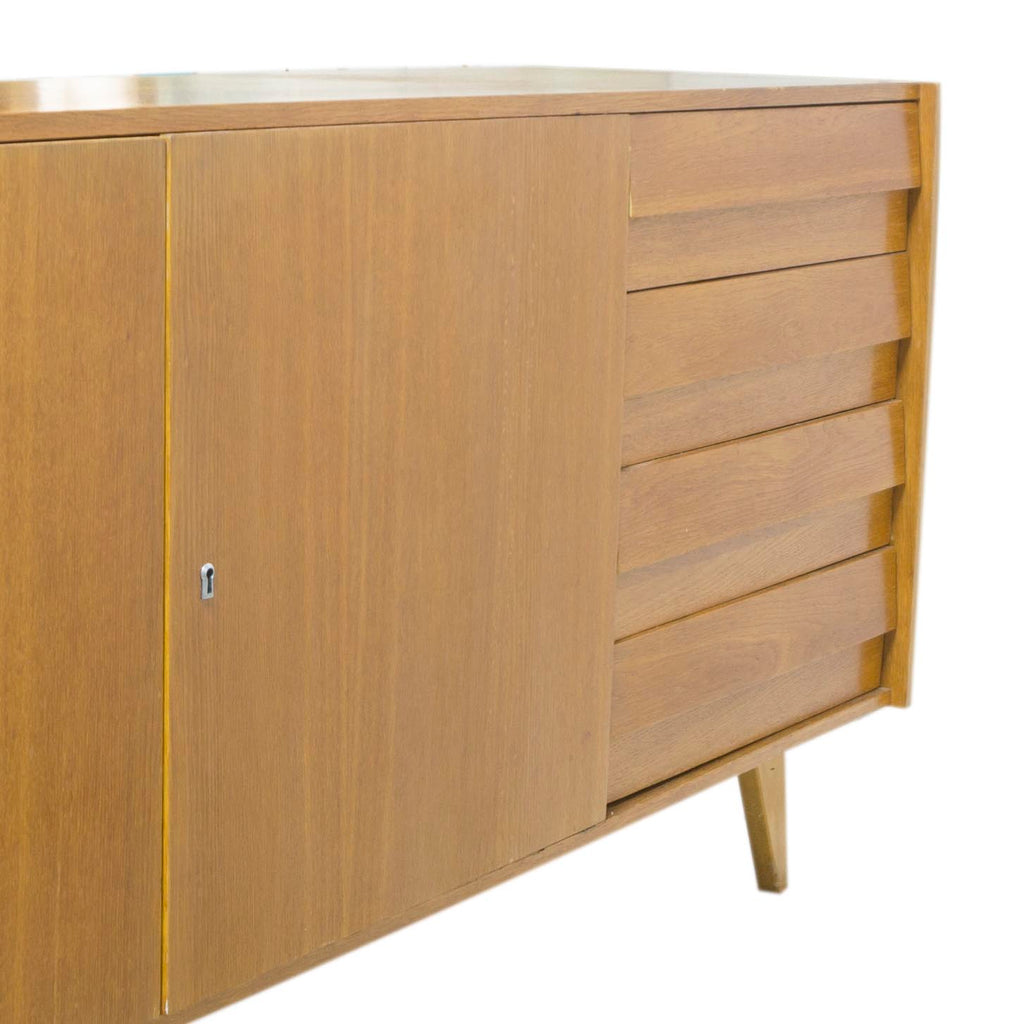 Cette commode U450 très recherchée a été conçue par Jiri Jiroutek et fabriquée en République tchèque par Interior Praha en 1960. Elle est en bois et présente des pieds fuselés. Elle possède quatre petits tiroirs et deux portes coulissantes aux placages assortis. Elle est en excellent état vintage.