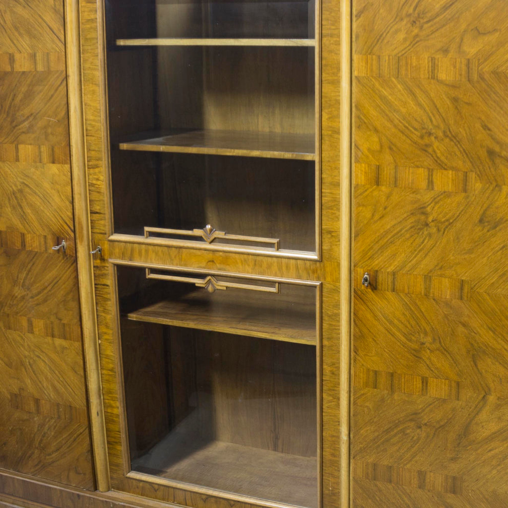 Bibliothèque ART DÉCO, Europe vers 1930, aux formes régulières, à la construction solide et aux deux pieds massifs sur lesquels repose la bibliothèque. Motifs intéressants en bois, placage de noyer poli. Très bel état de conservation. Voir les photos.