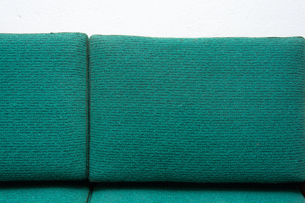 Ce canapé pliant a été conçu par le célèbre architecte tchécoslovaque Jindřich Halabala pour UP Závody dans les années 1950. Son design est à la fois élégant et simple. Sa structure est en bois massif plaqué chêne. Il est globalement en très bon état, avec de légères traces d'usure. Le revêtement est en très bon état d'origine, sans aucun dommage.