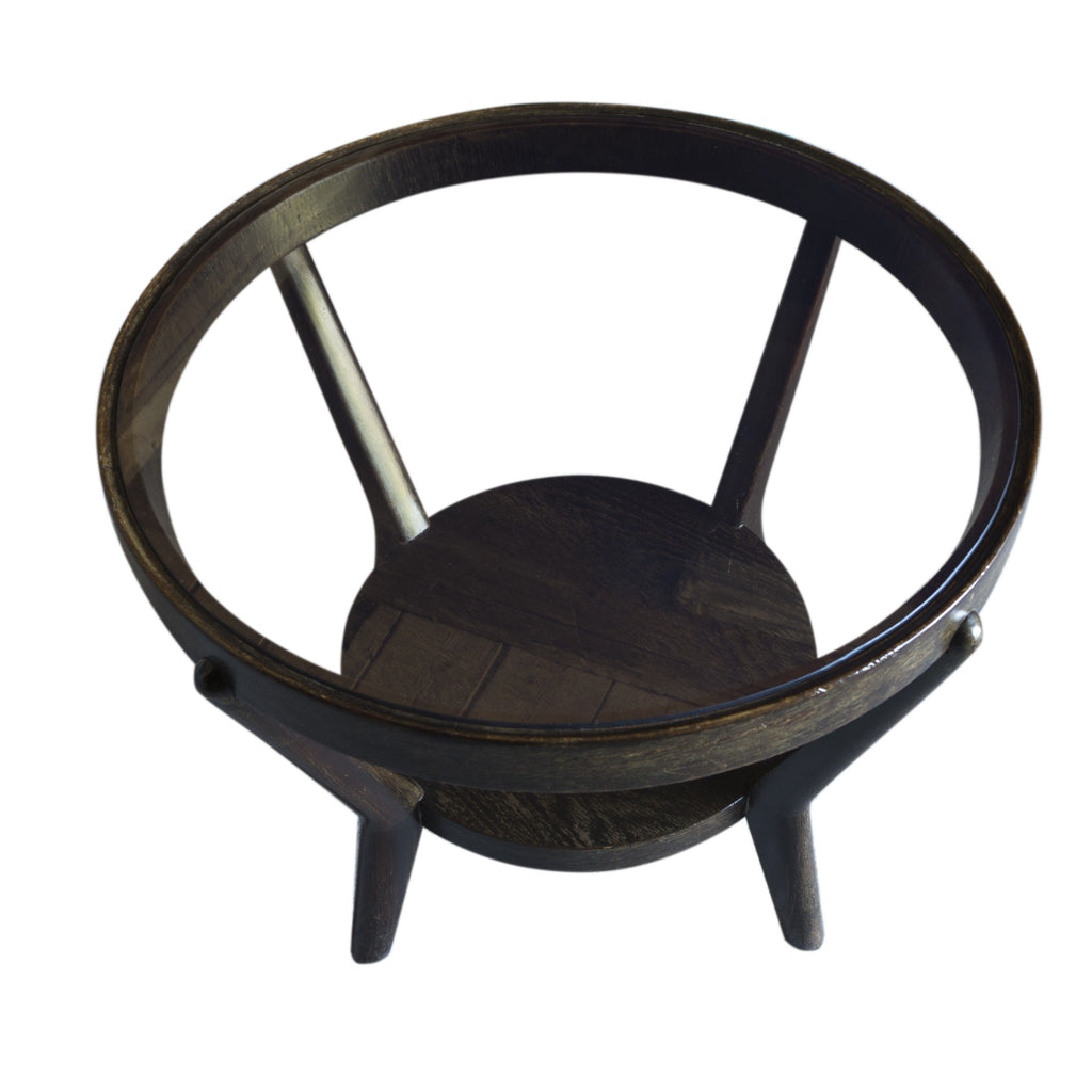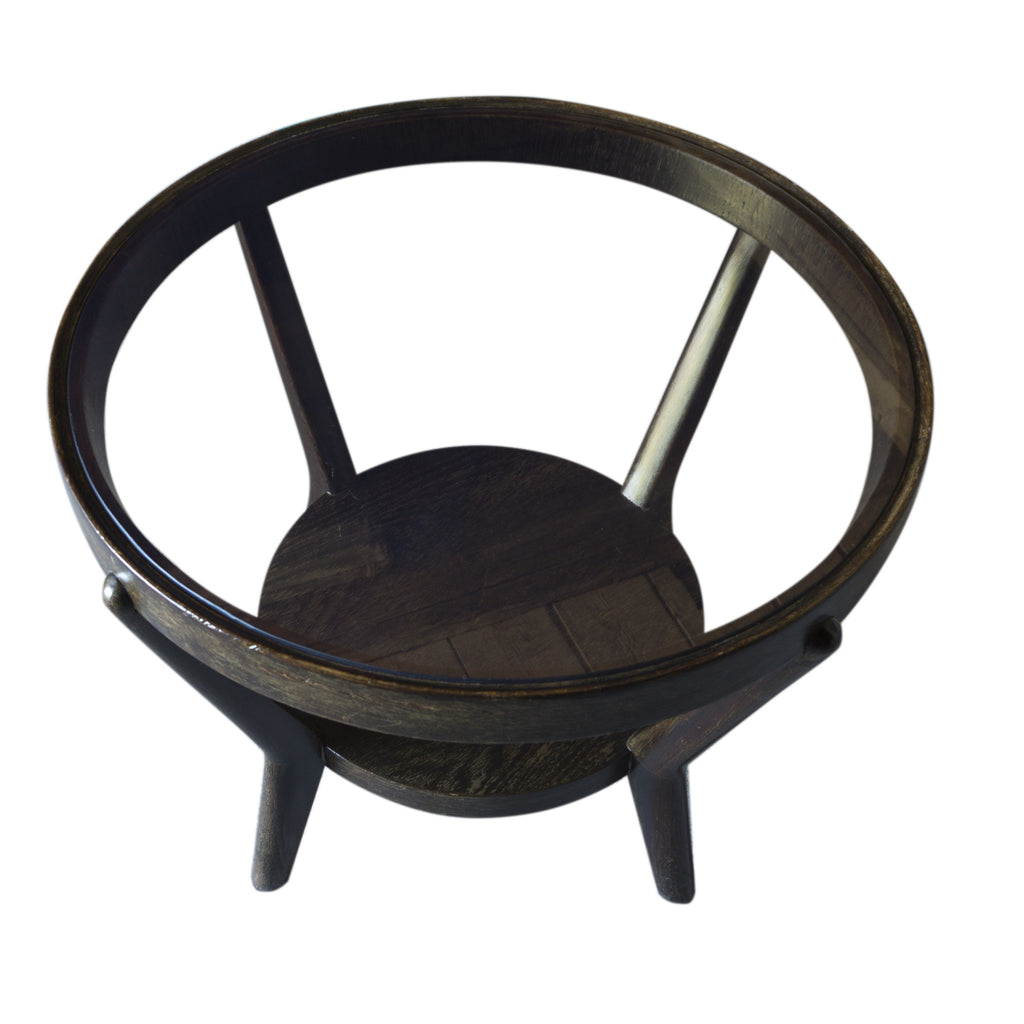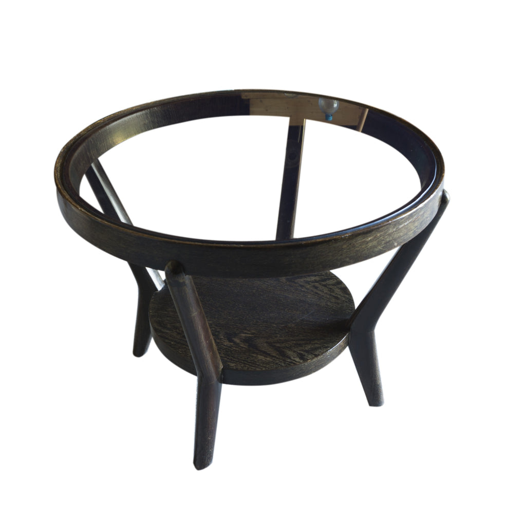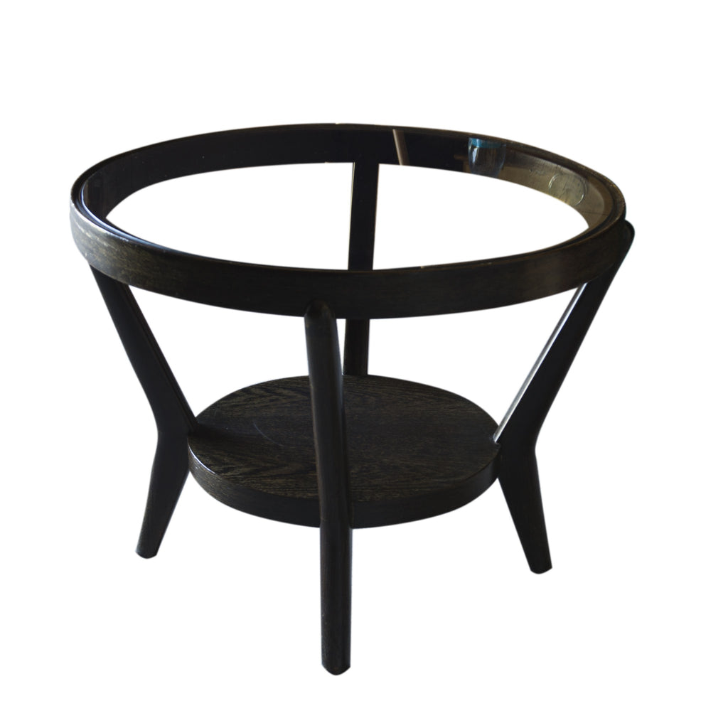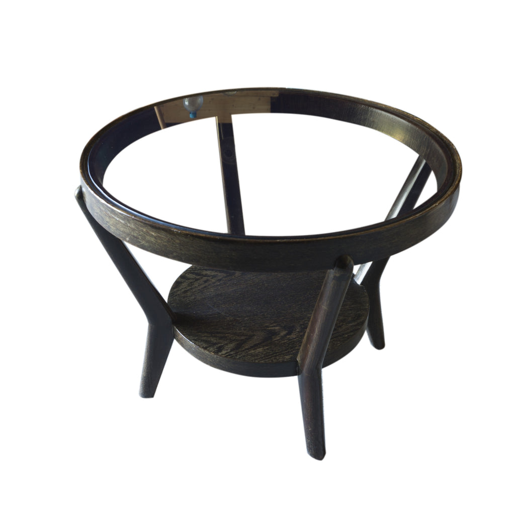 Table ronde vitrée conçue par les célèbres architectes Kropacek & Kozelka en 1944. Tchécoslovaquie. Elle peut servir de table basse ou d'appoint. Chêne massif. Couleur foncée. Très belle et élégante table ronde avec plateau en verre. Construction en très bon état. Le bord du plateau en verre est légèrement abîmé. Voir photos.